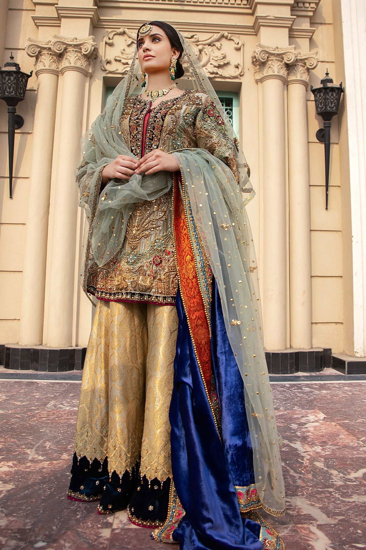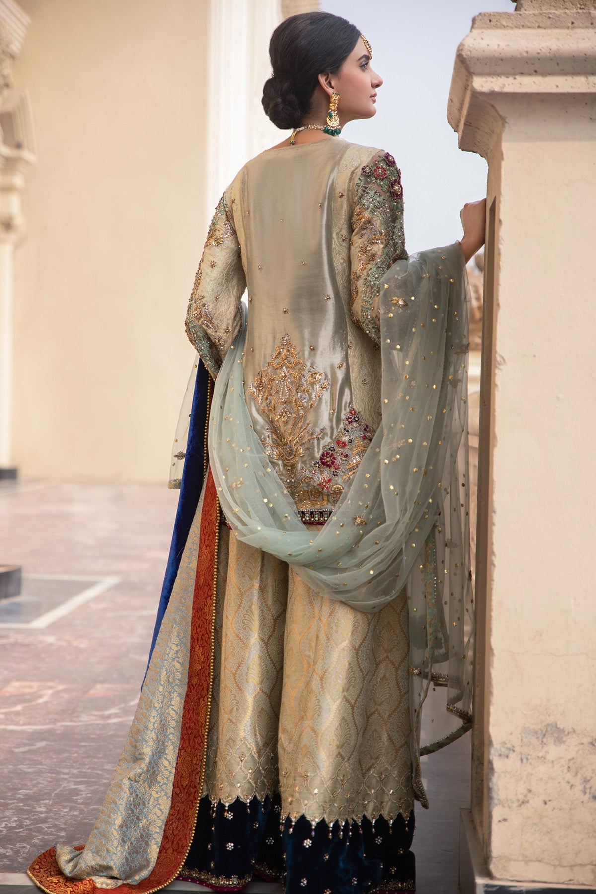 Tissue and Jamawar combined shirt which has intricate hand work along with 3D motifs paired with jamawar pleated sharara with velvet hem and danglings on it.