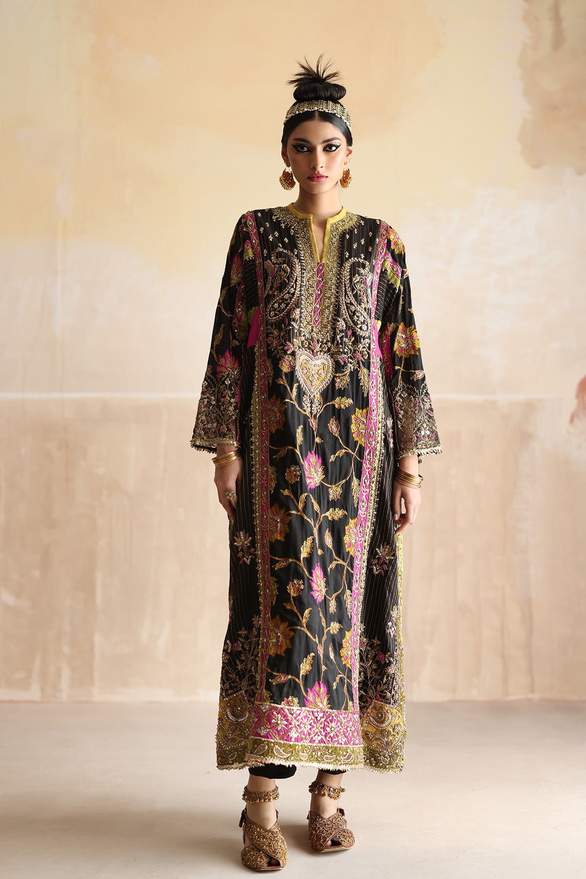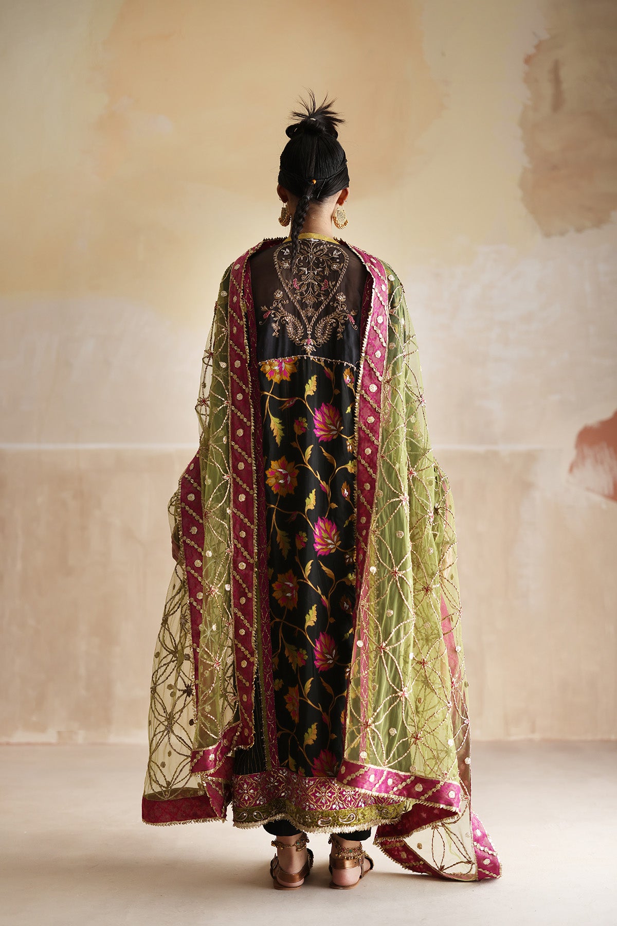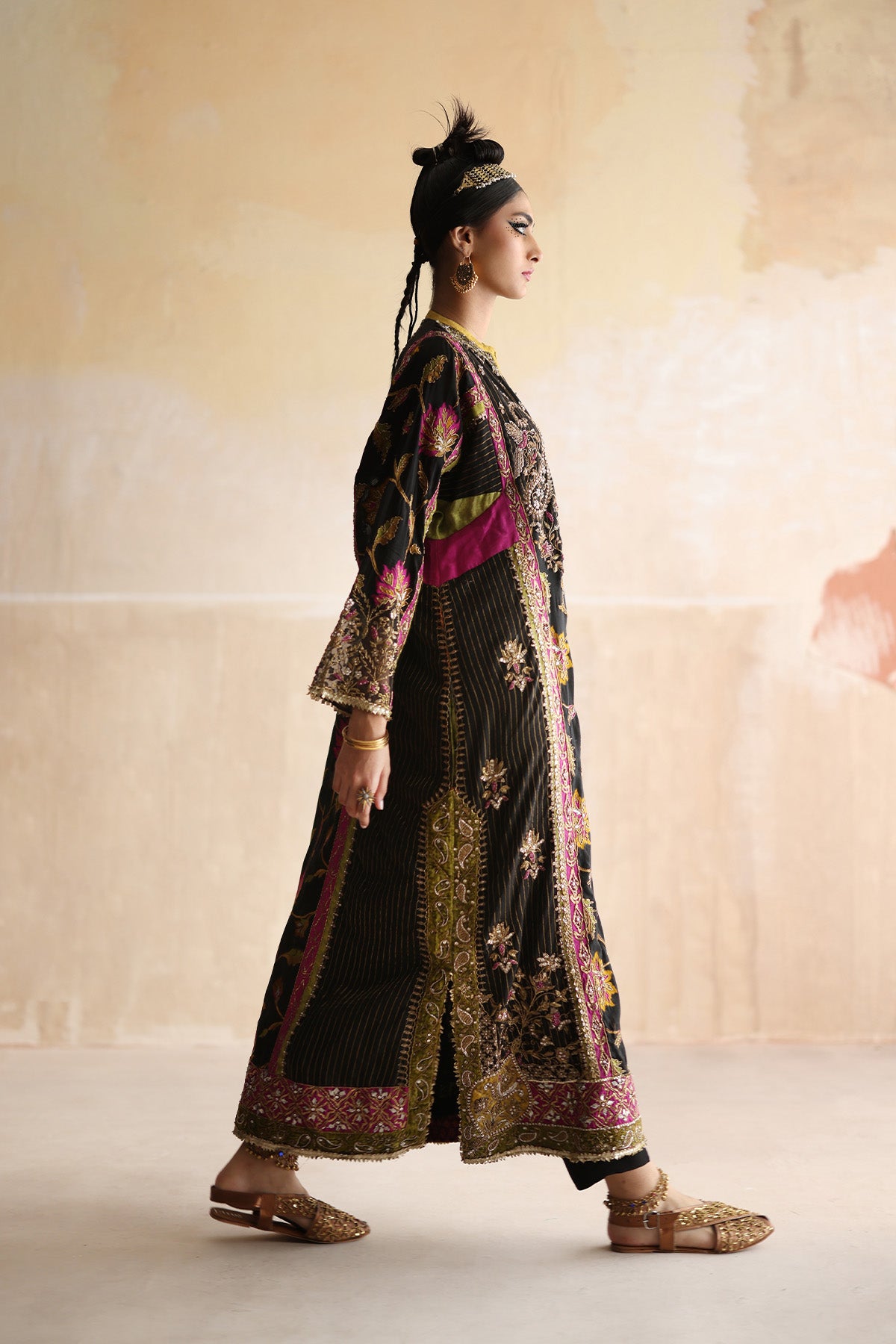 A blend of tradition and elegance in black jamawar! This kurta is a masterpiece, adorned with intricate zardozi work in silver and gold naqshi dabka, enhanced with delicate pearls. The hand-embellished booti on the side panels and raw silk border, detailed with pitta work and rich green velvet, add a luxurious touch. The organza insert at the back neckline, meticulously handworked, and the multi-colored gussets beautifully reflect traditional Uzbek kurta design. A true statement of timeless craftsmanship and cultural heritage. Note: Duppata price is not included