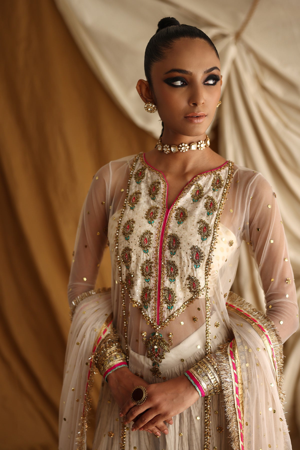 Step into timeless sophistication with this ivory net mukesh shirt, a masterpiece of craftsmanship. Featuring intricate handwork on a cotton net insert, the shirt is adorned with delicate adda booti and framed by elegant gotta borders. Vibrant ferozi and pink magzi details add a striking touch to the adda bail accents, enhancing its refined allure. Paired with a luxurious crushed raw silk sharara, finished with delicate gotta work, this ensemble beautifully merges traditional charm with modern elegance. Net mukesh gota work duppata with kiran on edges.