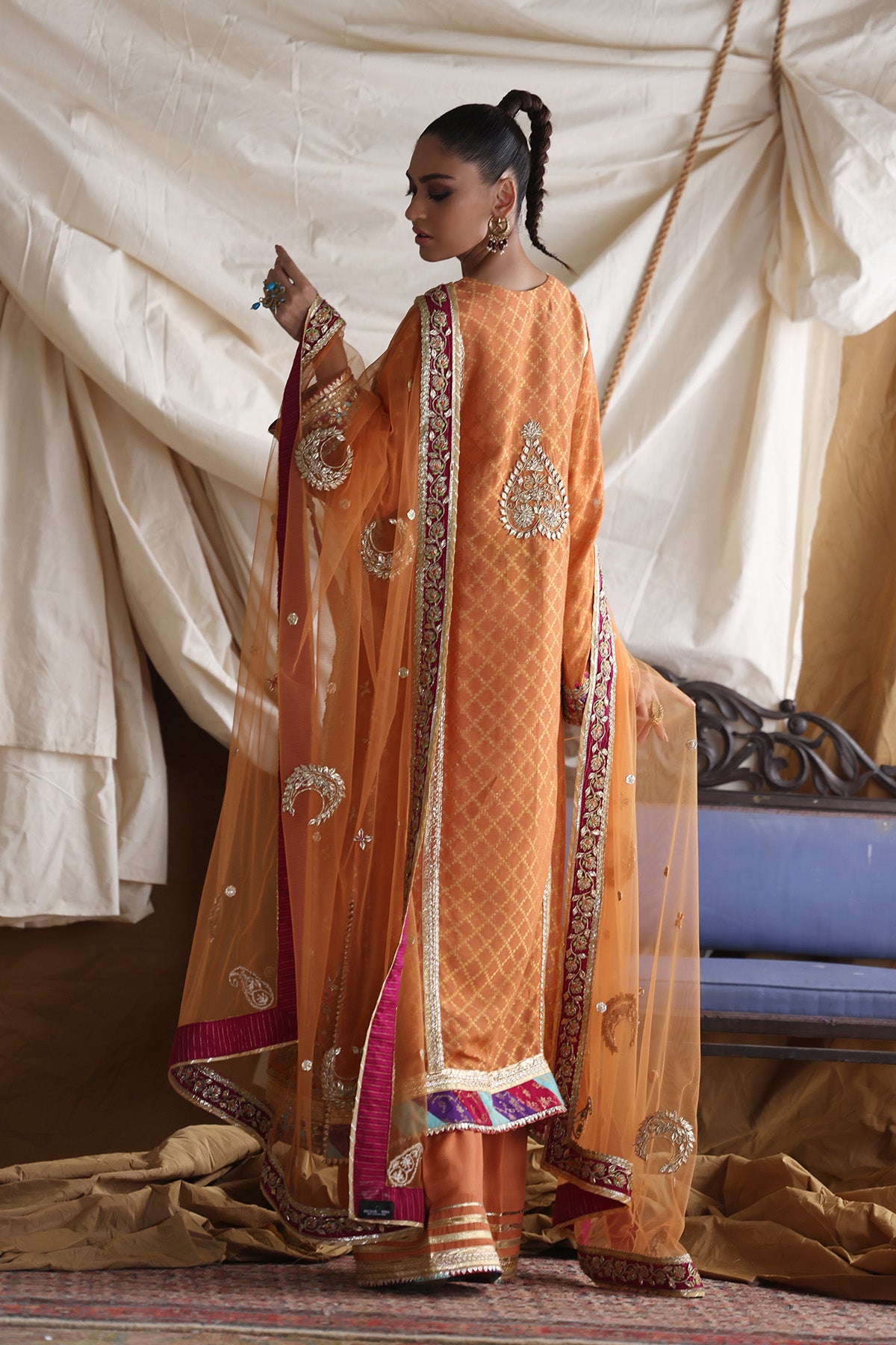 Radiate elegance in this vibrant orange ensemble, featuring a long zari woven jacquard kameez with full-length sleeves. Adorned with intricate gota work and Indian gota lapas tracing the panel lines, the kameez is beautifully enhanced with contrasting chatta patti detailing along the neckline, hem, and sleeves. Gota kingree accents add a touch of finesse to the edges. Paired with straight wide-legged silk pants, finished with Indian golden gota lapas at the hem, this outfit is a perfect blend of traditional charm and contemporary flair. Note: Duppata price is not included.