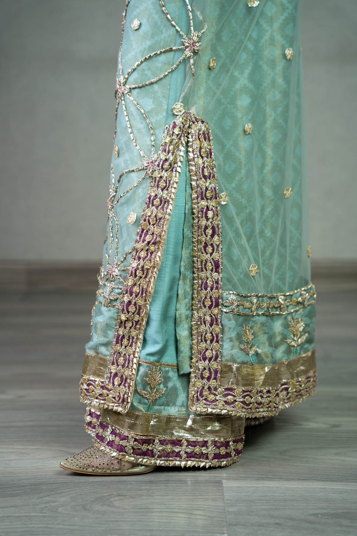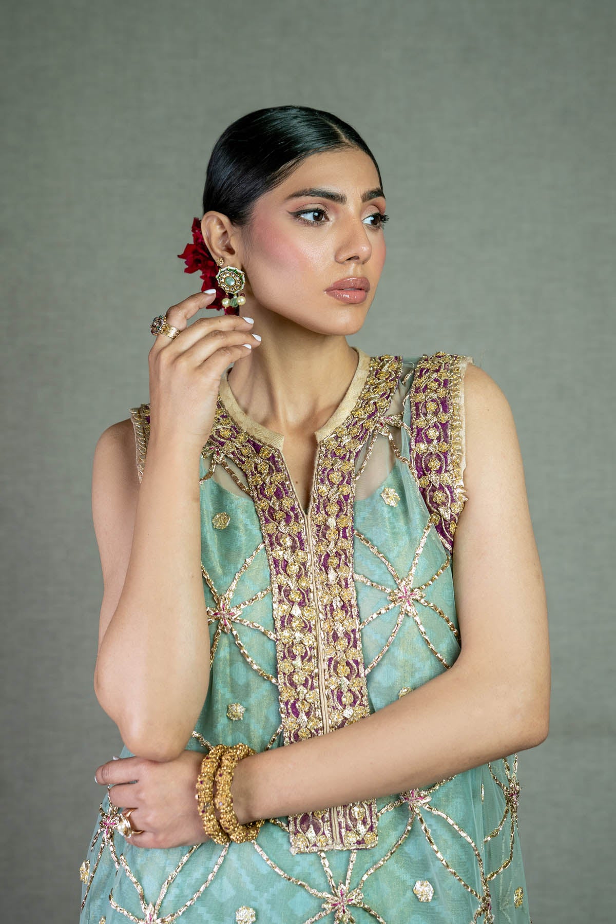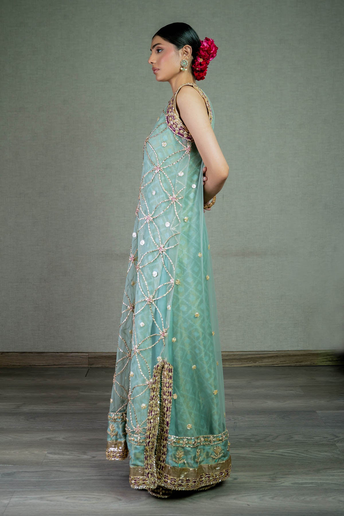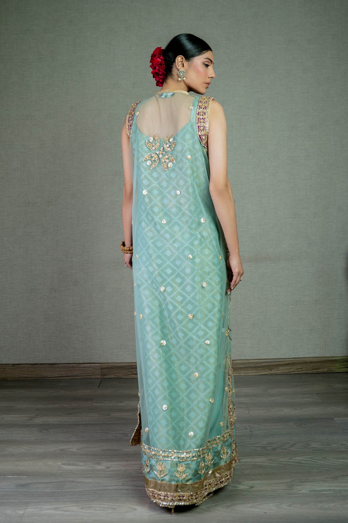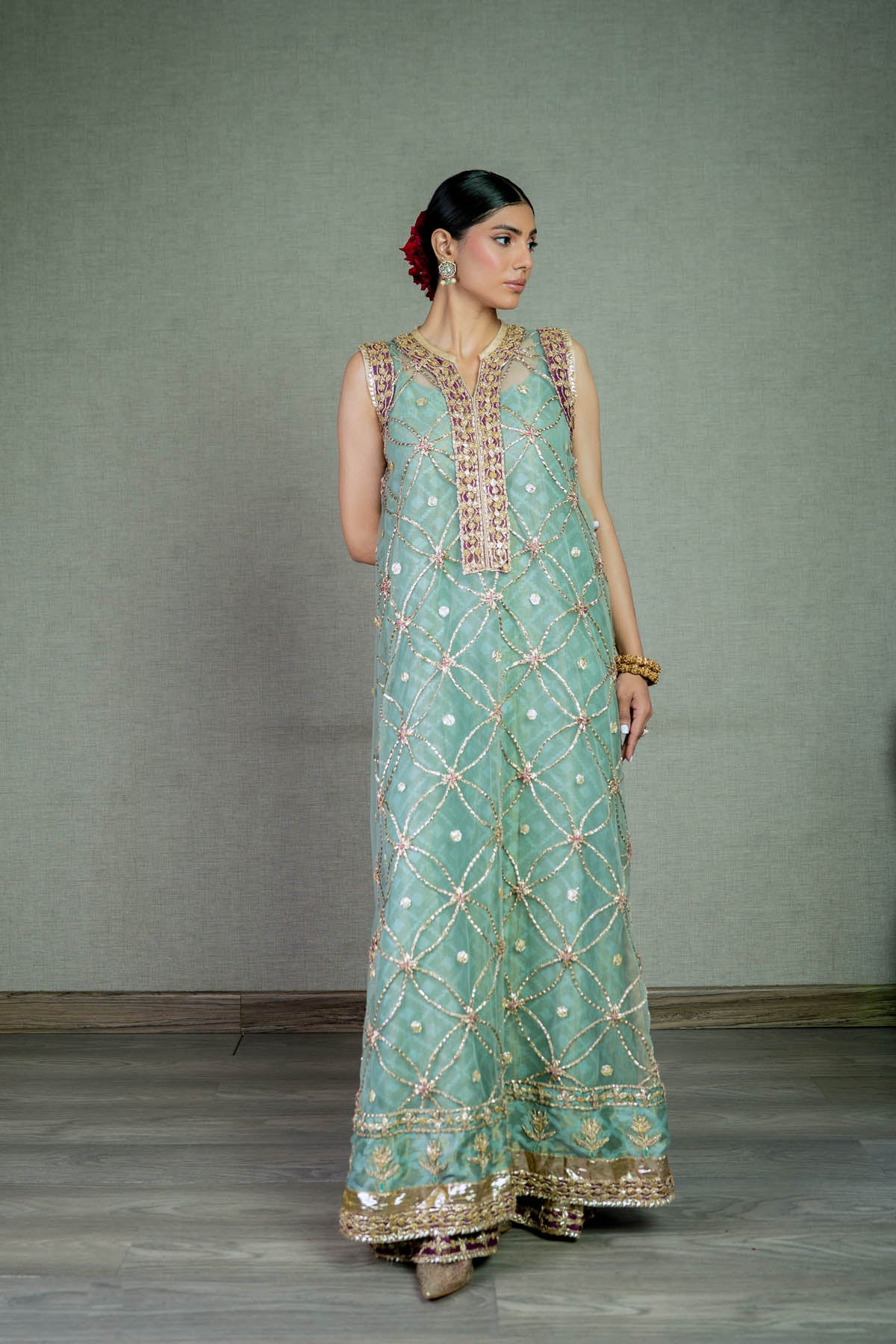 Make a bold statement in this stunning aqua ensemble, featuring a sheer net A-line sleeveless kameez with a delicate spaghetti strap inner slip. Adorned with a striking gota jaal, the kameez is enhanced by contrasting zari woven jacquard borders embellished with intricate gota and resham embroidery. The neckline, armholes, and hems are elegantly finished with Indian lapas and golden gota kingrees, adding a touch of regal charm. Paired with straight wide-legged silk trousers, this outfit is the perfect blend of modern sophistication and timeless tradition.