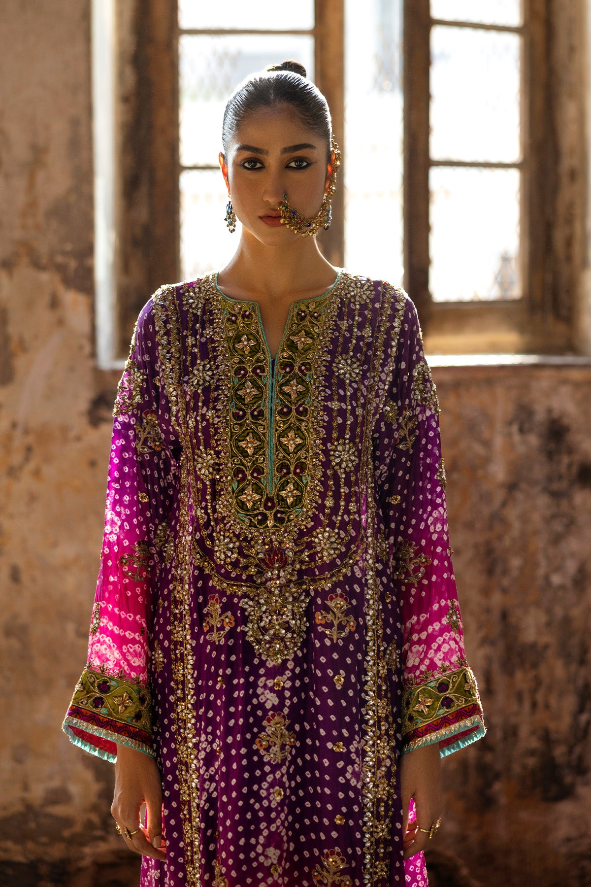 Embrace the fusion of tradition and modernity with this exquisite long chunri shirt, shaded beautifully from deep purple to lime green. Inspired by the allure of jewels, the neckline is adorned with intricate stonework, while resham borders on rich velvet add a luxurious touch to this vibrant silhouette. Paired with a matching 3-shaded chunri dupatta featuring delicate gota work and jamavar finishings, and silk pants with an embroidered velvet border finished in gota.