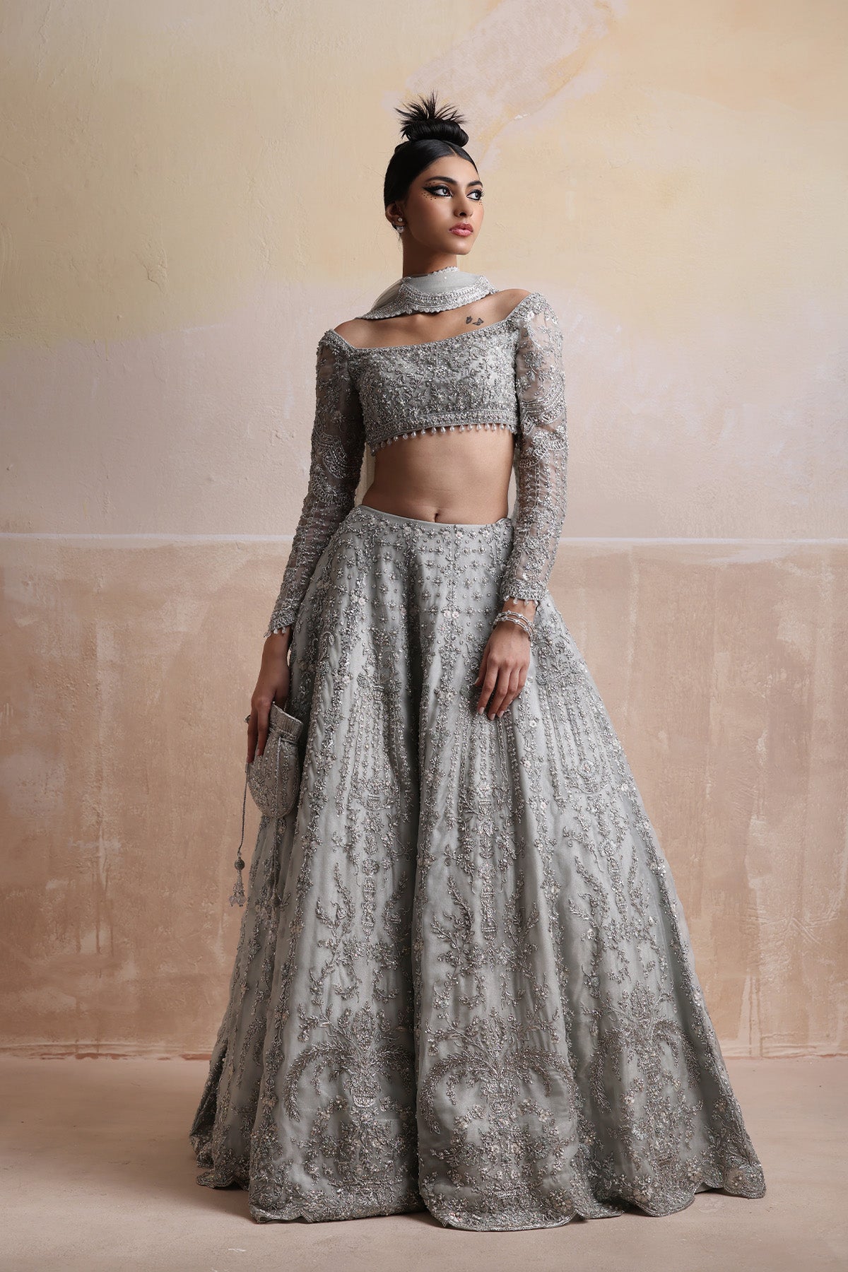 A vision of elegance in ice grey! The blouse dazzles with a sophisticated squared neckline, adorned with silver dabka, naqshi, crystals, stones, and pearls, while cascading crystal hangings at the waist add a touch of opulence. Paired with a meticulously crafted lehenga featuring intricate silver handwork and white resham embroidery, it glows with an ethereal shimmer. The ensemble is completed by a pure net dupatta, draped gracefully with heavily embellished scalloped borders and delicate crystal hangings for the perfect finishing touch. A timeless blend of grace and glamour.