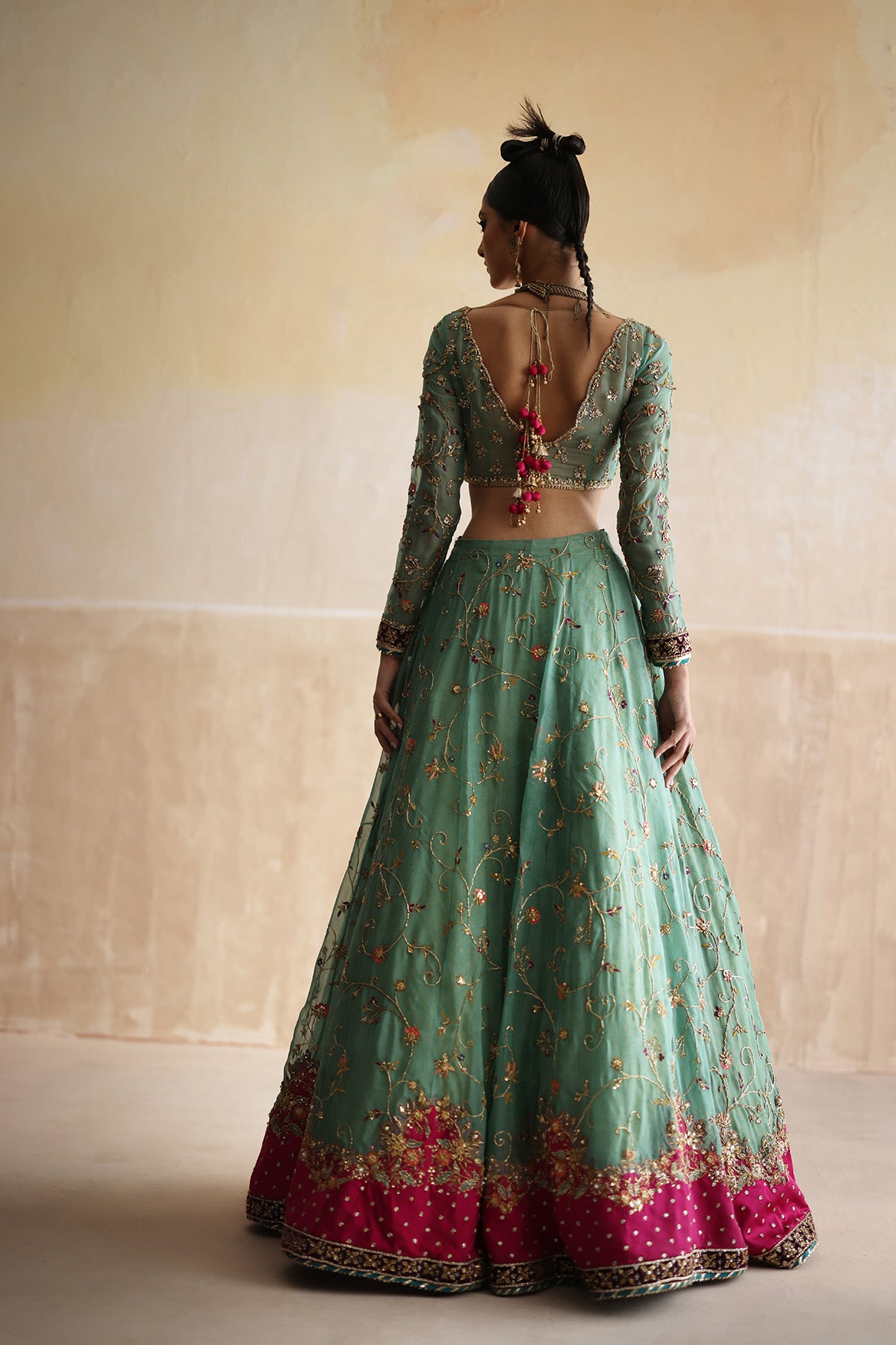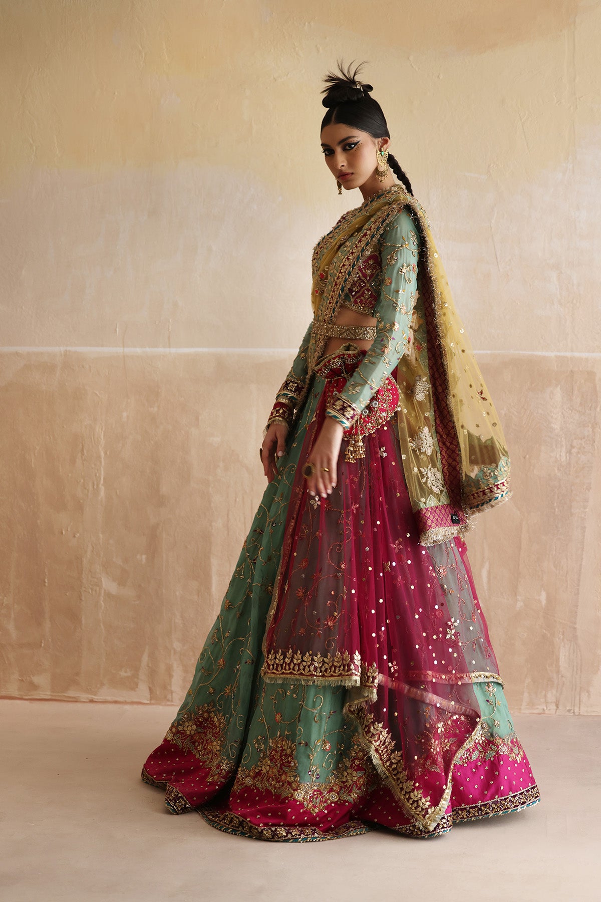A masterpiece of vibrant elegance! The blouse, crafted from luxurious multi-colored organza, features a sophisticated V-neckline and sea green sleeves adorned with intricate zardozi work in resham, gold dabka, and crystals, creating a stunning interplay of textures. The sea green organza lehenga flows gracefully, embellished with rich zardozi work, gold dabka, naqshi, sequins, and resham embroidery. A bold hot pink satin silk border, crystal accents, and pure gold gotta work on velvet elevate its opulence. Paired with a striking yellow net dupatta with colorful borders, delicate gotta, and sequins, this ensemble is a celebration of regal charm. Note: Hot Pink duppata and belt is not included in price