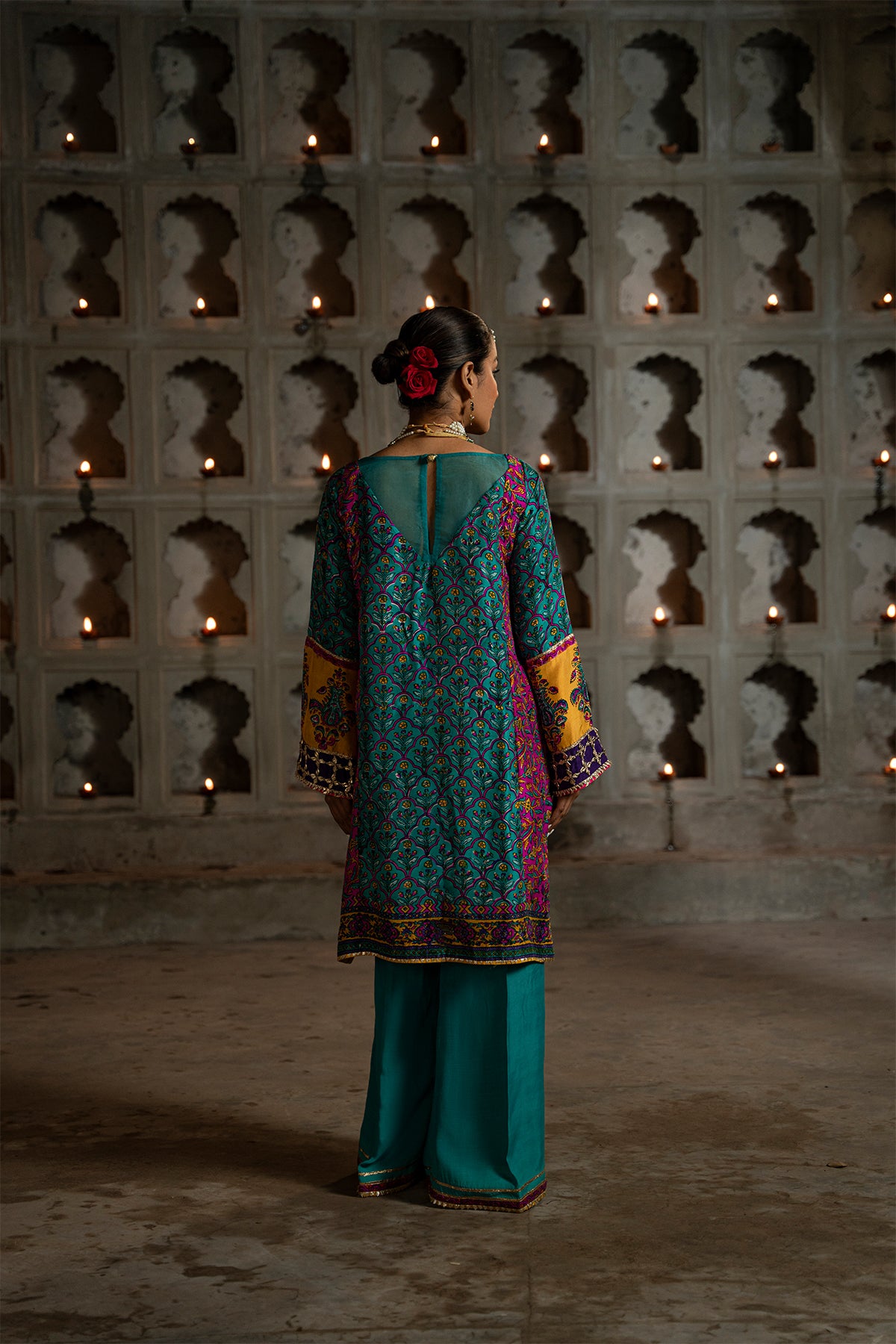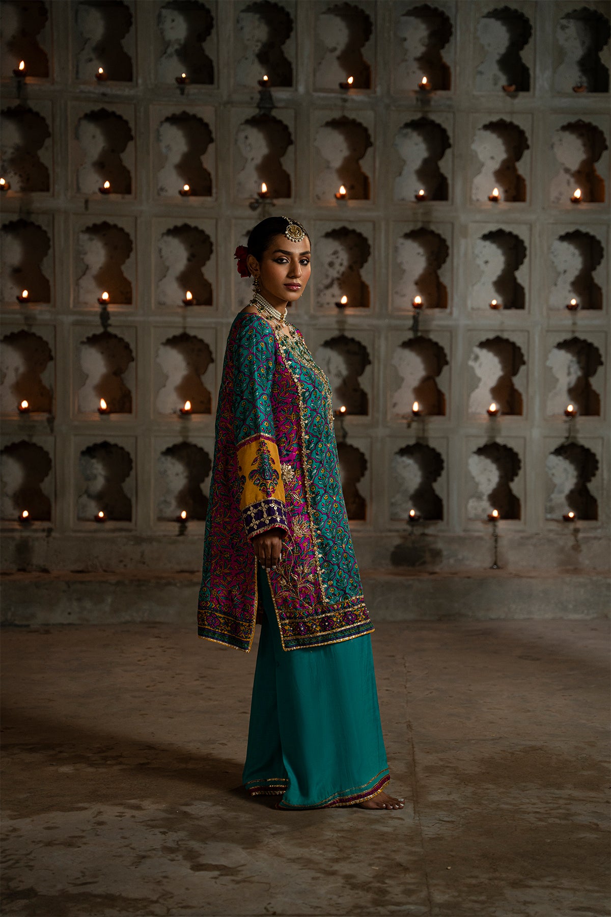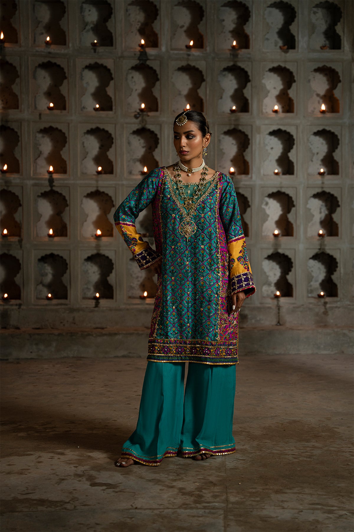 Elevate your elegance with this mesmerizing short turquoise green kurta, adorned with intricate embellishments and delicate gota work. Its charm is heightened by the organza patches on the neckline, adding a touch of grace. Finished with regal gold kingree and chatta patti. Paired flawlessly with pure silk pants.