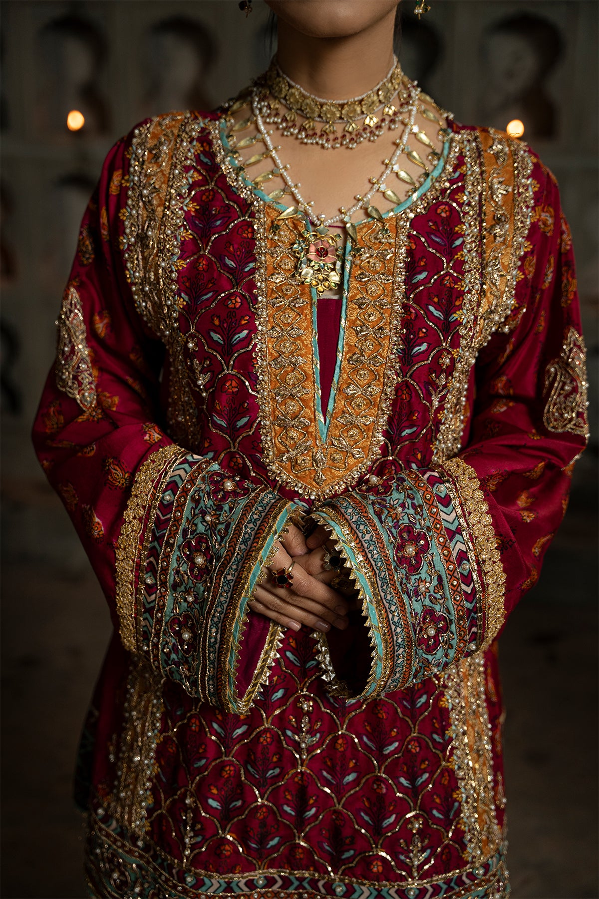 Set the stage for elegance with this vibrant ensemble: a short red mustard block printed shirt, exquisitely crafted with mustard jamawar inserts and delicate gota work. The focal point, a single-sided bail, intricately rendered with tilla and blue resham, adorned with the artistry of naqshi tilla, dabka, and pearls. Finished with regal kingree. Paired with wide-leg silk pants. Note: Duppta price is not included