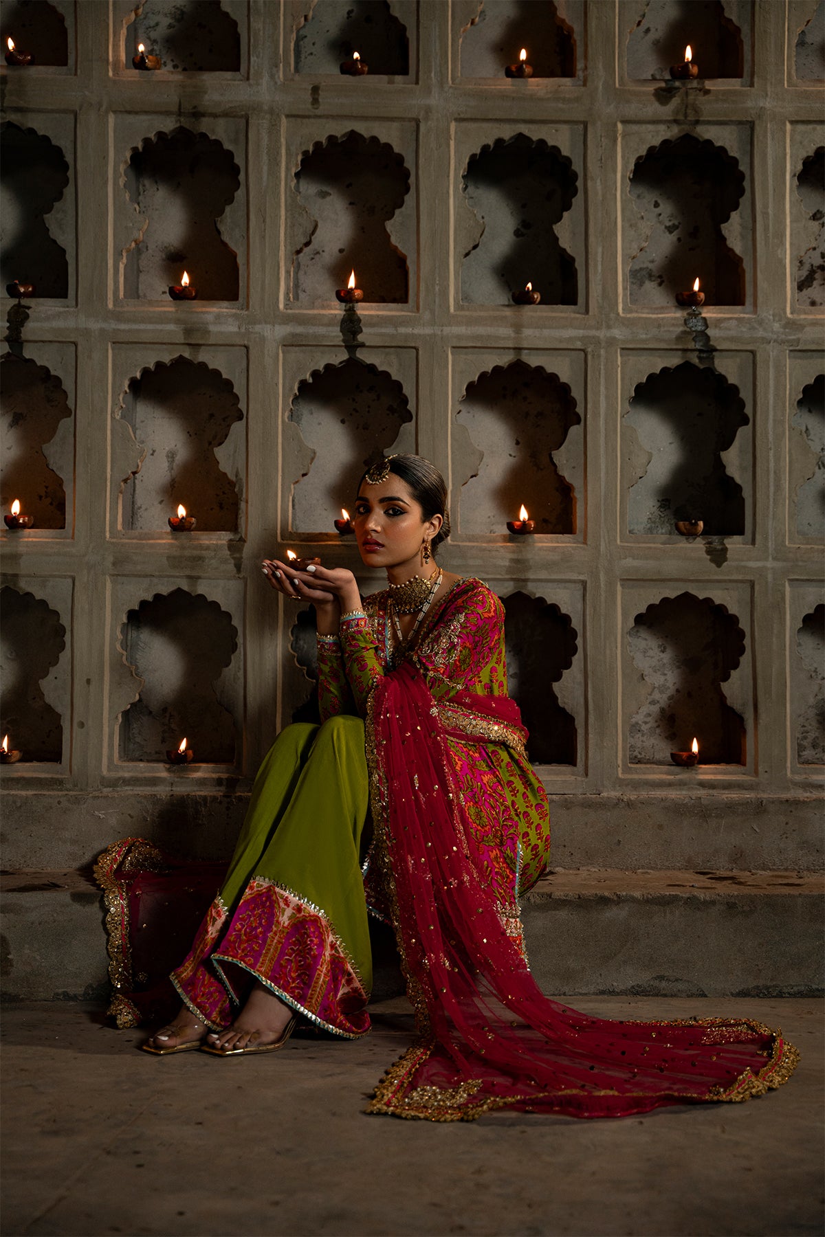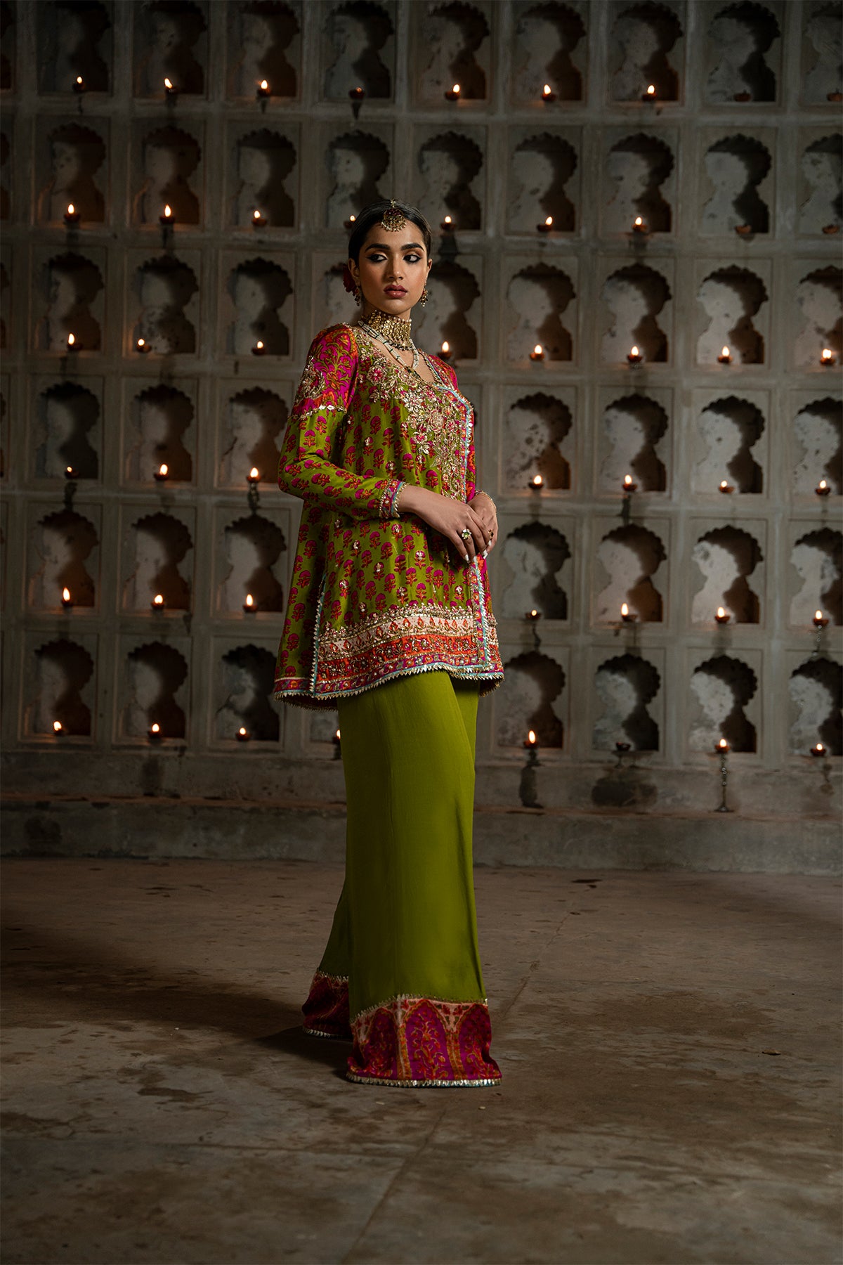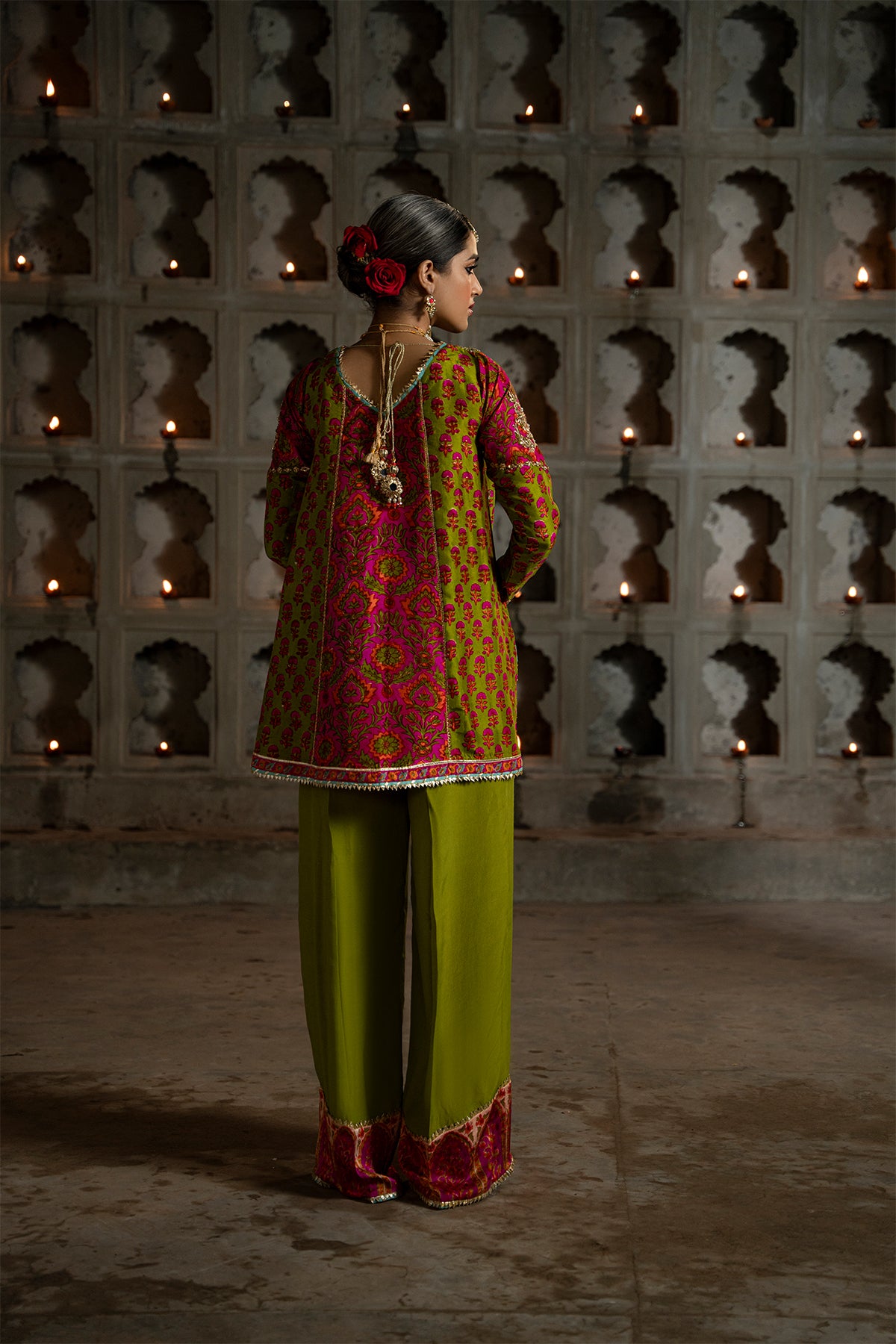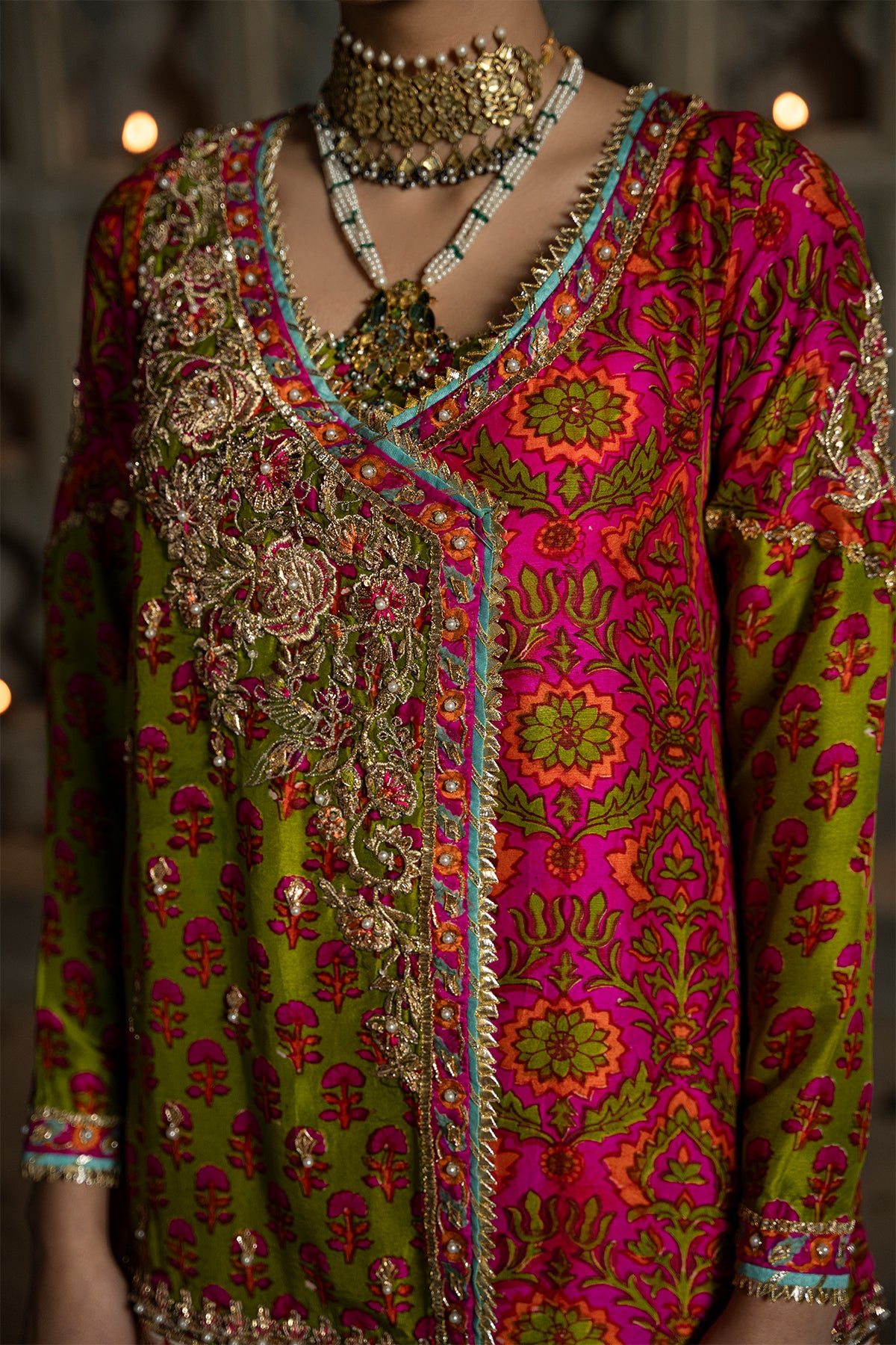 Embrace the fusion of elegance and tradition with this captivating short angrakha, blending the enchanting hues of olive green and magenta pink. Adorned with intricate hand block prints and embellished with exquisite gota work, resham dabka, and naqshi detailing, each stitch is a testament to timeless craftsmanship. Enhanced further with contrasting ferozi patti, it's a symphony of color and contrast. Paired effortlessly with green silk pants.