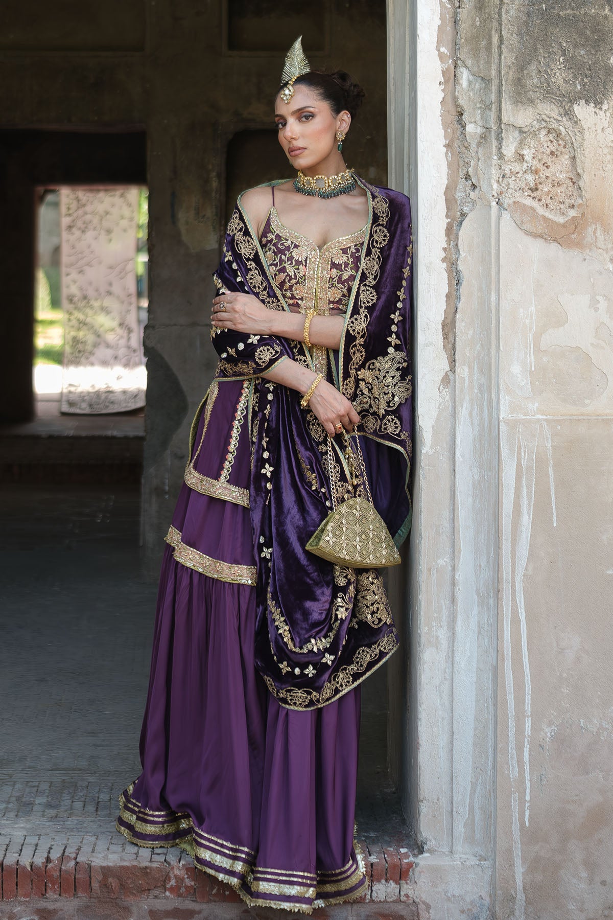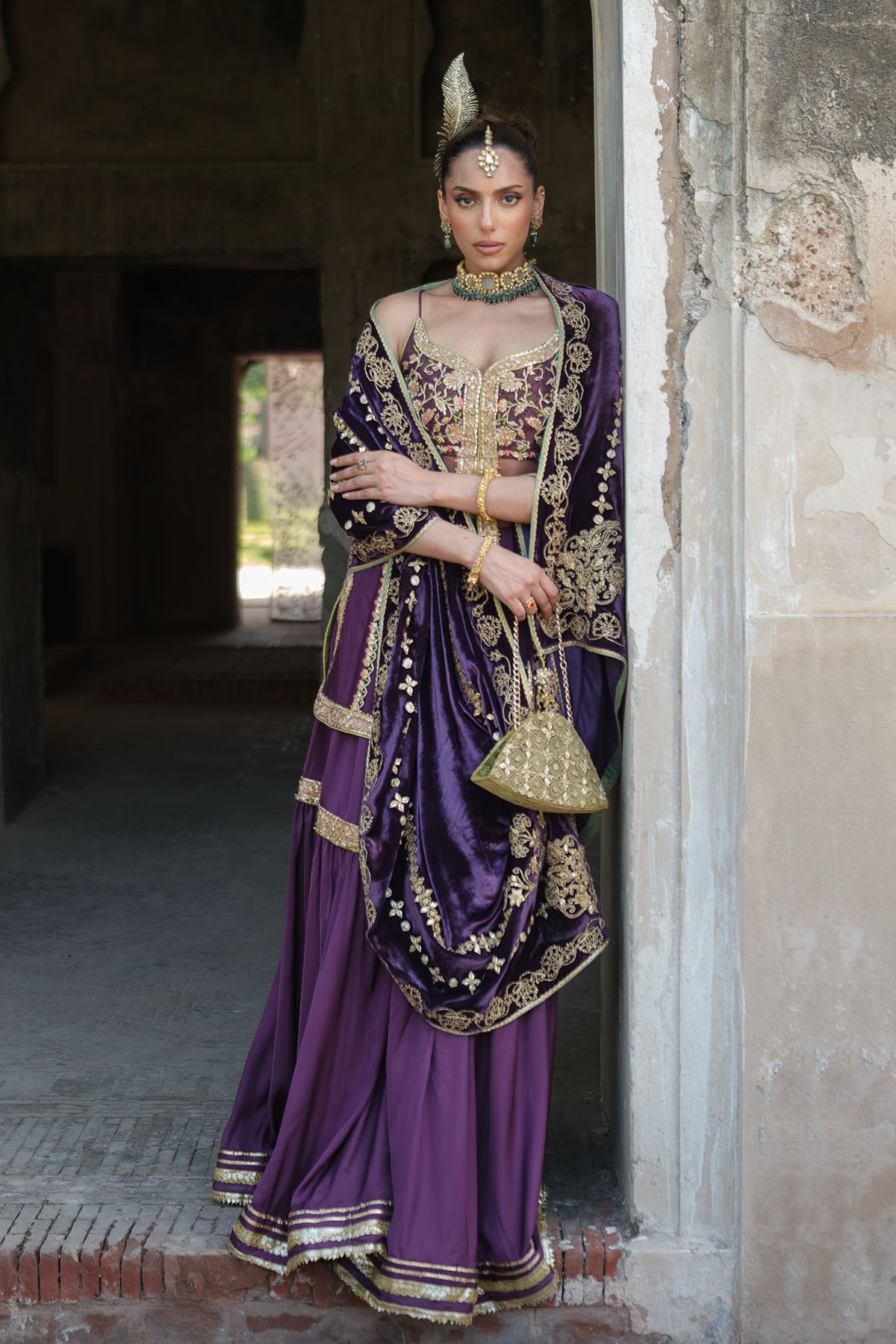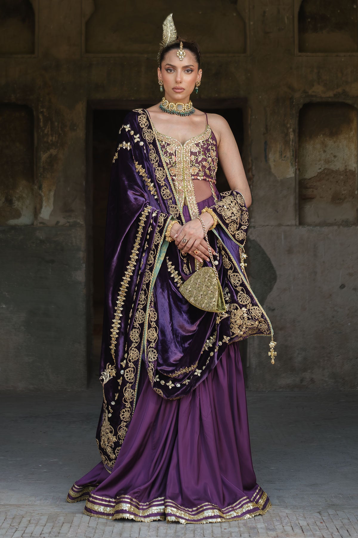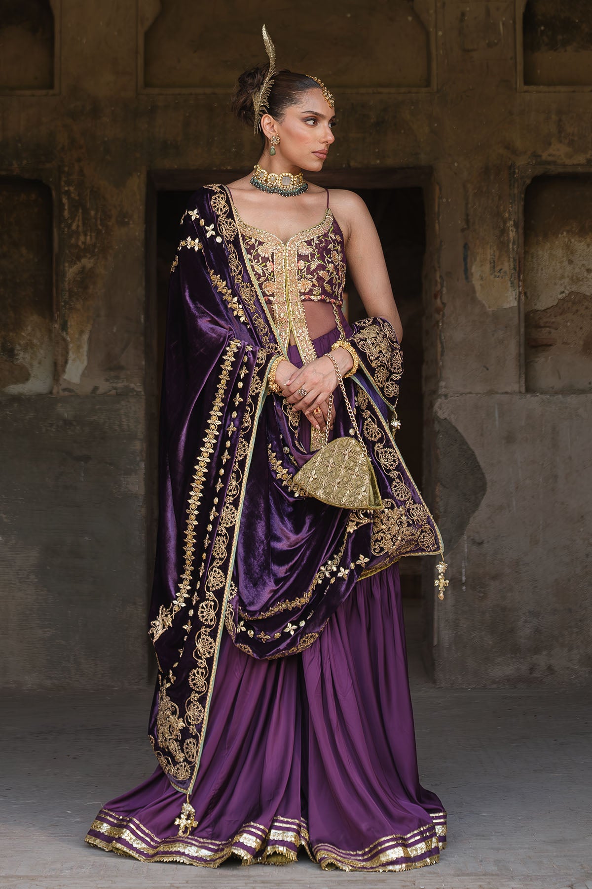 Intricate gota work decorates the attire, with floral motifs and running patterns embellishing the bodice accentuated by silk thread embroidery in contrasting tones to enhance its depth and texture. The borders in gota work trace the lengths of the panels and side seams, finely highlighted throughout the design. The gharara is accentuated with a gota border in its seam and highlighted with accents of gold at the hem adding a regal look to the silhouette. NOTE: Duppata price is not included.