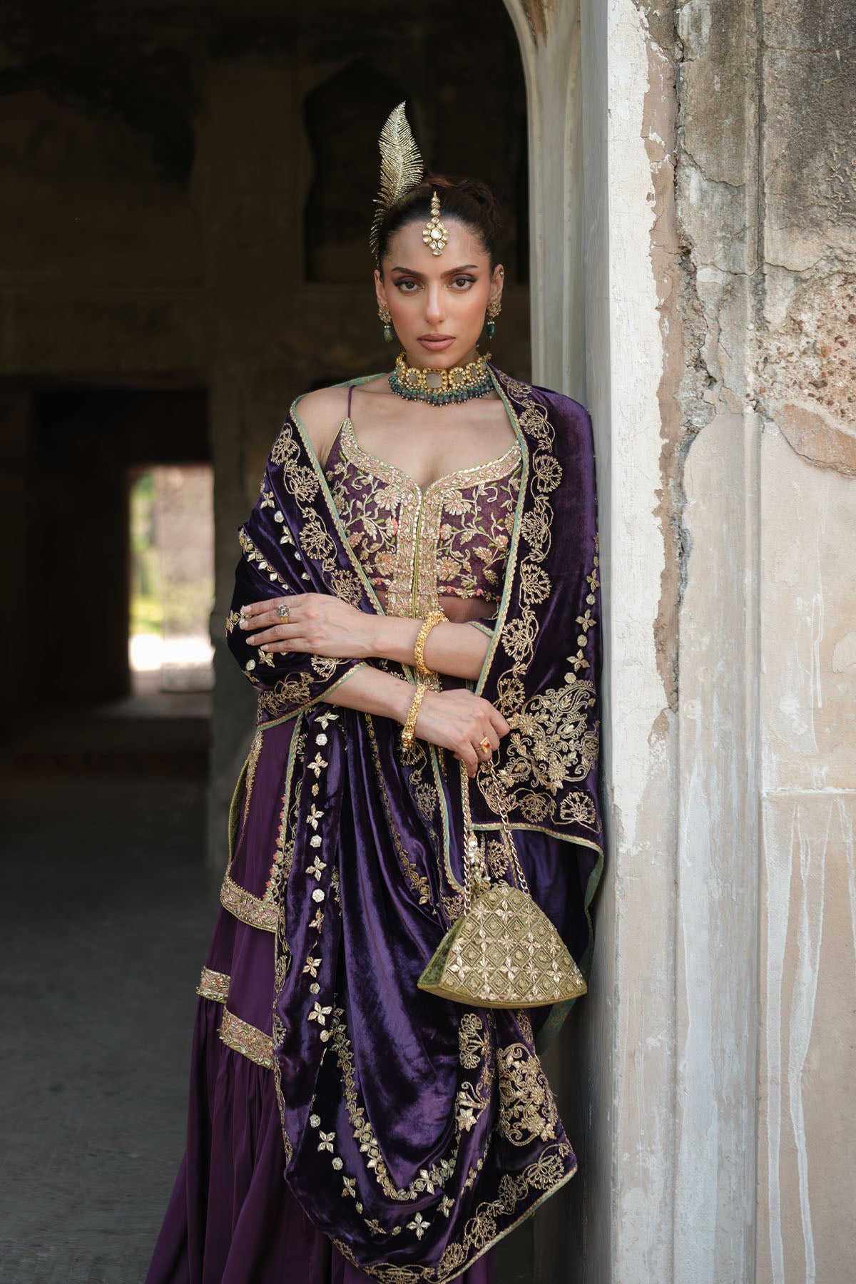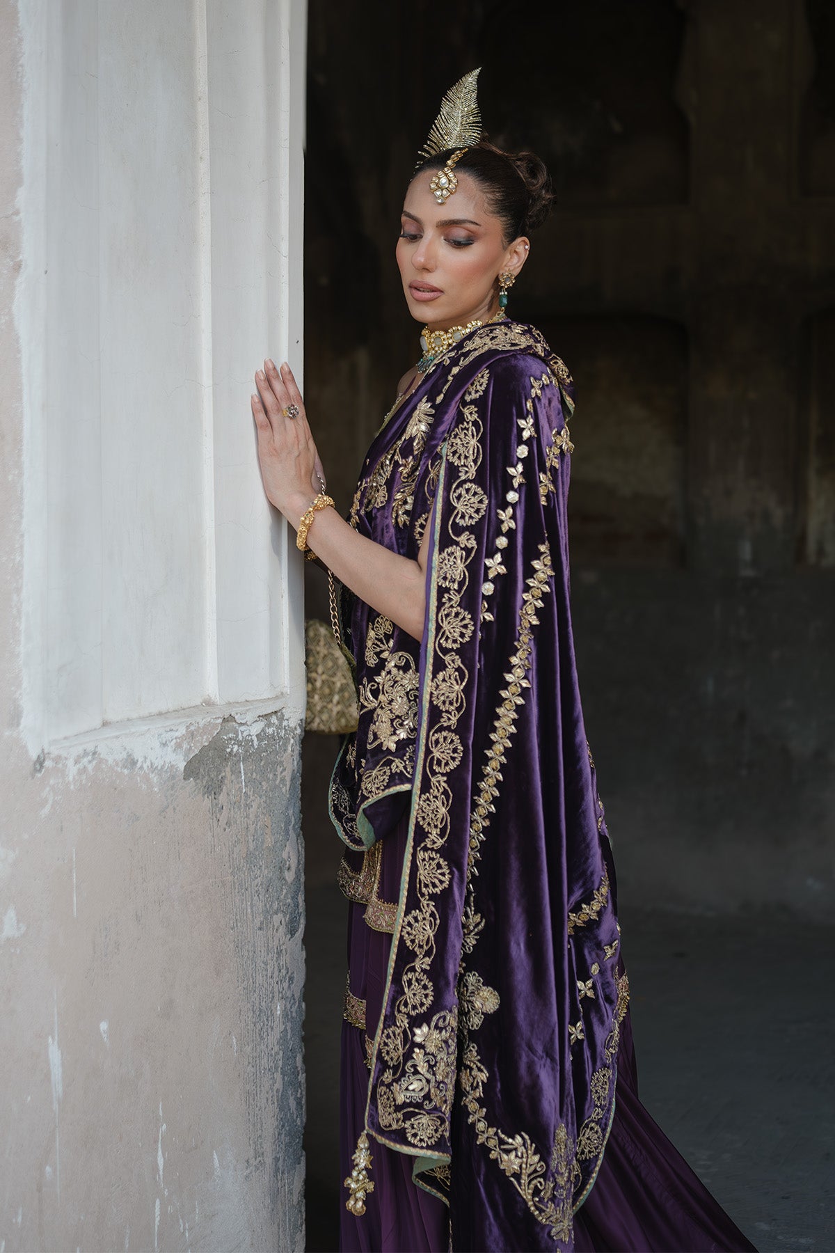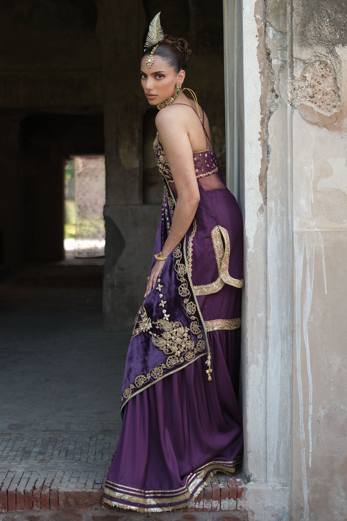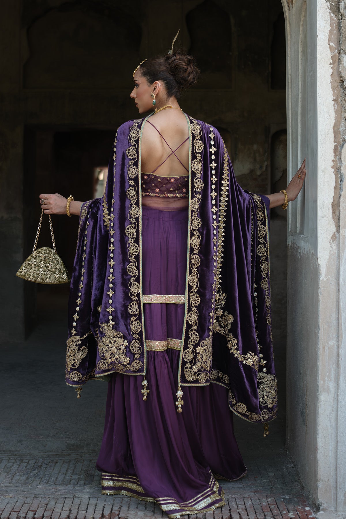 Intricate gota work decorates the attire, with floral motifs and running patterns embellishing the bodice accentuated by silk thread embroidery in contrasting tones to enhance its depth and texture. The borders in gota work trace the lengths of the panels and side seams, finely highlighted throughout the design. The gharara is accentuated with a gota border in its seam and highlighted with accents of gold at the hem adding a regal look to the silhouette. NOTE: Duppata price is not included.