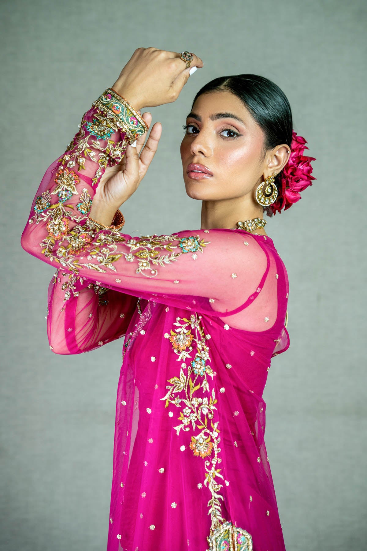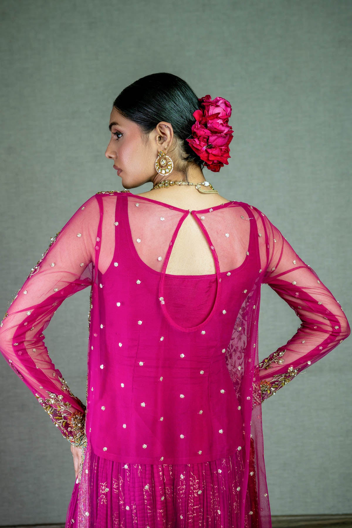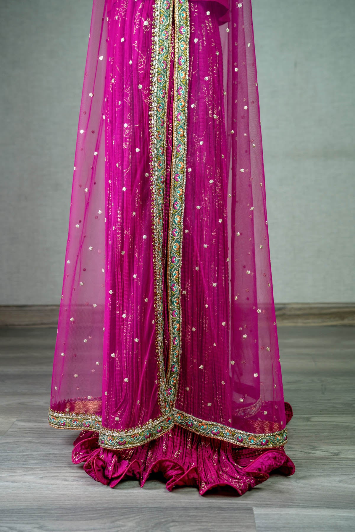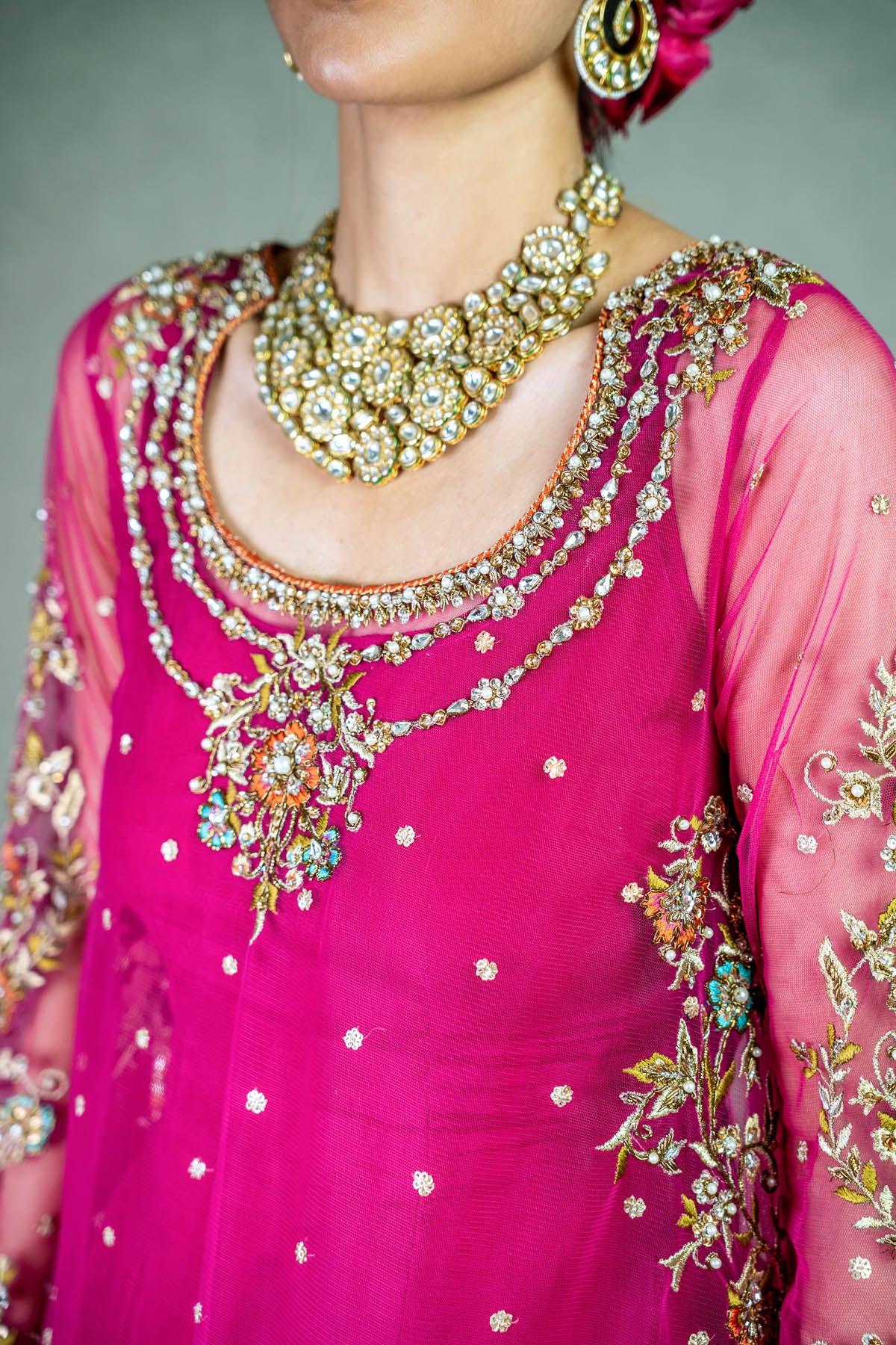 A striking deep red front open organza mukesh gown with side slits, paired with a zardozi-adorned inner blouse, a hot pink pure jamawar lehnga, and a matching dupatta. The gown features cotton zari net appliqué, coloured resham embroidery, Swarovski accents, zardozi, and kamdani work,...