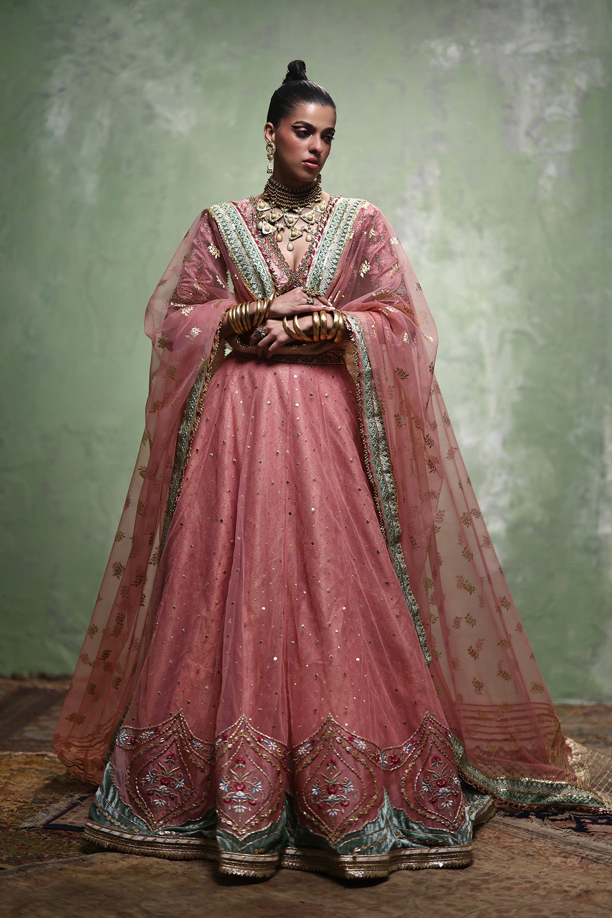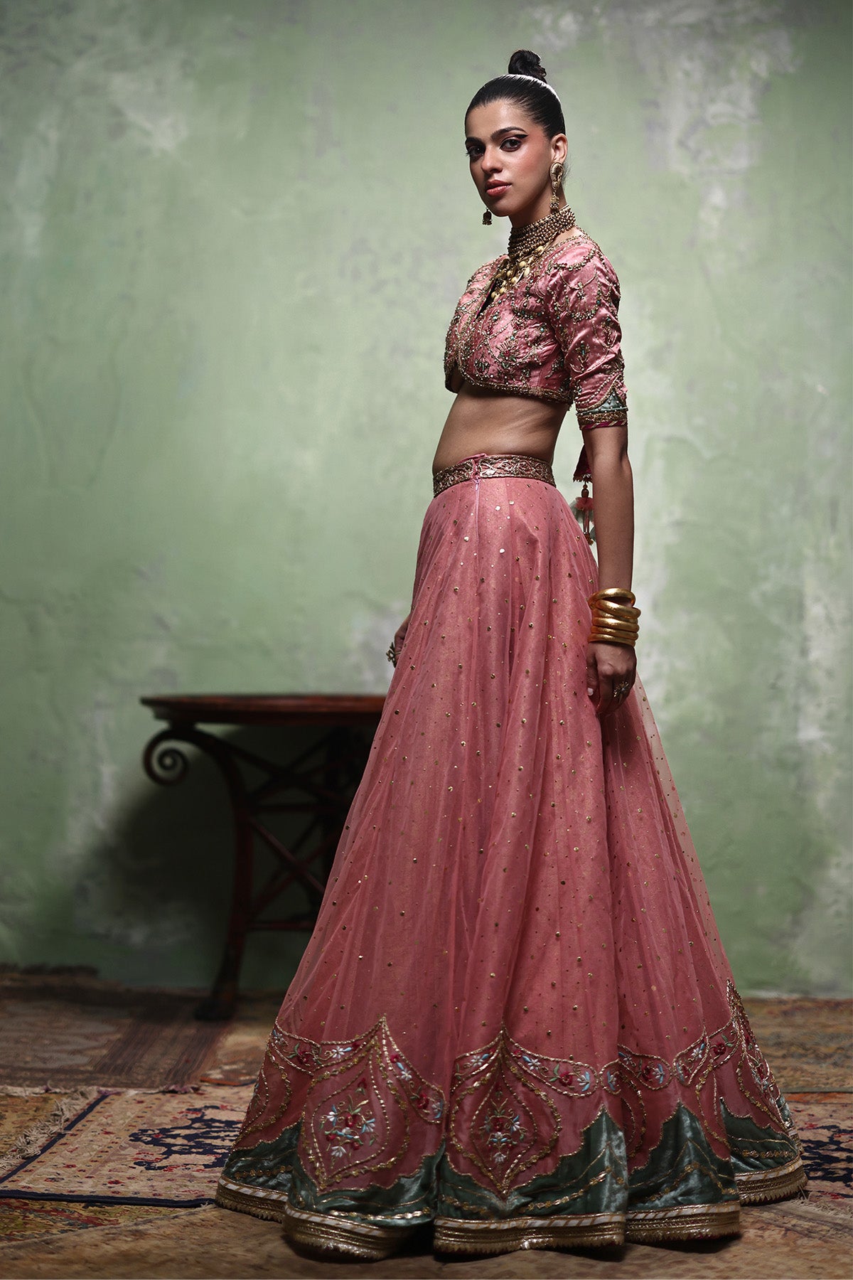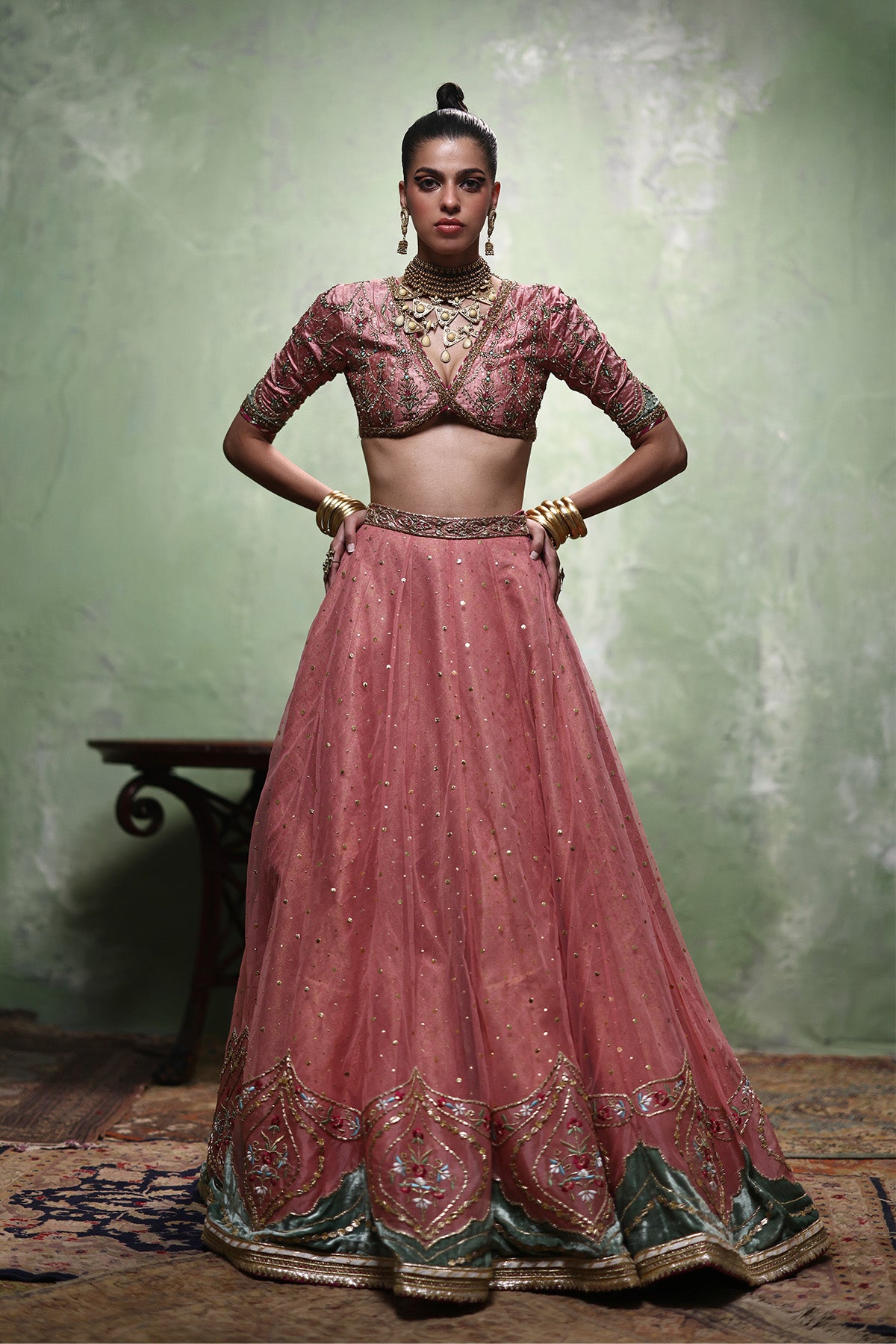 This striking ensemble features a deep V-neck tissue silk blouse, lavishly adorned with heavy zardozi work and accented with contrasting patchwork on the sleeves. Finished with delicate tassels at the back neckline, it pairs beautifully with a net lehnga shimmering with all-over mukesh work. Velvet patching and gotta detailing at the hem, along with a gotta-embellished belt, complete the look