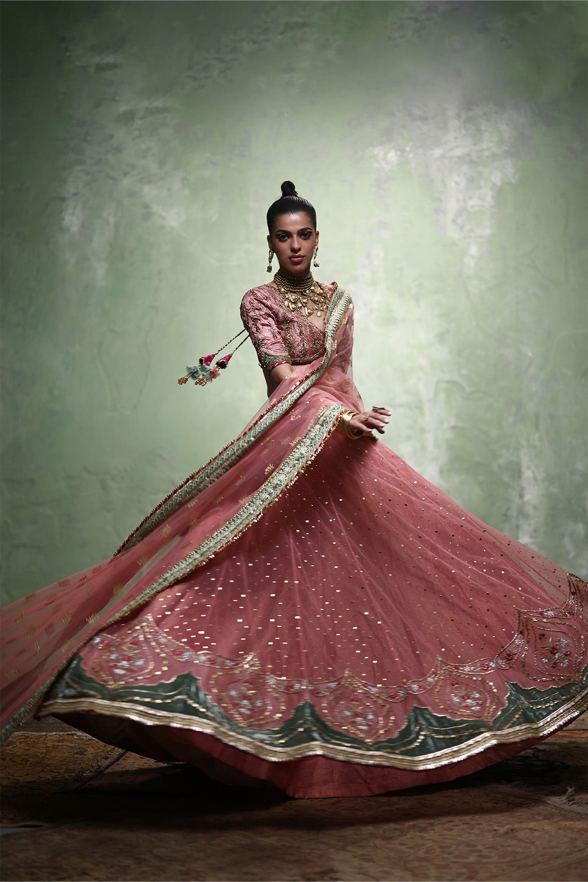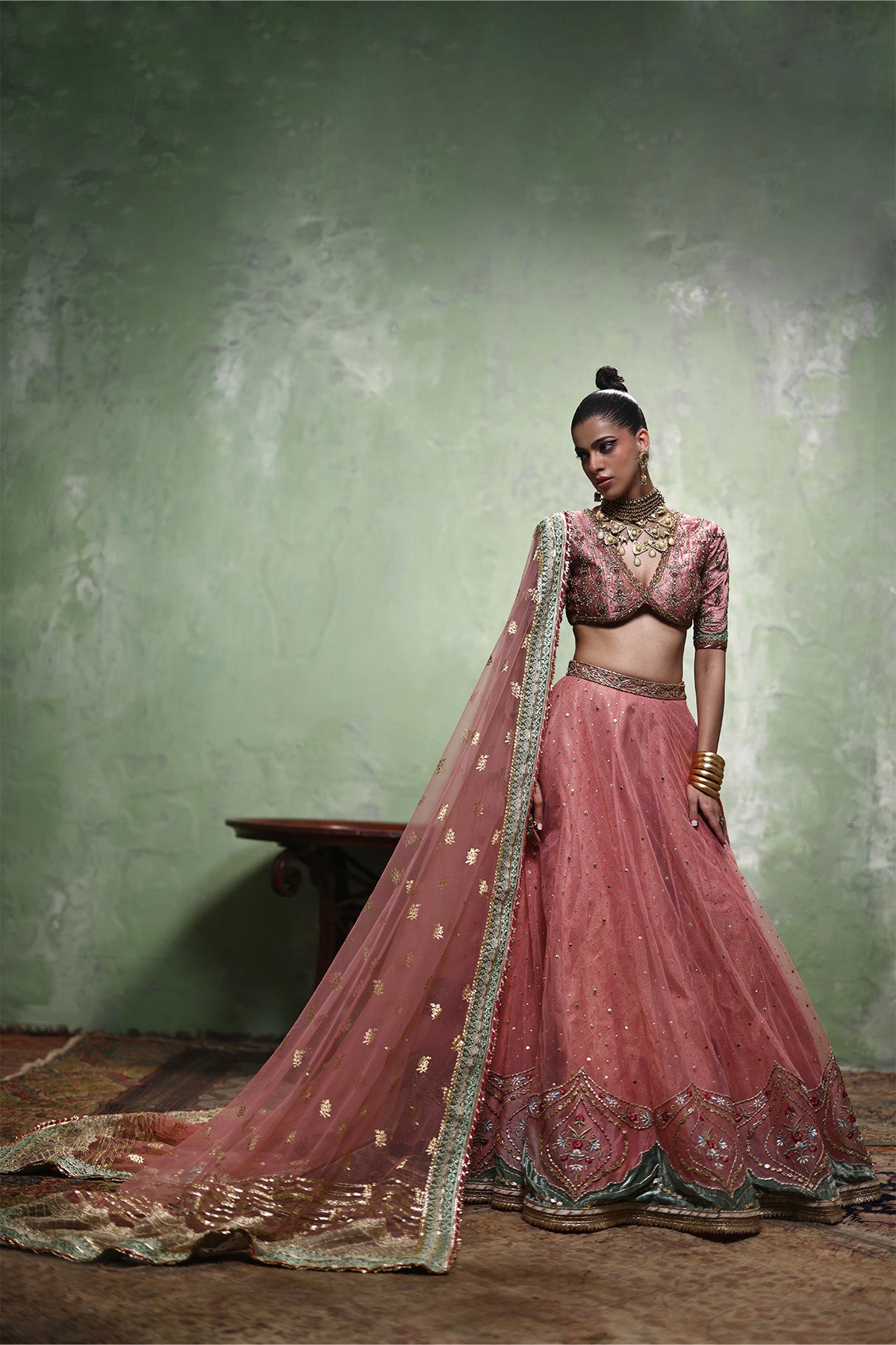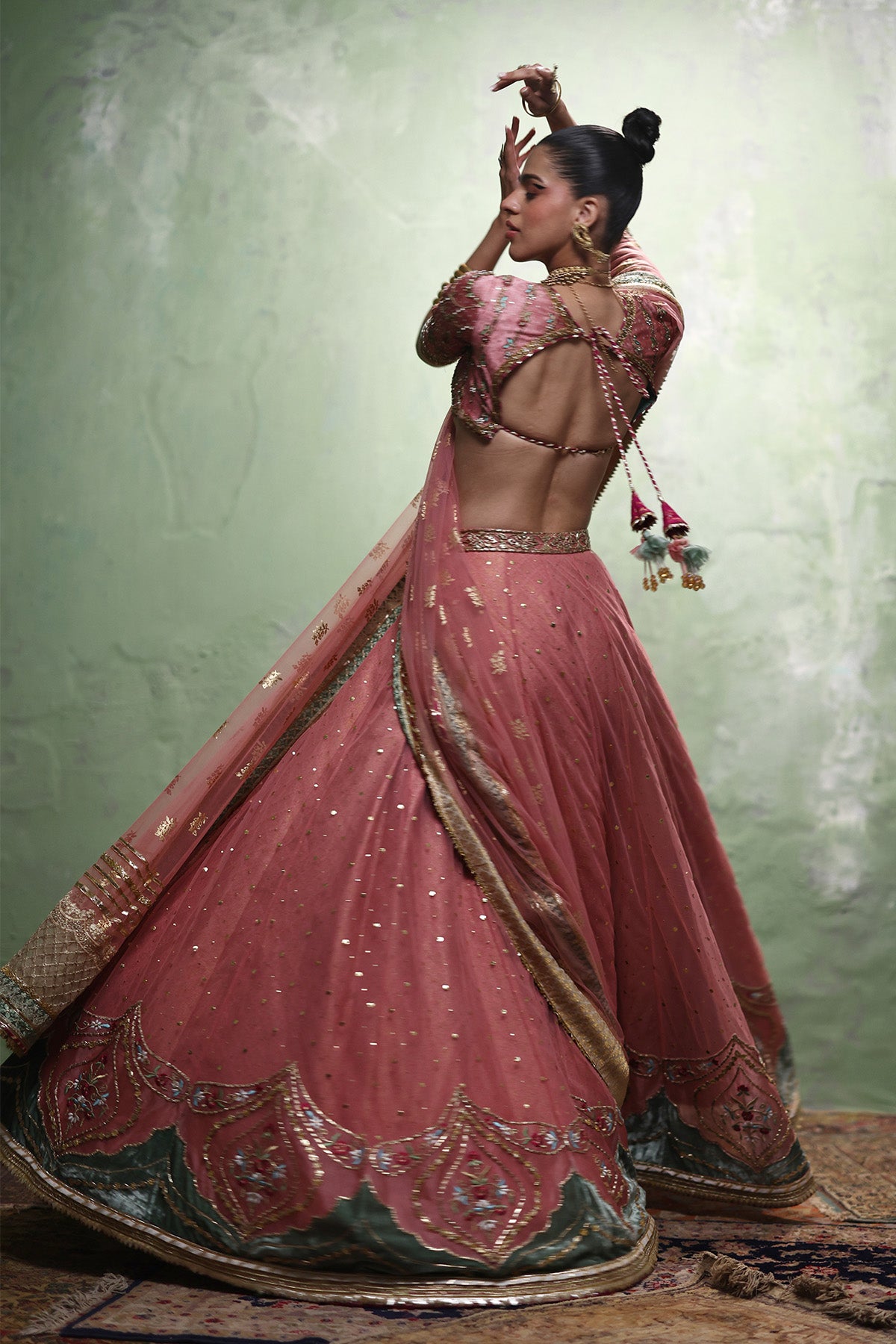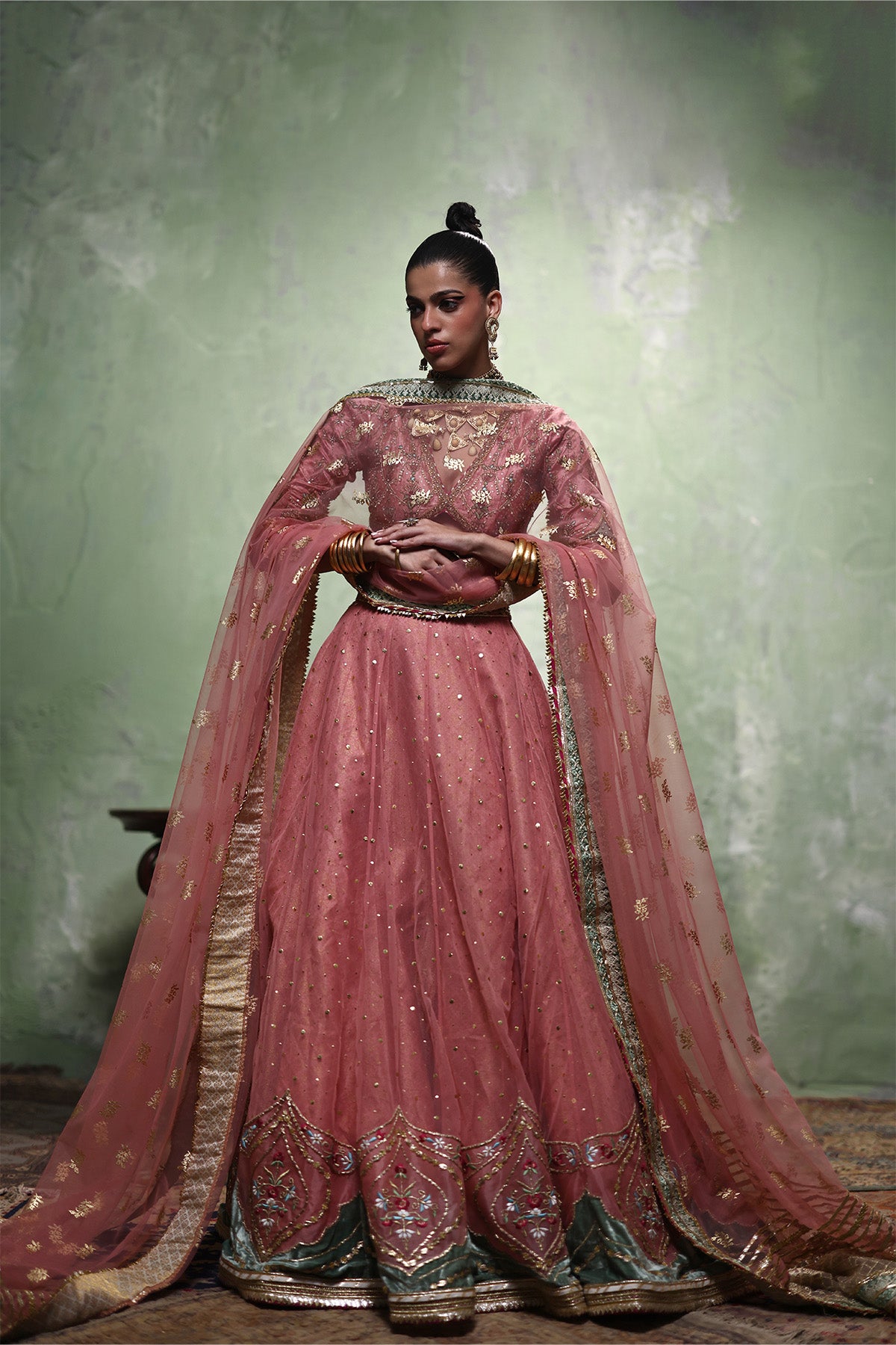 This striking ensemble features a deep V-neck tissue silk blouse, lavishly adorned with heavy zardozi work and accented with contrasting patchwork on the sleeves. Finished with delicate tassels at the back neckline, it pairs beautifully with a net lehnga shimmering with all-over mukesh work. Velvet patching and gotta detailing at the hem, along with a gotta-embellished belt, complete the look