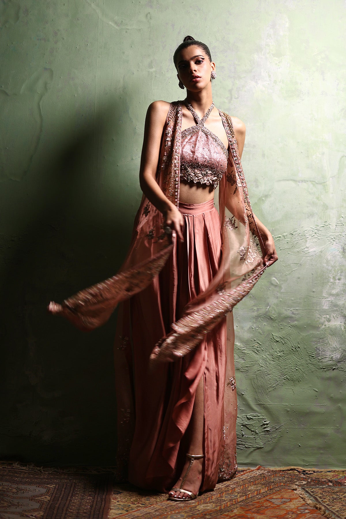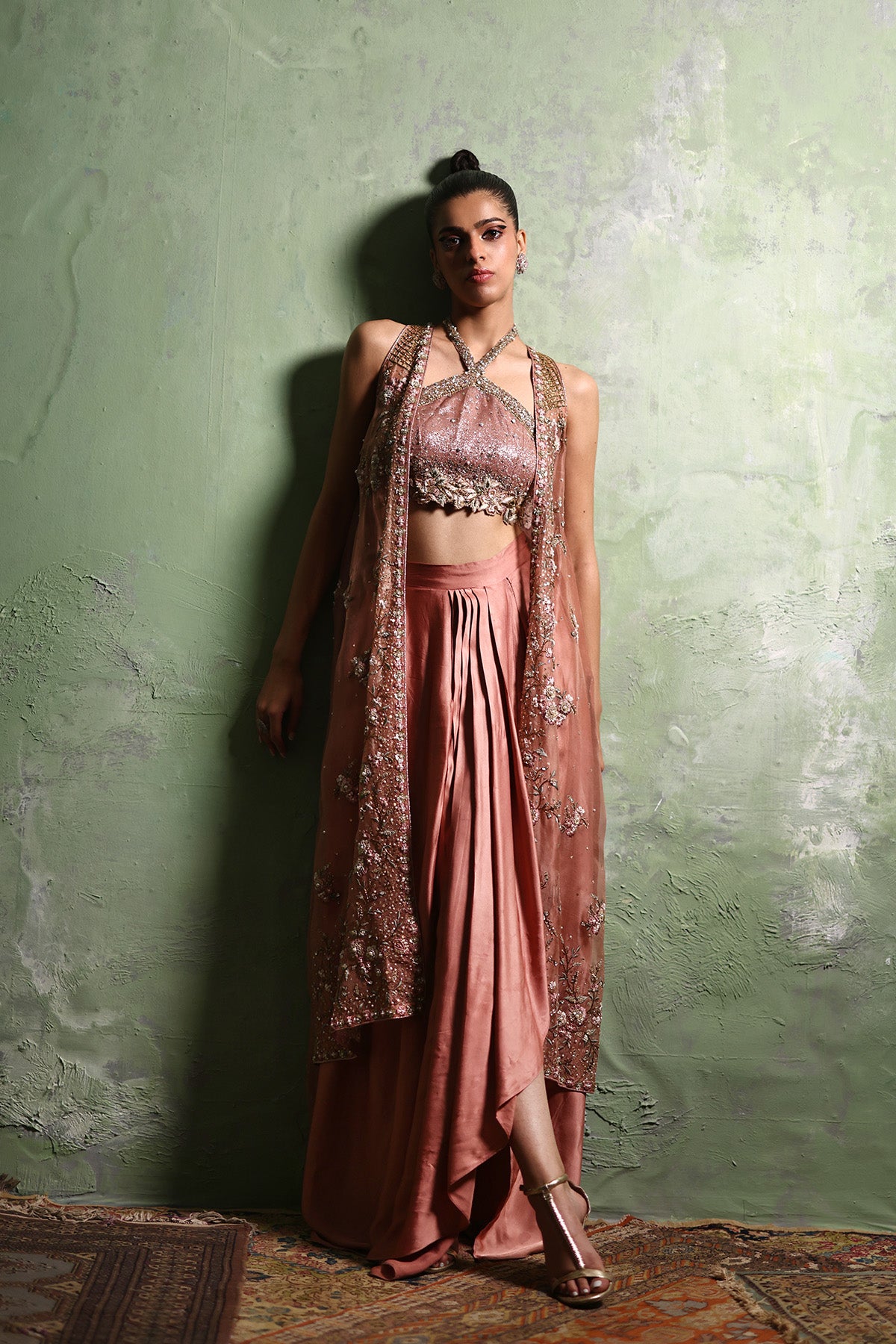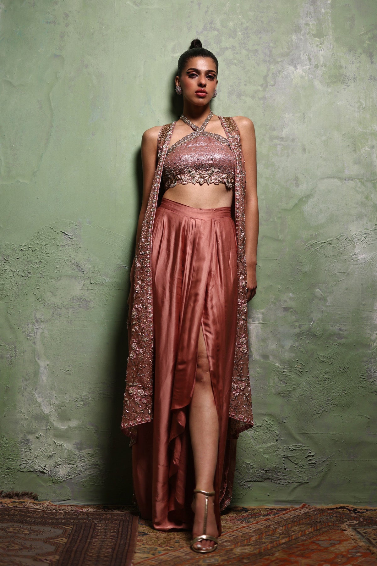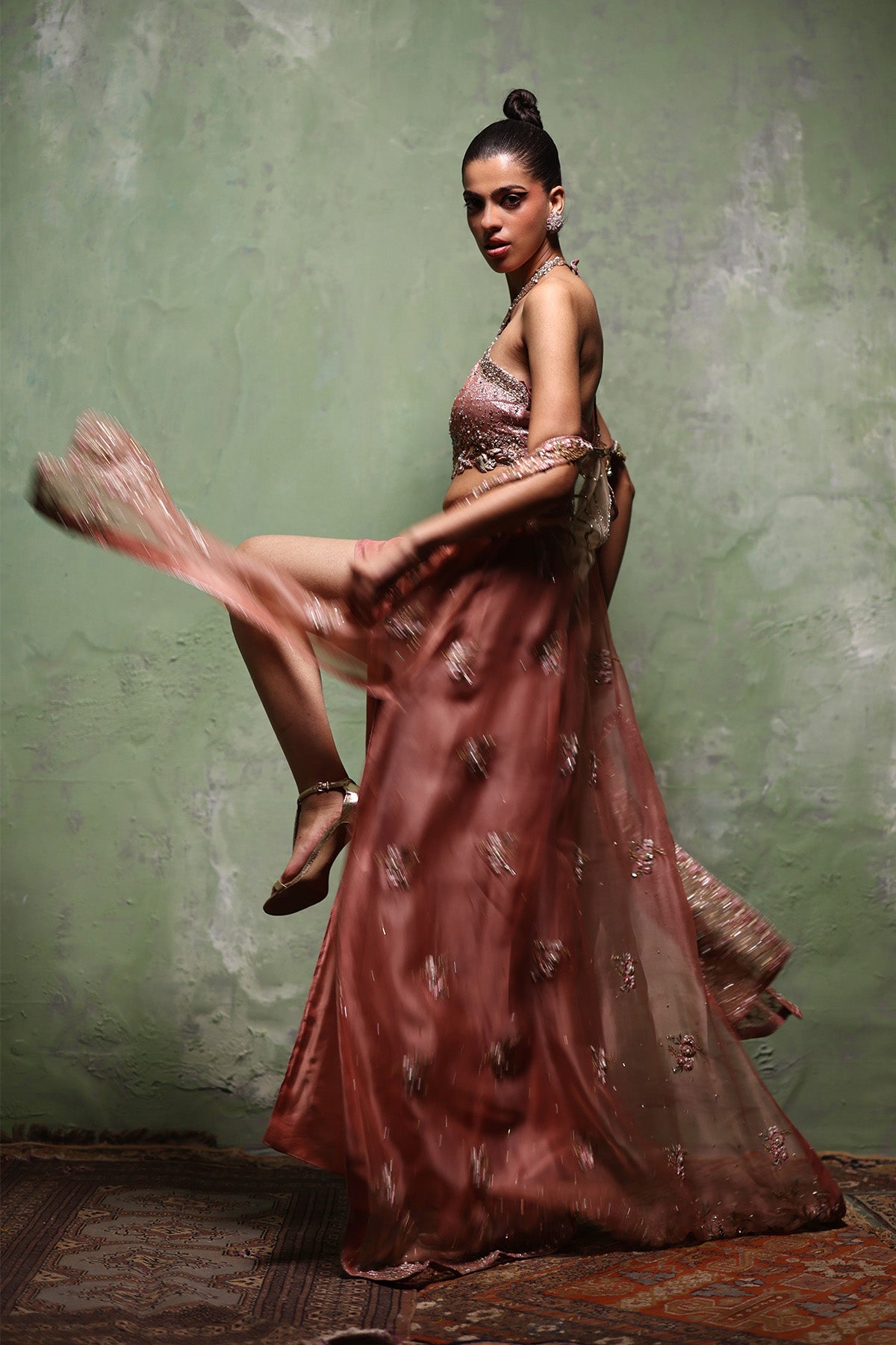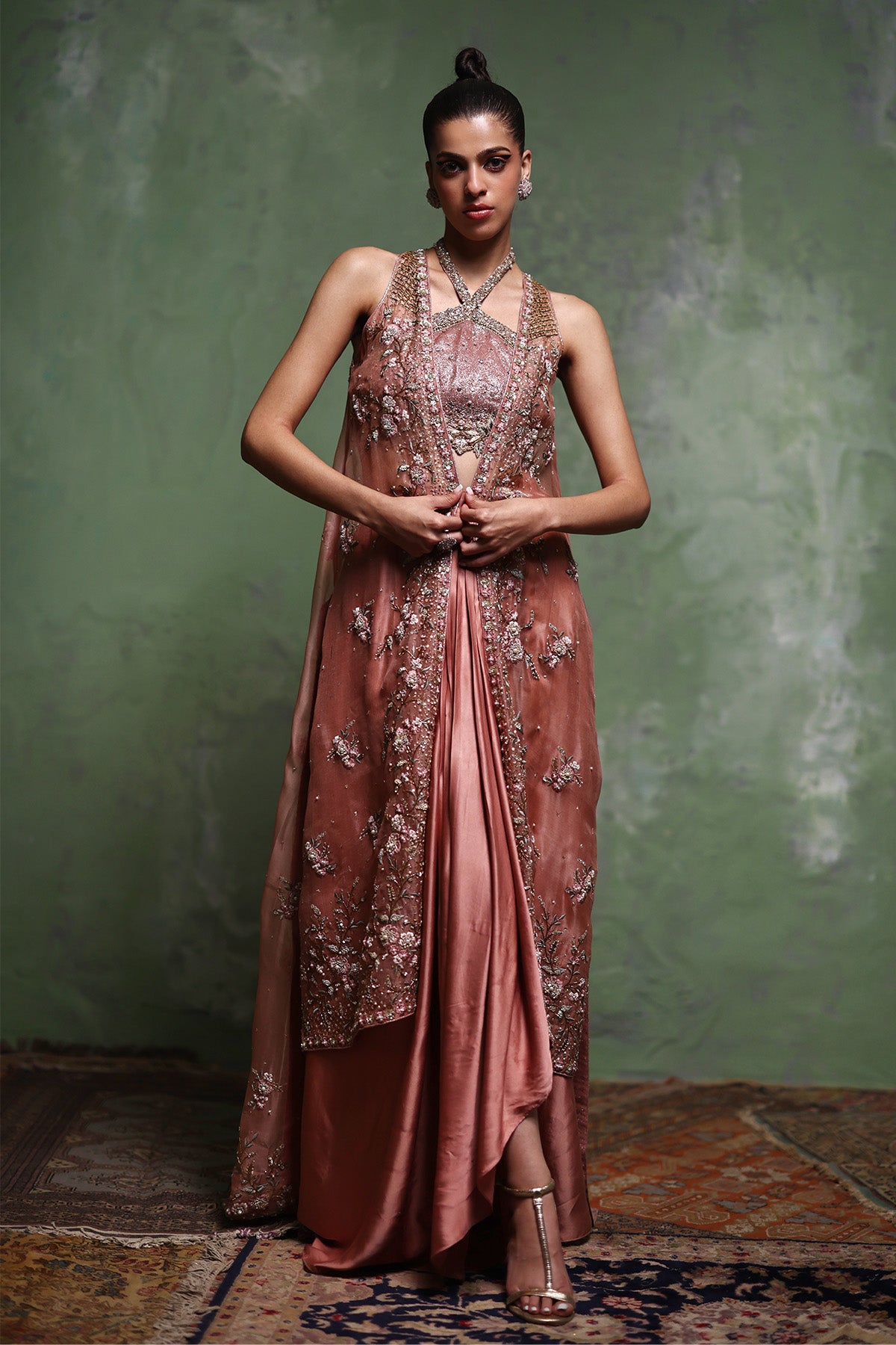 This A-line high–low organza jacket is delicately adorned with intricate thread embroidery, elevated by hand-worked adda highlights of gold dabka, naqshi, crystals, and sequins. Layered over a shimmery halter blouse, fully embellished with crystals, champagne stones, and pearls, the look is completed with a pure silk skirt featuring a graceful front slit effortlessly blending modern glamour with refined craftsmanship.