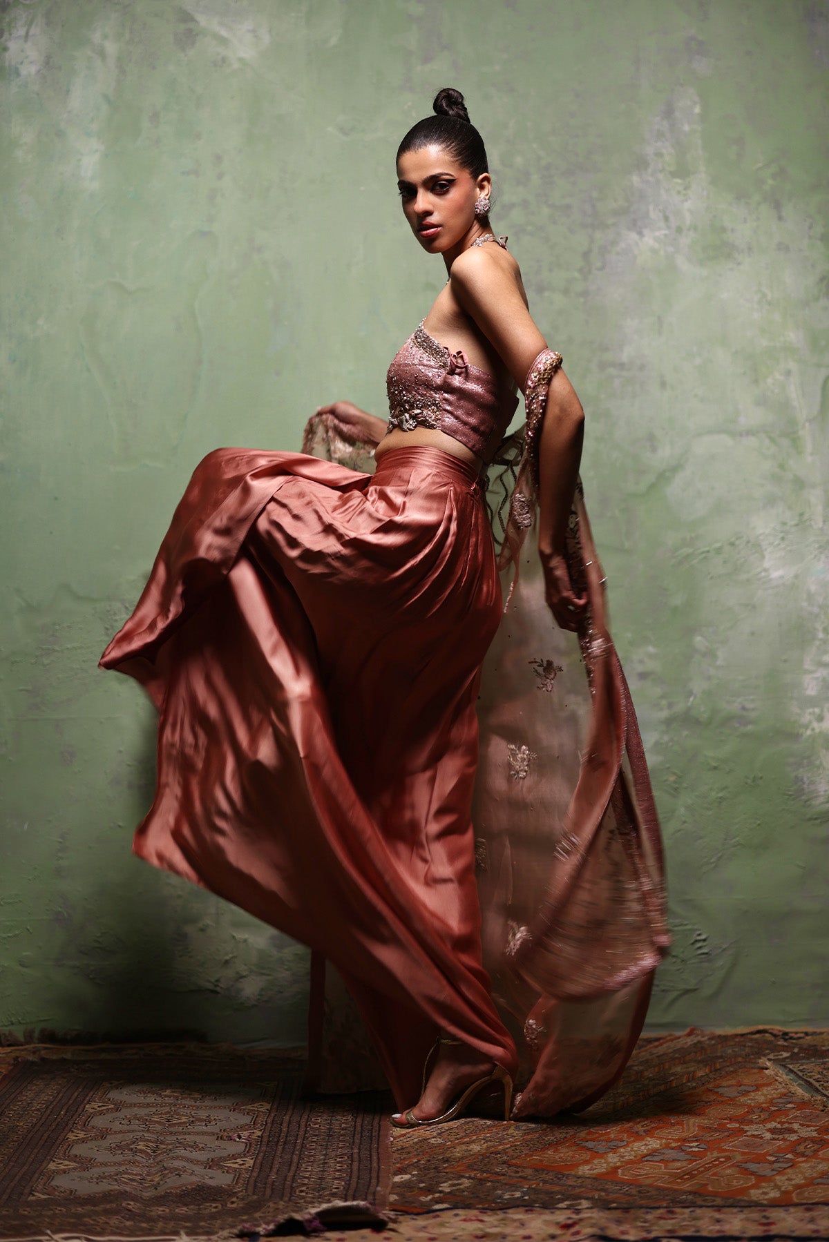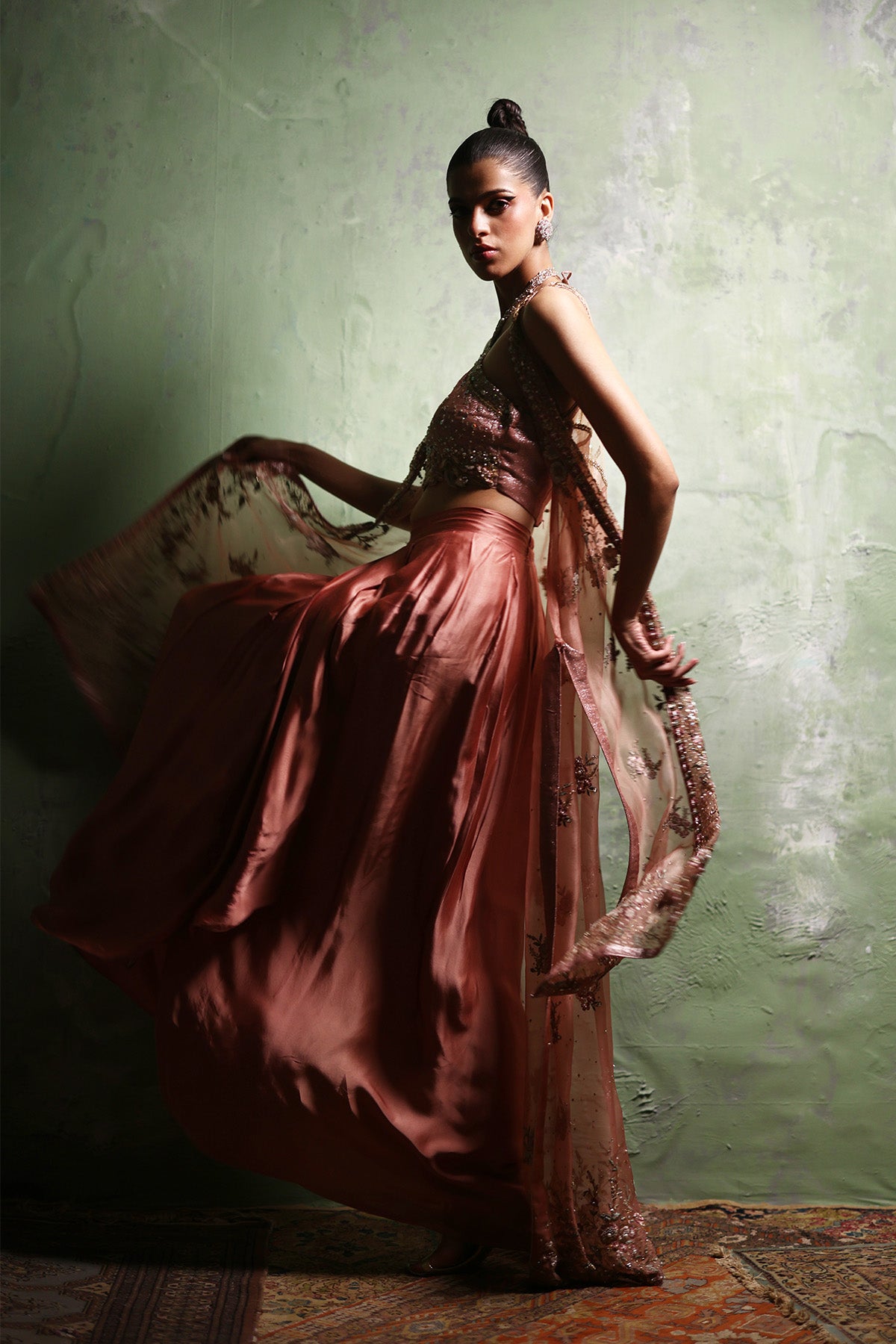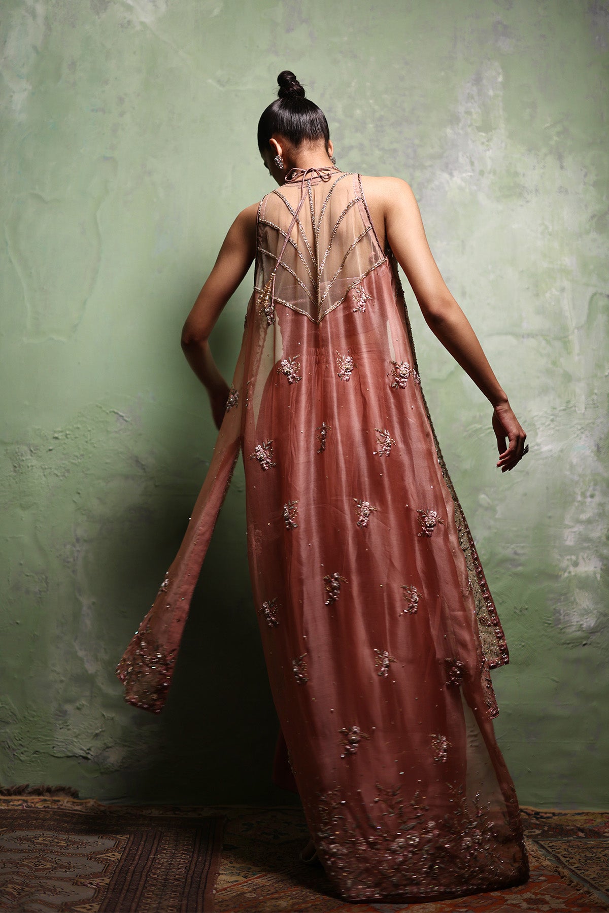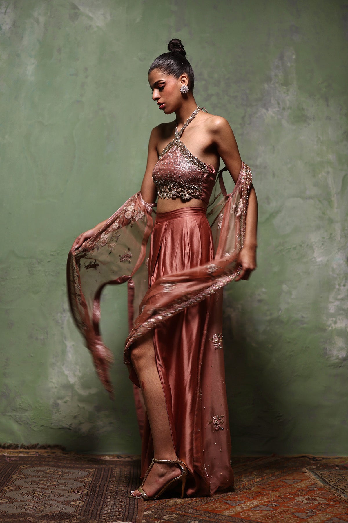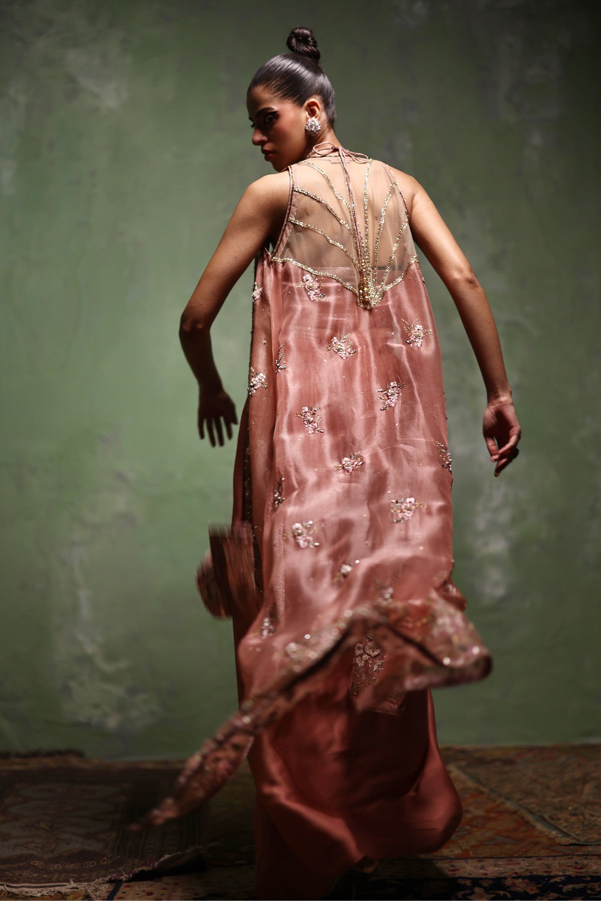 This A-line high–low organza jacket is delicately adorned with intricate thread embroidery, elevated by hand-worked adda highlights of gold dabka, naqshi, crystals, and sequins. Layered over a shimmery halter blouse, fully embellished with crystals, champagne stones, and pearls, the look is completed with a pure silk skirt featuring a graceful front slit effortlessly blending modern glamour with refined craftsmanship.