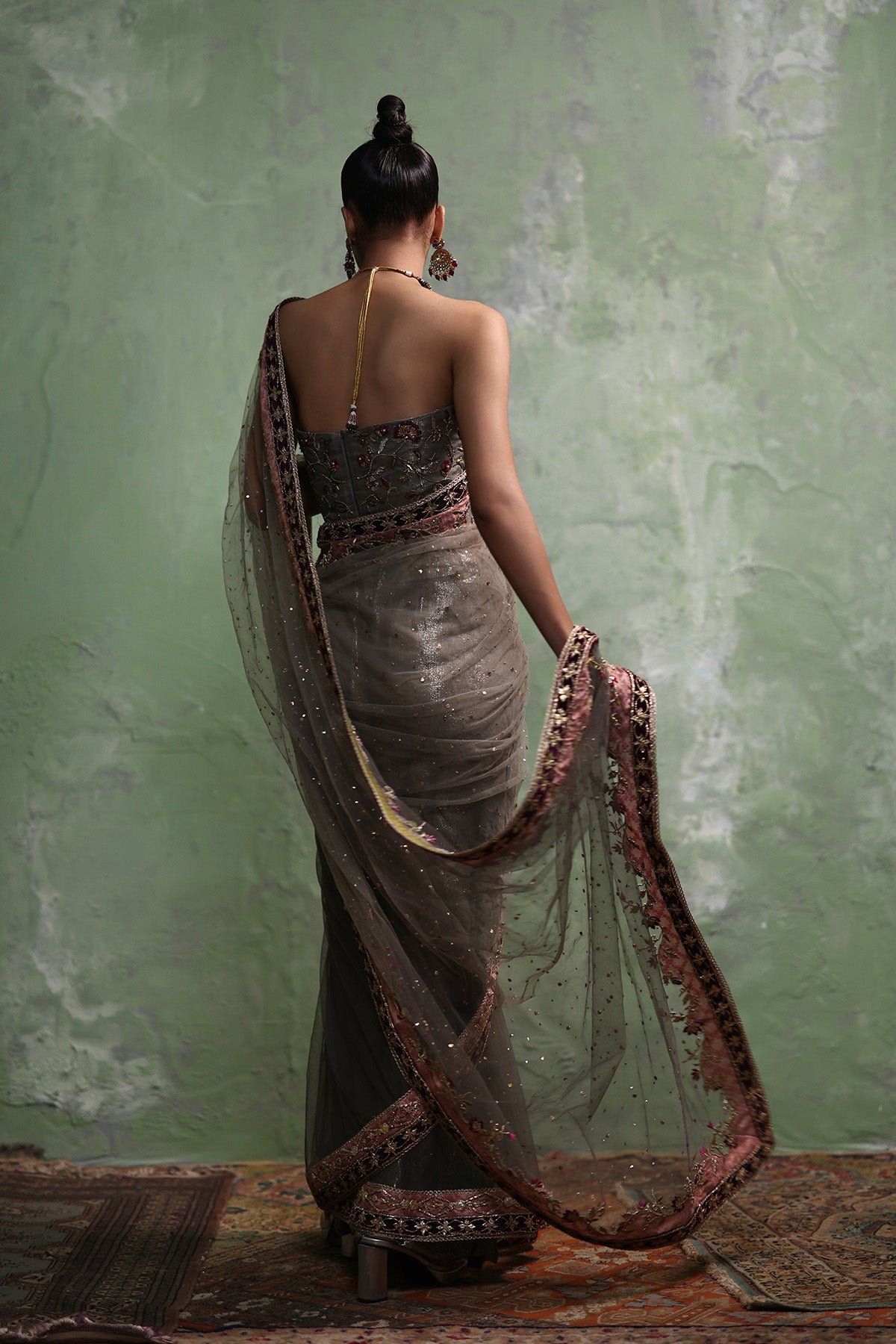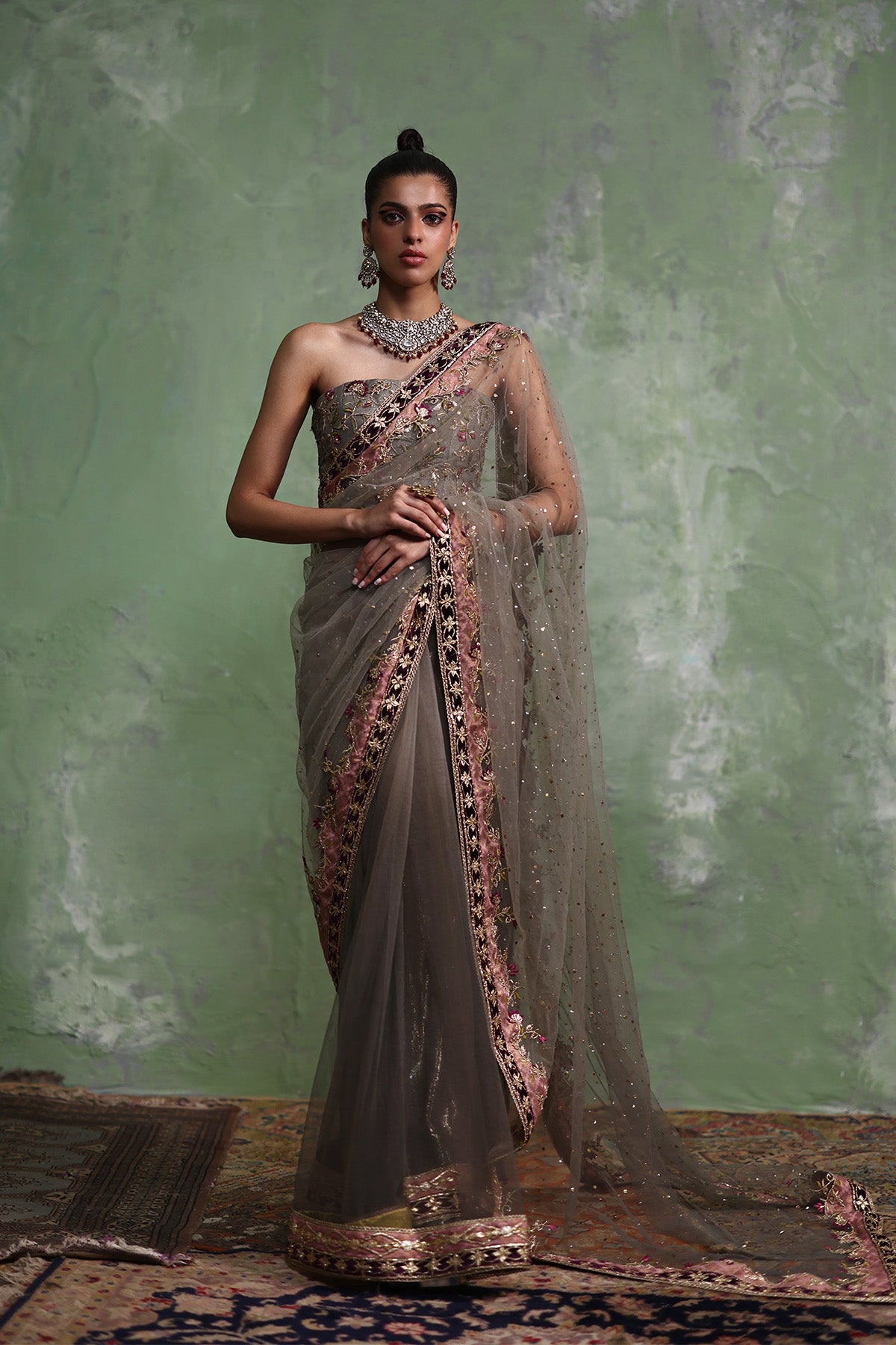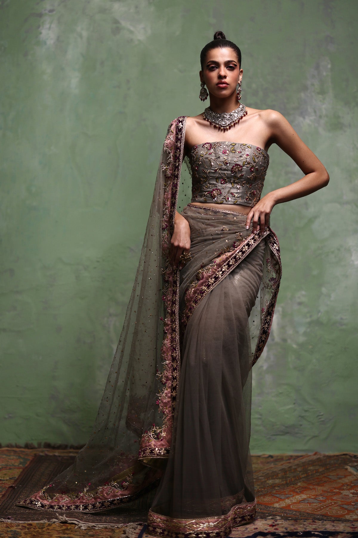 This grey net mukesh saree is paired with a sculpted strapless corset blouse in organza, lined with lama lines fabric for a refined finish. Intricate zardozi work adorns the blouse, subtly highlighted with plum-toned resham accents, while the saree is elevated with a machine-worked border featuring gotta and patch detailing. Completed with a lama lines fabric patti coat, the look is bold, contemporary, and effortlessly elegant.