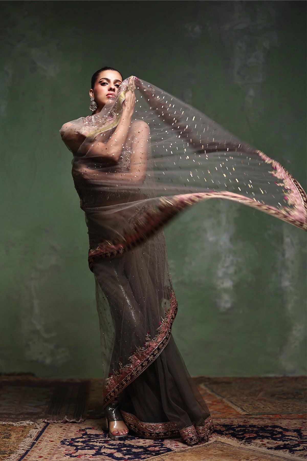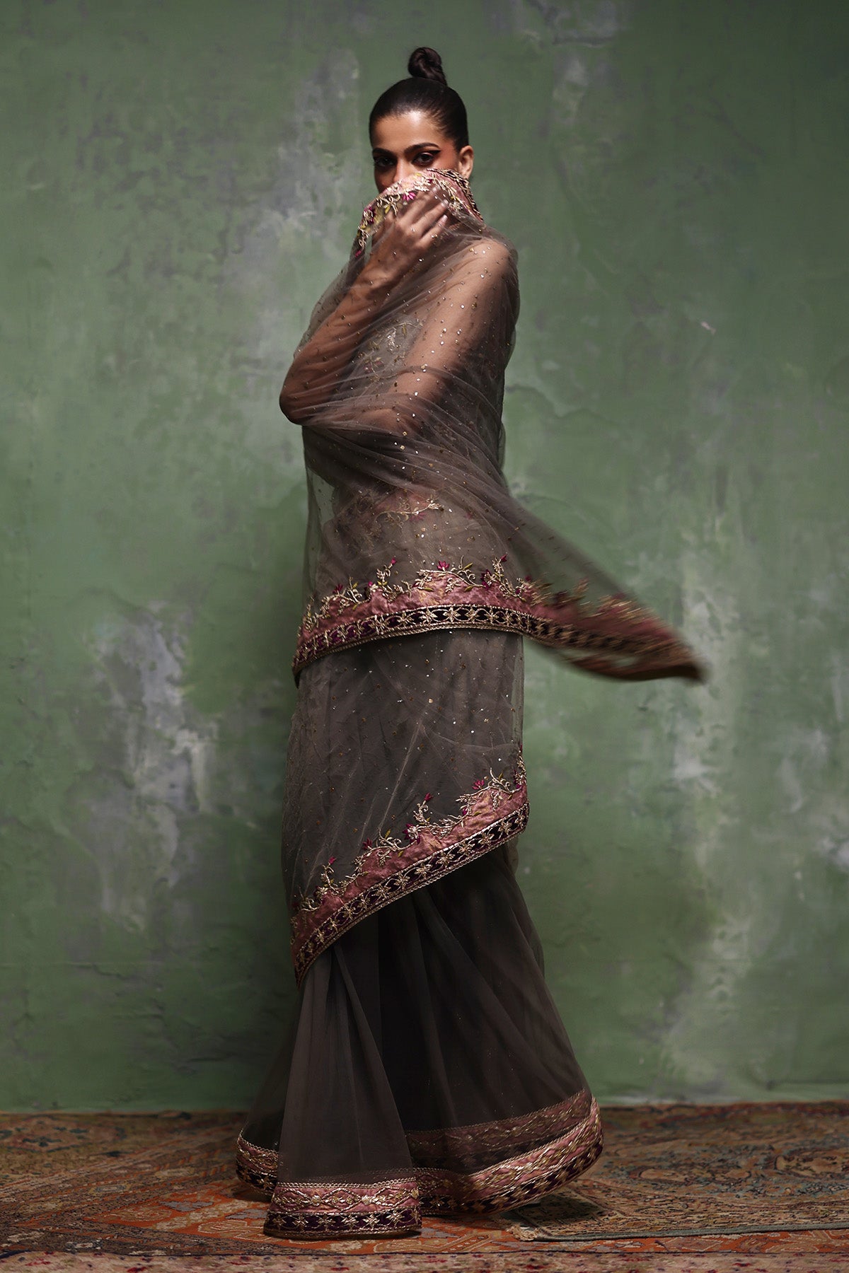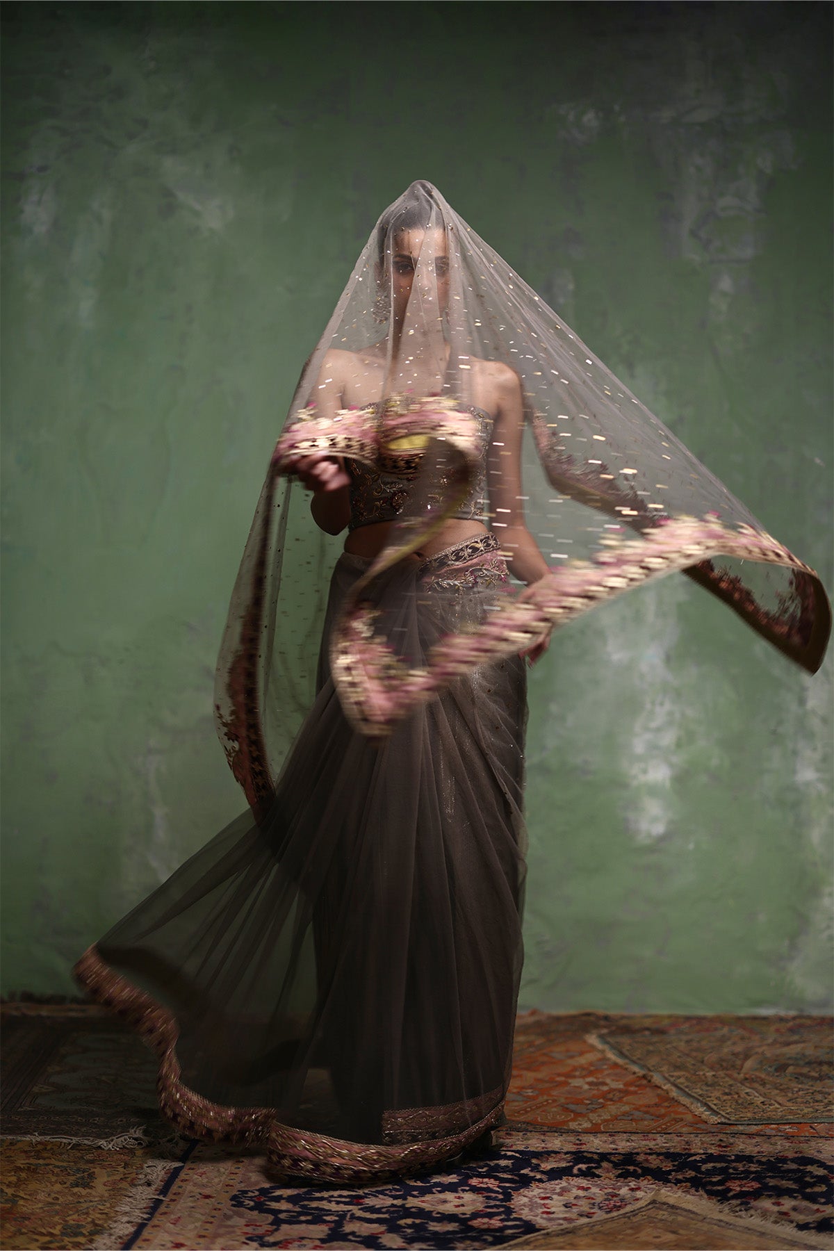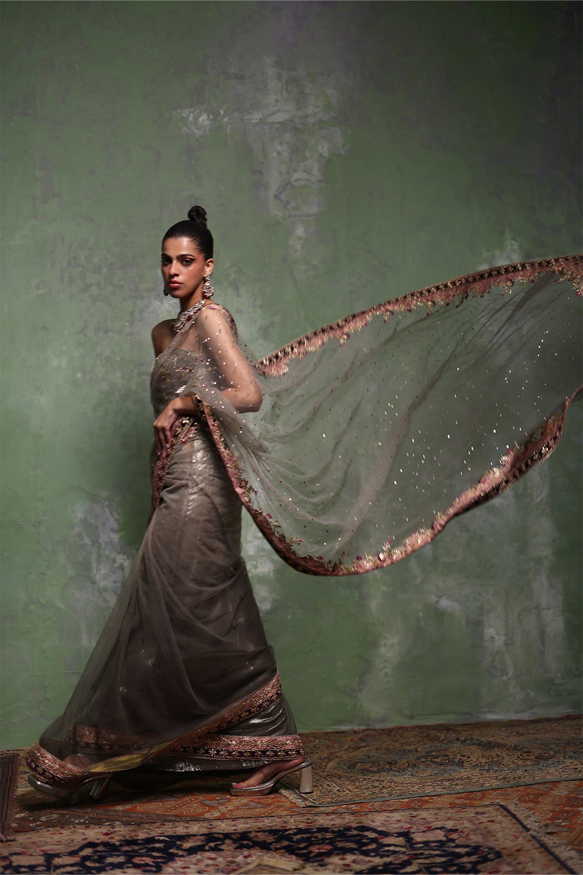 This grey net mukesh saree is paired with a sculpted strapless corset blouse in organza, lined with lama lines fabric for a refined finish. Intricate zardozi work adorns the blouse, subtly highlighted with plum-toned resham accents, while the saree is elevated with a machine-worked border featuring gotta and patch detailing. Completed with a lama lines fabric patti coat, the look is bold, contemporary, and effortlessly elegant.