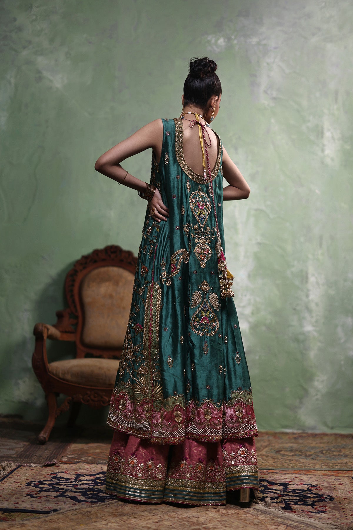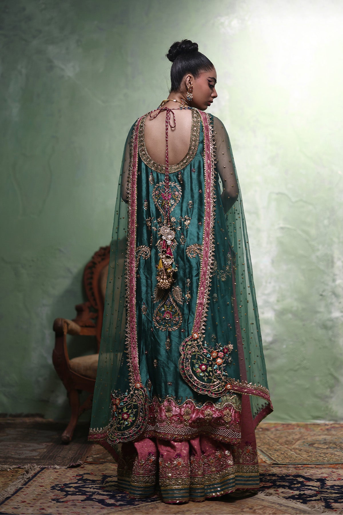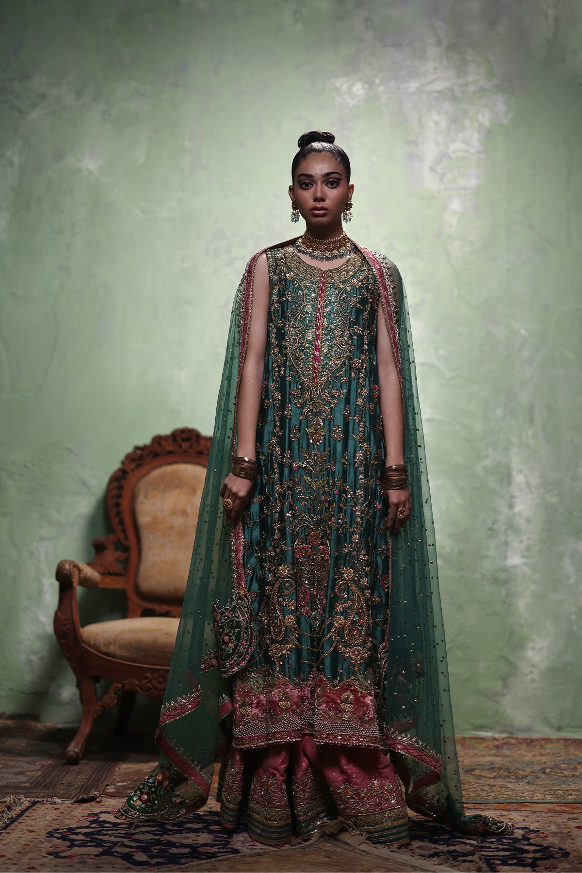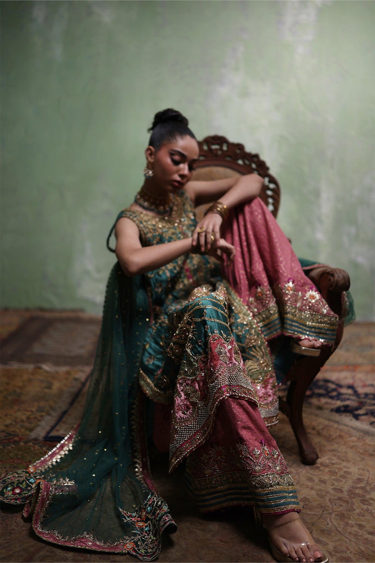 This long, straight-cut tissue silk shirt in a serene sea green hue flows effortlessly from shoulder to hem, its clean silhouette elevated with velvet patching for subtle textural contrast. Intricately adorned with pure gold zardozi and softened with delicate thread embroidery in accent tones. Paired with a voluminous cotton net sharara, detailed with heavy gota borders and embroidered motifs highlighted in soft pink accents.