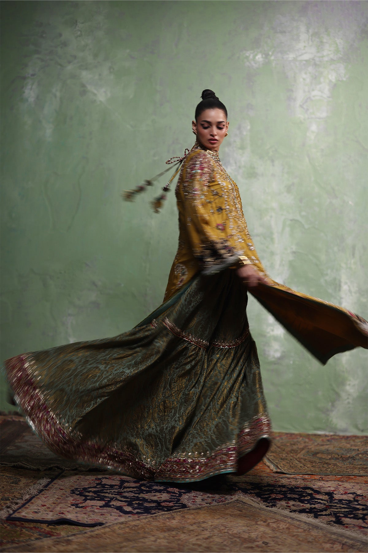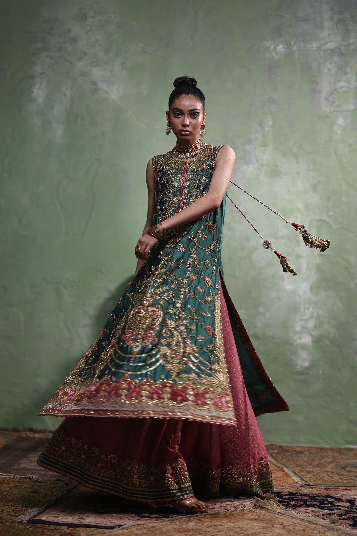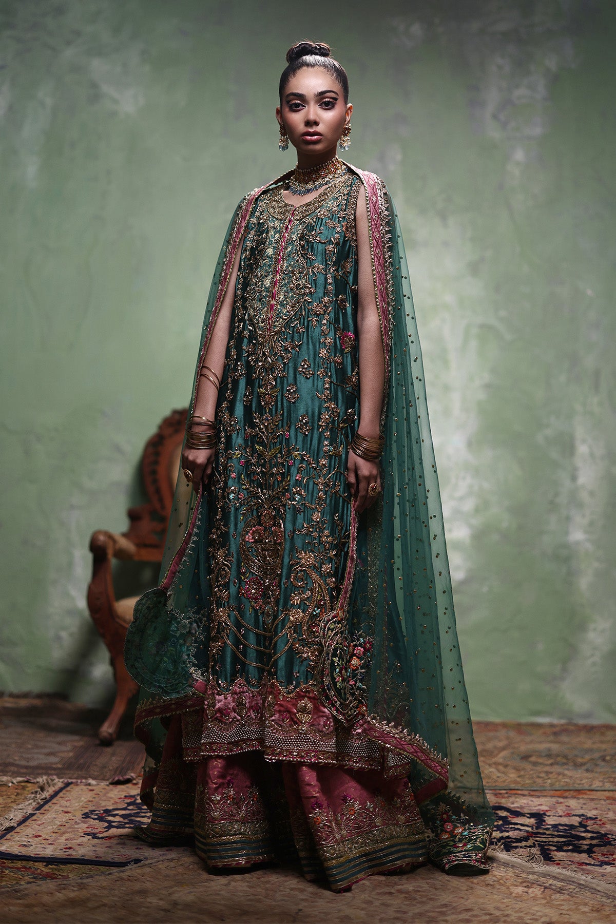 This long, straight-cut tissue silk shirt in a serene sea green hue flows effortlessly from shoulder to hem, its clean silhouette elevated with velvet patching for subtle textural contrast. Intricately adorned with pure gold zardozi and softened with delicate thread embroidery in accent tones. Paired with a voluminous cotton net sharara, detailed with heavy gota borders and embroidered motifs highlighted in soft pink accents.