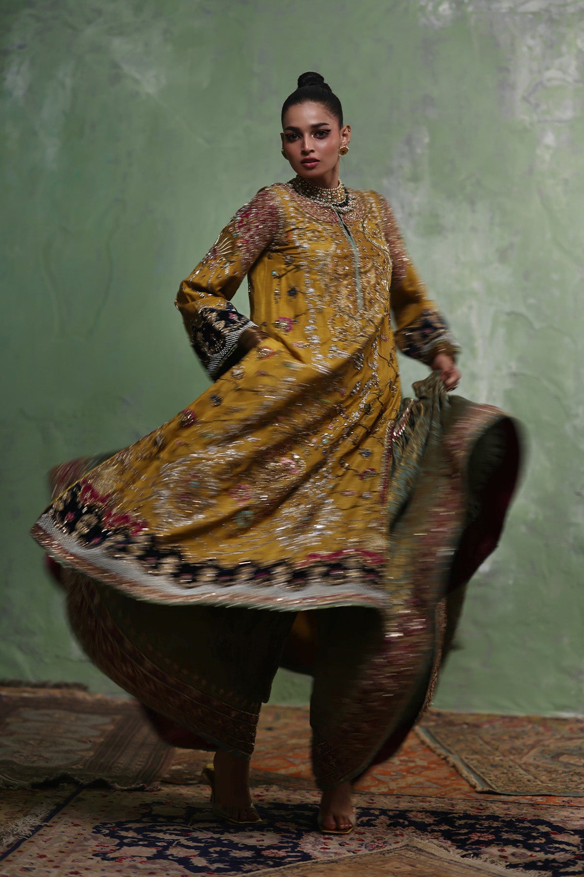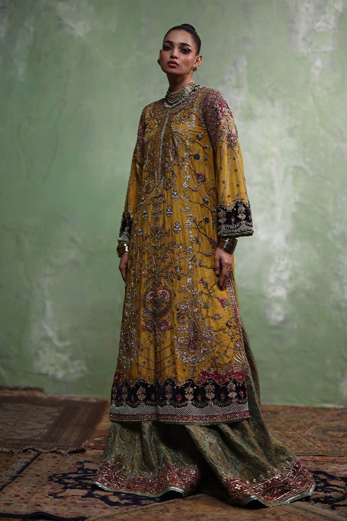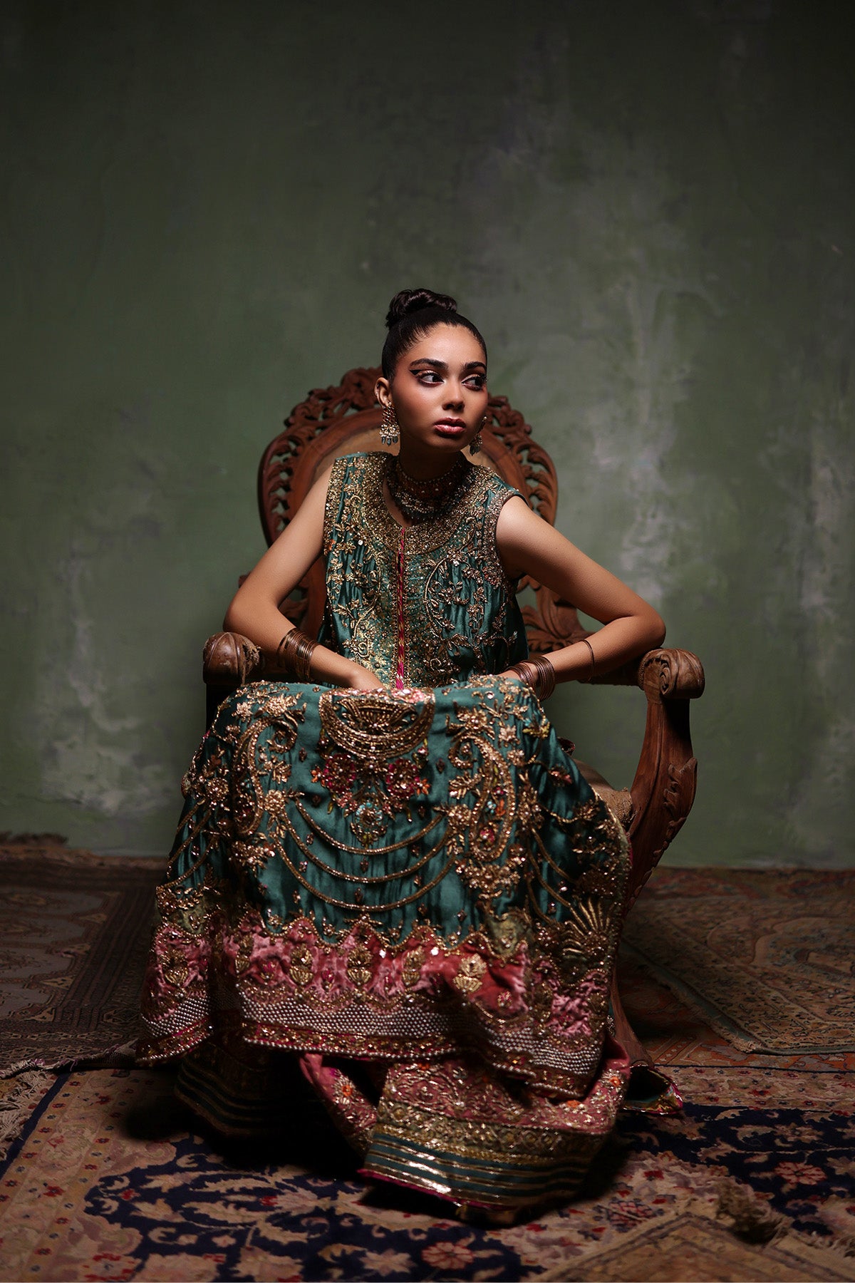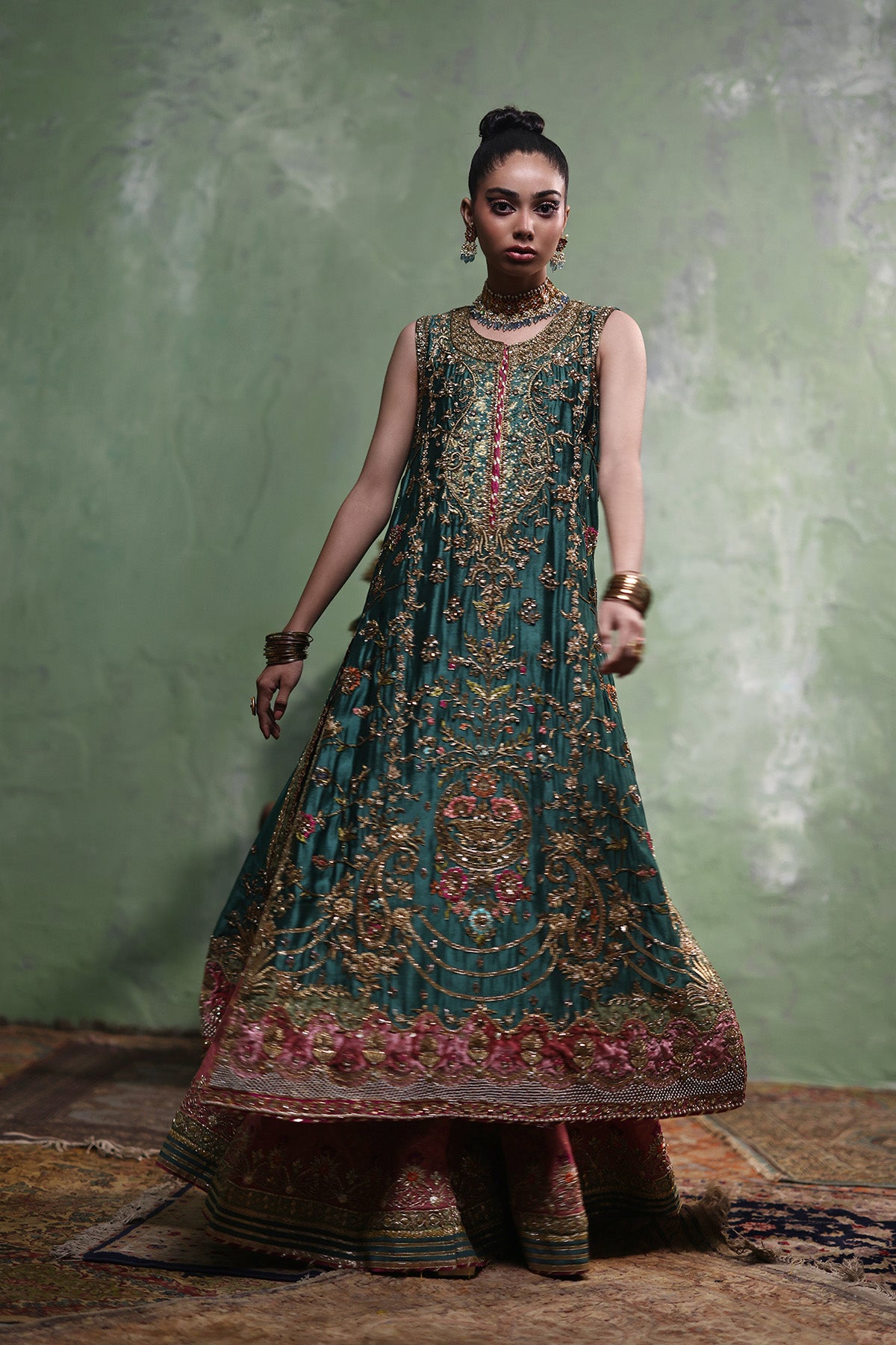 This long, straight-cut tissue silk shirt in a serene sea green hue flows effortlessly from shoulder to hem, its clean silhouette elevated with velvet patching for subtle textural contrast. Intricately adorned with pure gold zardozi and softened with delicate thread embroidery in accent tones. Paired with a voluminous cotton net sharara, detailed with heavy gota borders and embroidered motifs highlighted in soft pink accents.