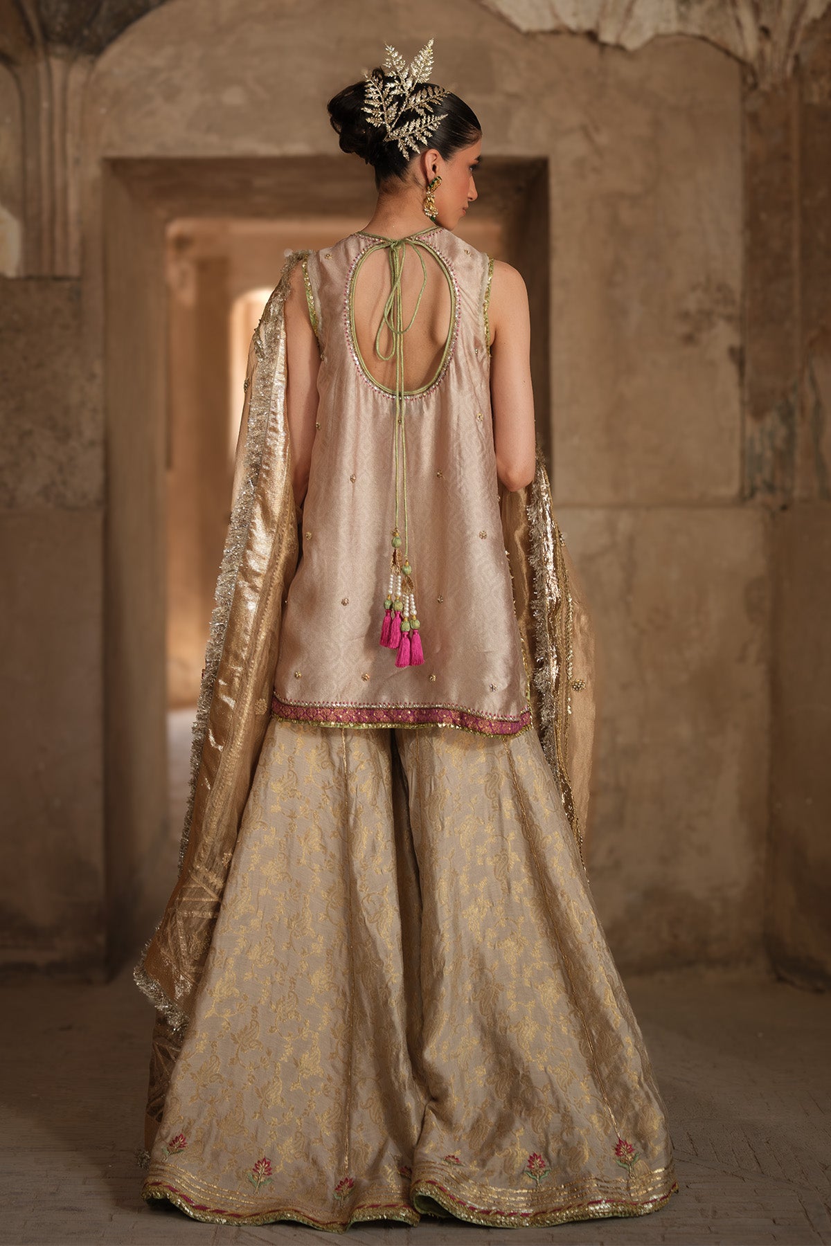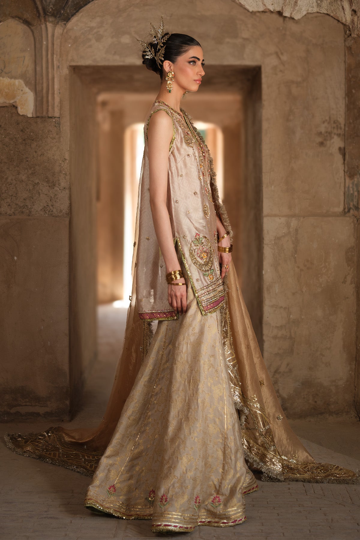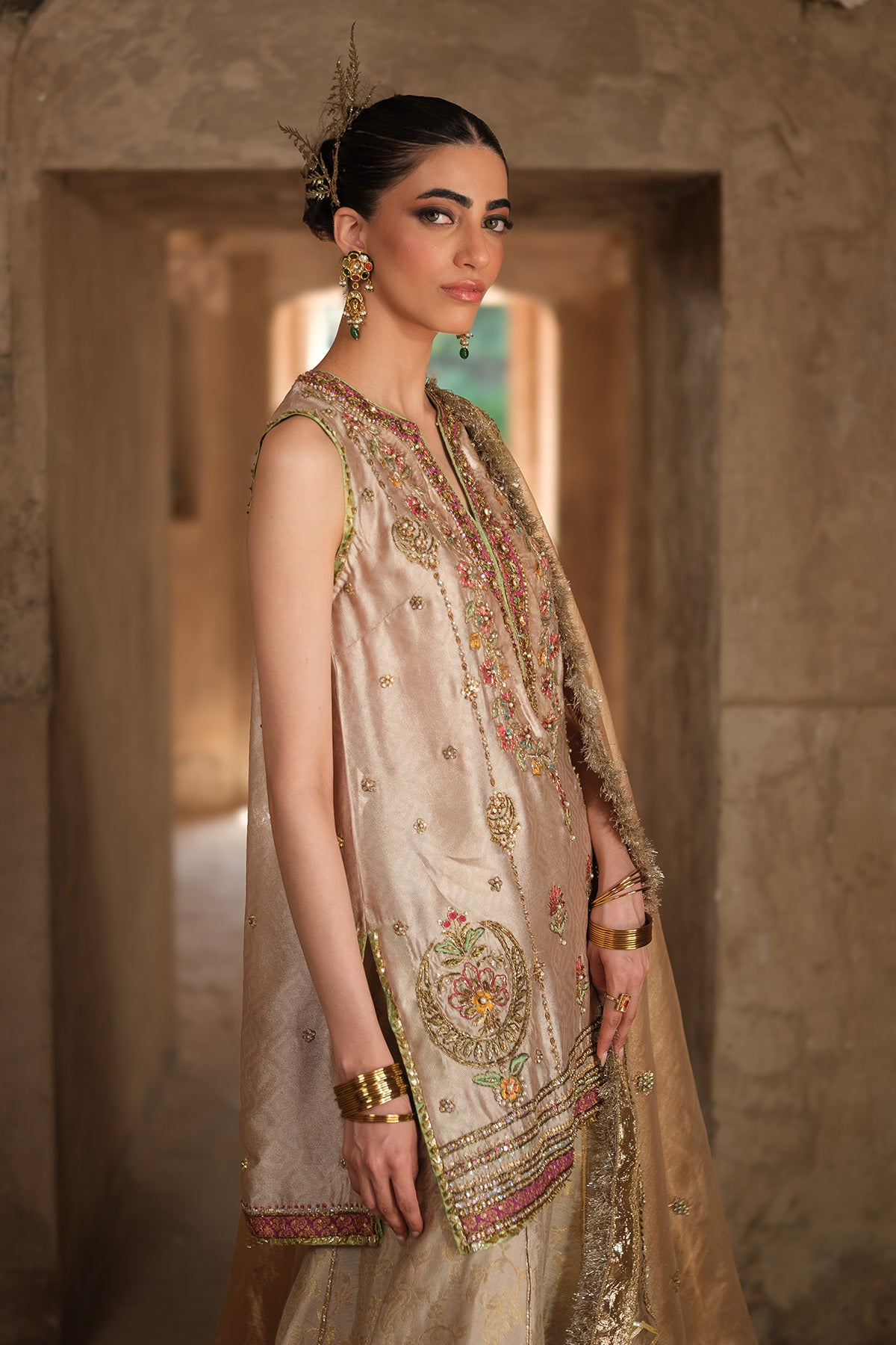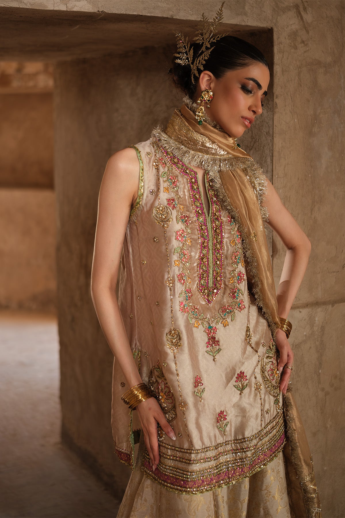 This chic beige ensemble features a tissue silk short shirt with velvet detailing, adorned with intricate zardozi and resham floral motifs. The hemline is finished with elegant lappas and jamawar accents, while flared jamawar pants with embroidered floral hems and lappa finishing complete the refined, graceful look. NOTE: Duppata price is not included.