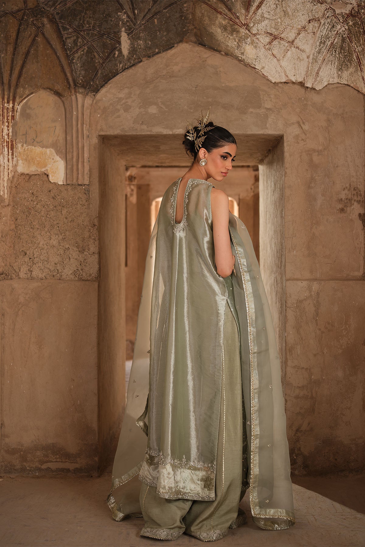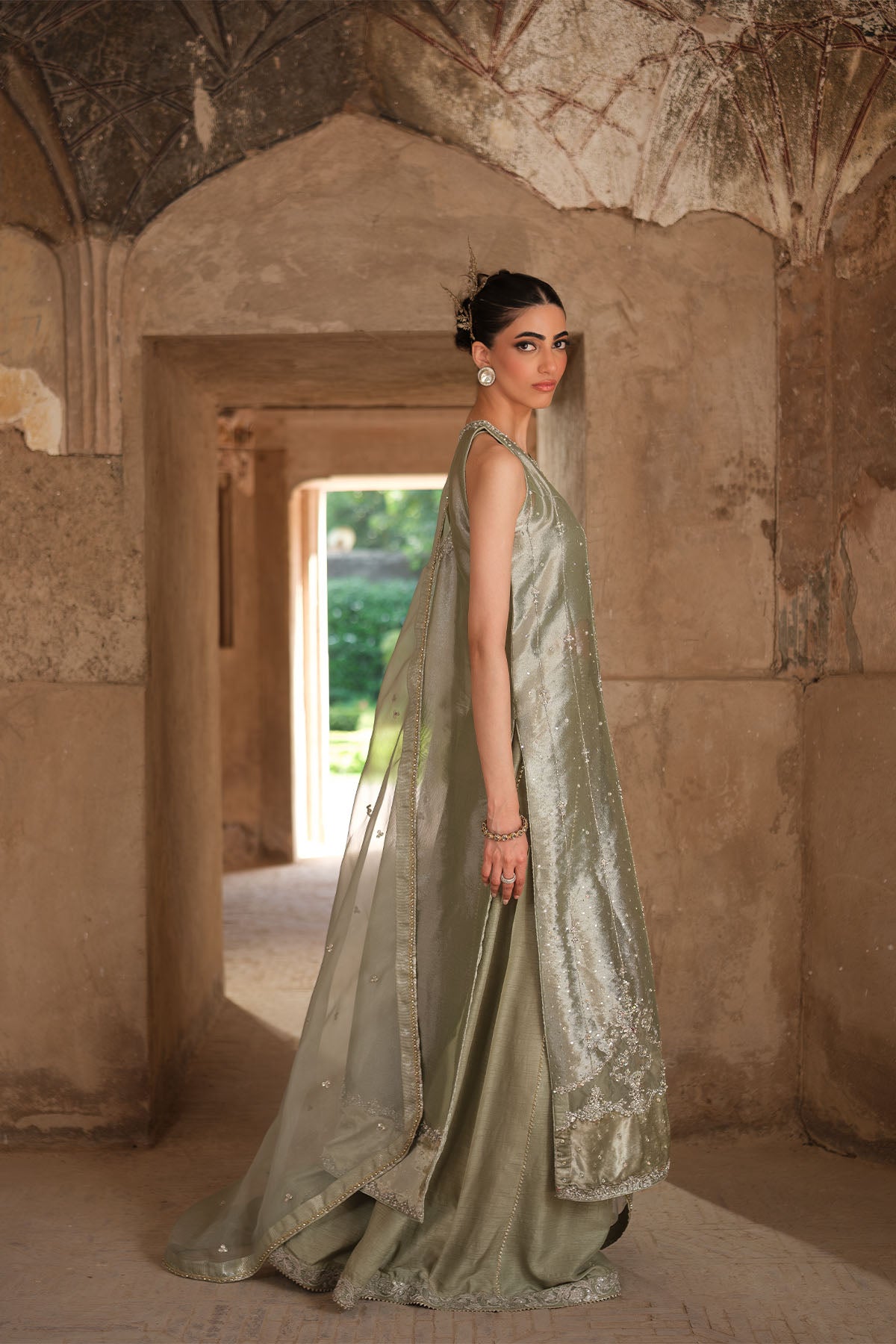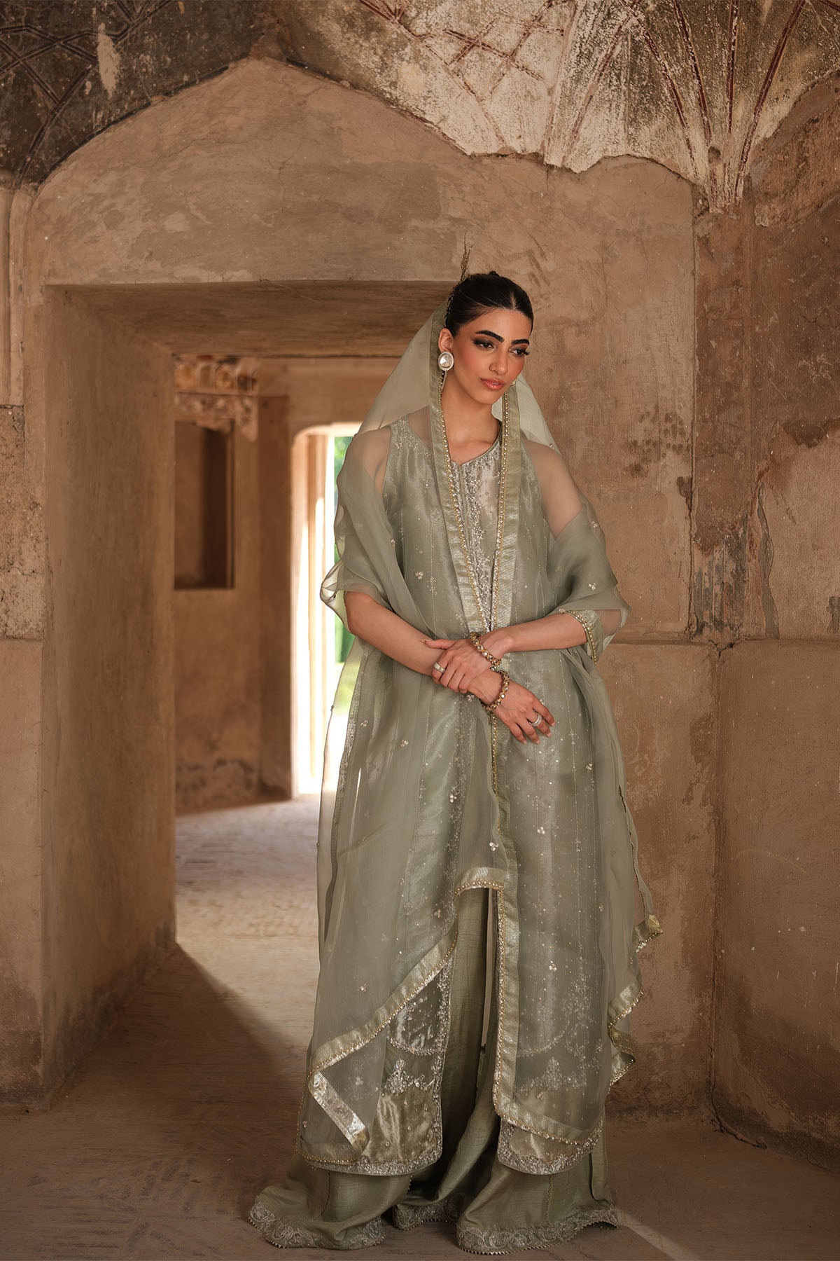 This elegant mint green ensemble features a front-open organza shirt with silver zardozi work and velvet accents. Flared raw silk pants with embroidered borders and lace inserts add charm, while the organza dupatta, adorned with zardozi and lace detailing, completes the graceful look. NOTE: Duppata price is not included.