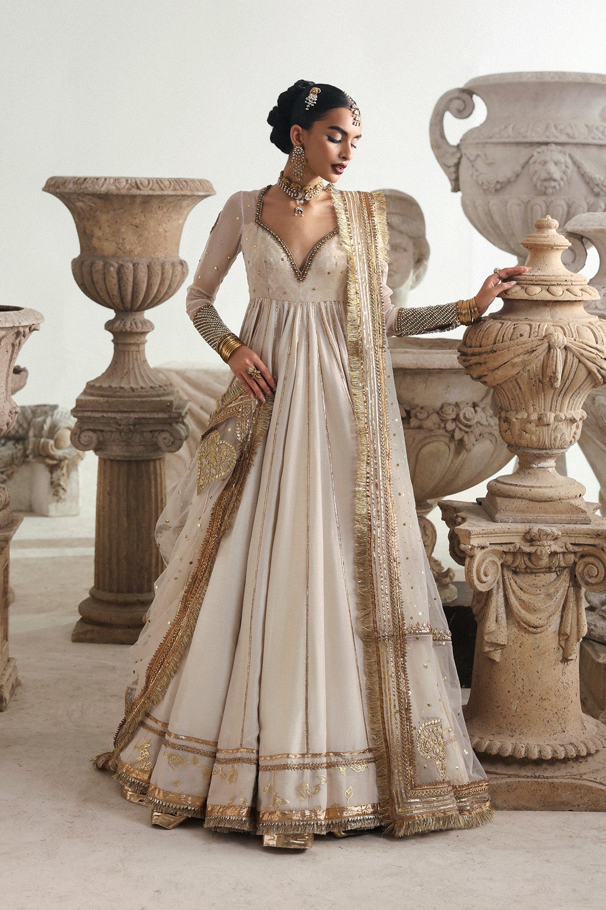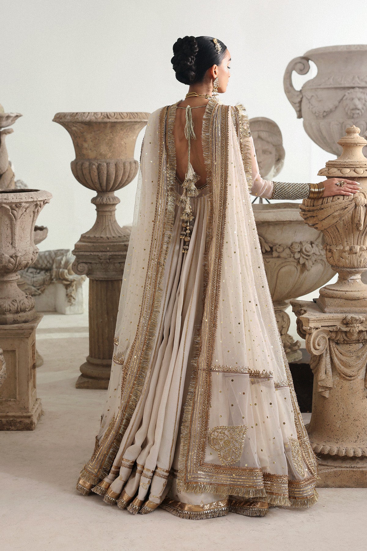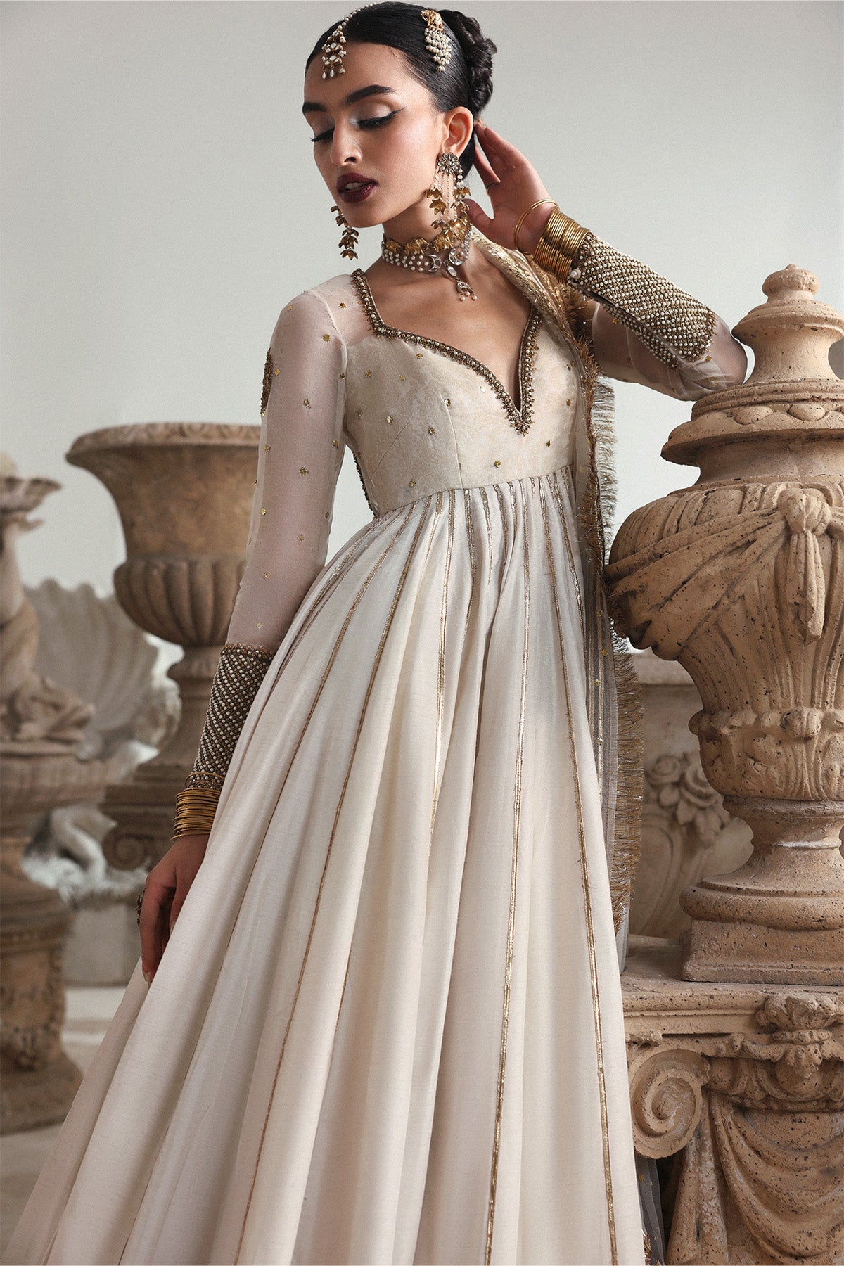 An opulent ivory floor-length peshwas paired with a voluminous lehenga . The sheer organza bodice, lined with golden jamawar, features a deep neckline and kamdani work, while the full sleeves are finished with pearl and zardozi detailing. Flowing Korean silk panels, joined with golden lappas, create graceful movement, with the wide hem elevated by a foil-printed border. An ivory lehenga underneath enhances the silhouette’s grandeur, while the dupatta, bordered with leaf motifs and kiran lace, completes this regal and timeless look. NOTE: Duppata price is not included.
