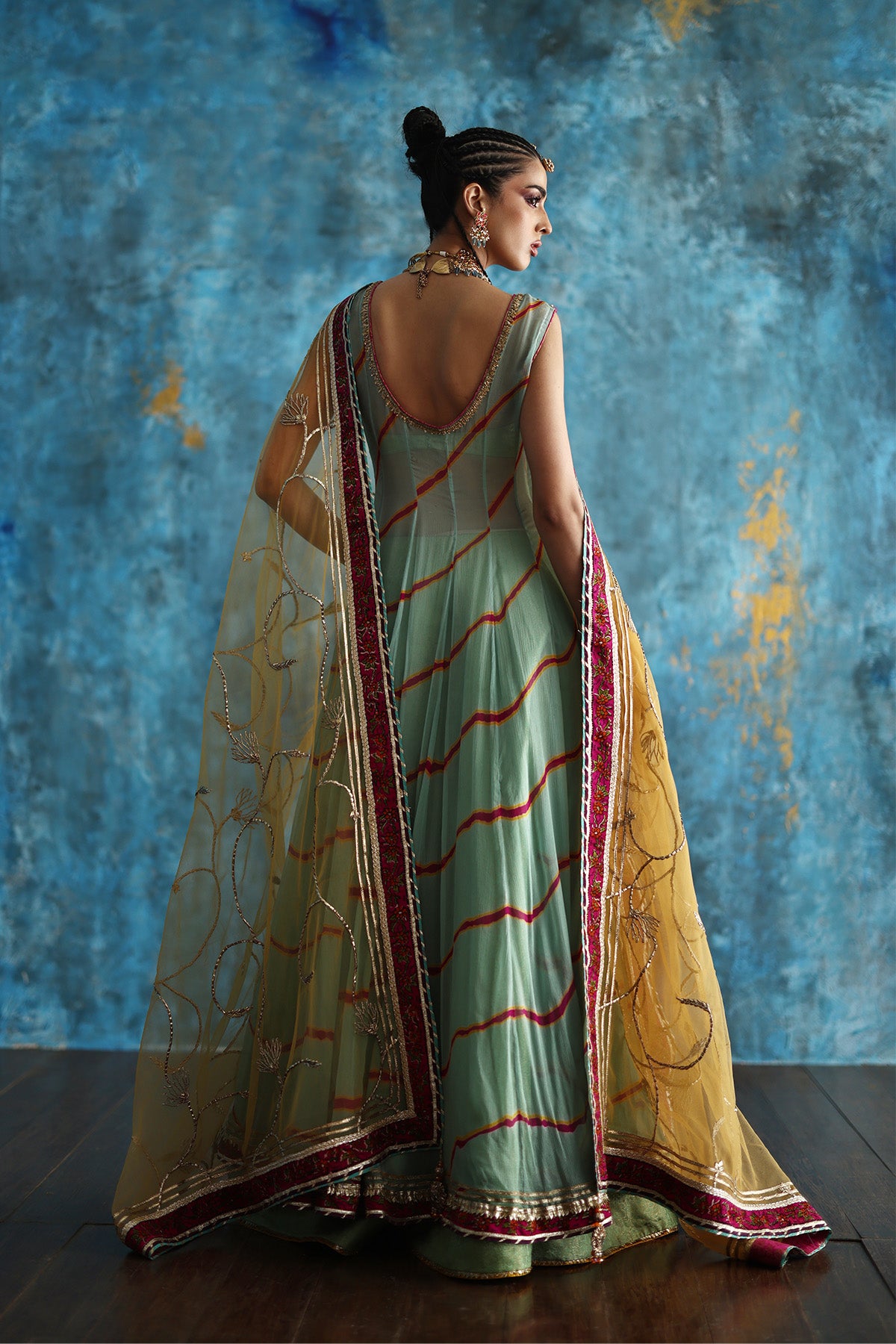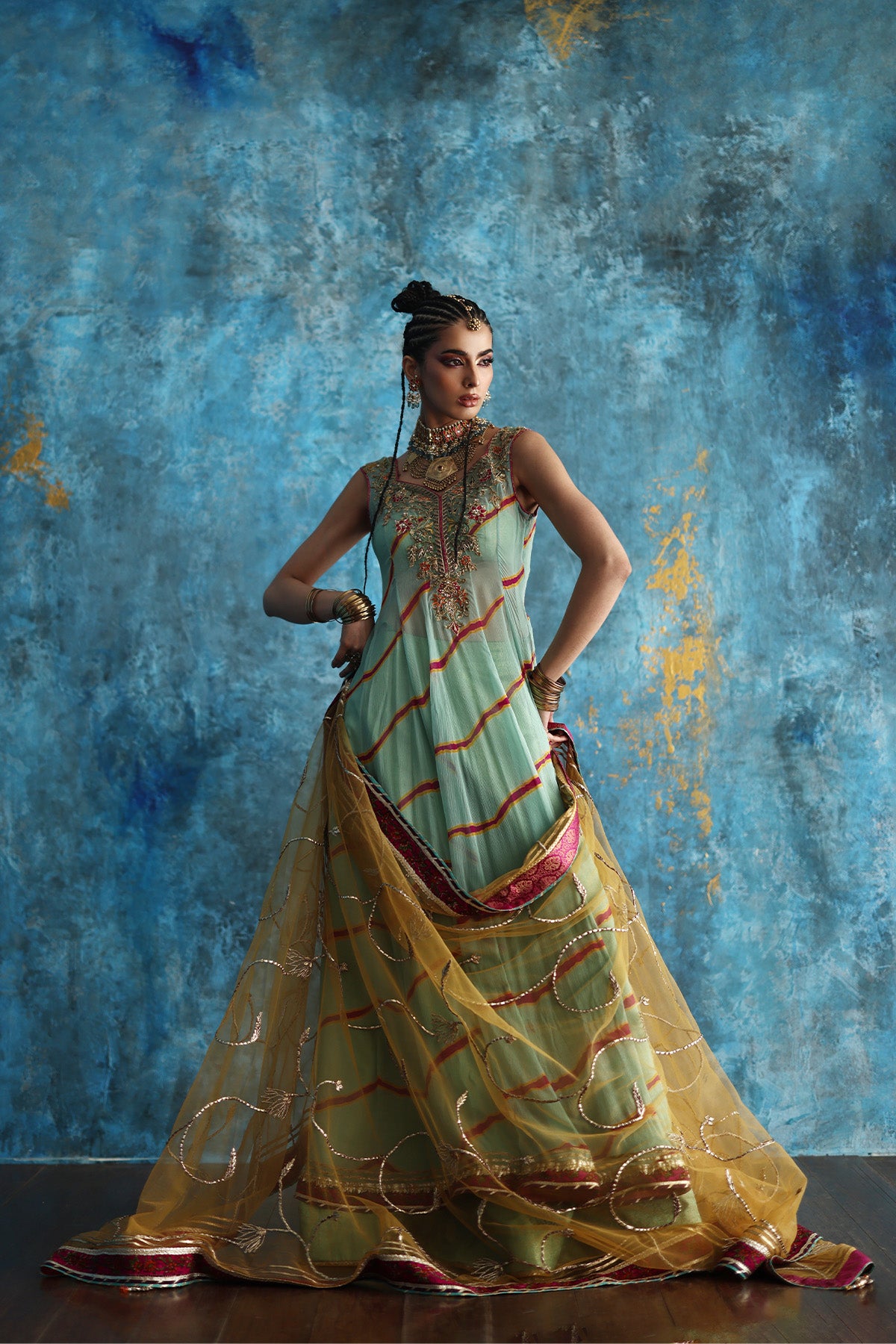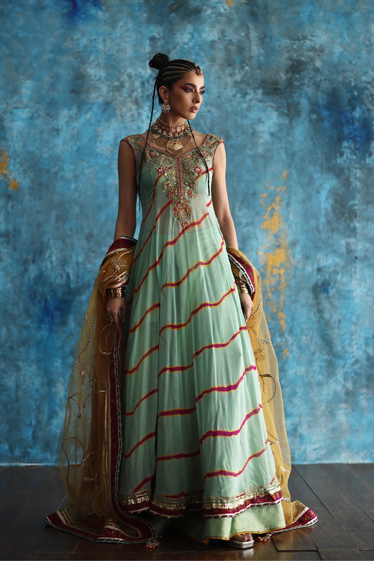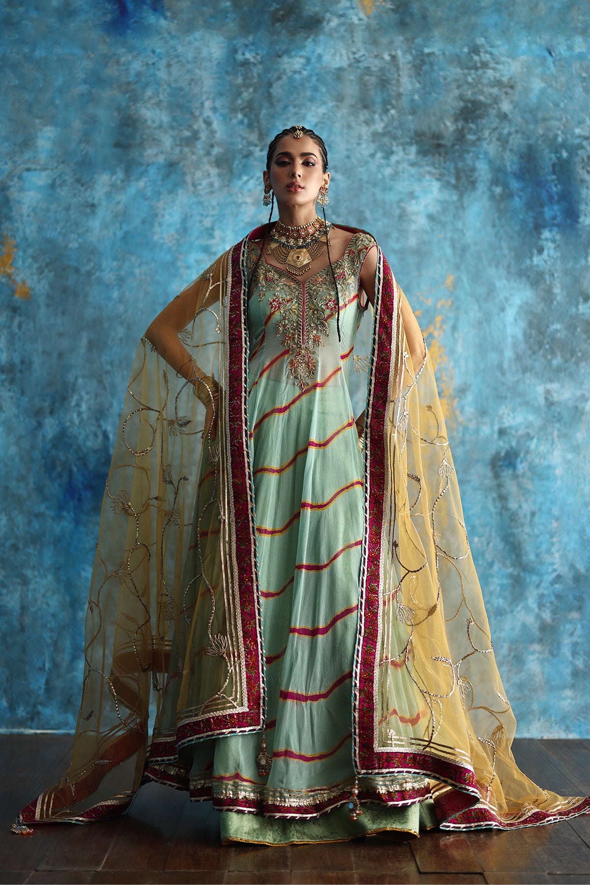 Crafted in flowy chiffon with a long, flared silhouette, it rests beautifully over a structured jamawar lehenga that adds graceful volume beneath. Mustard and pink accents infuse vibrance, perfectly tied together with a complementing mustard dupatta.