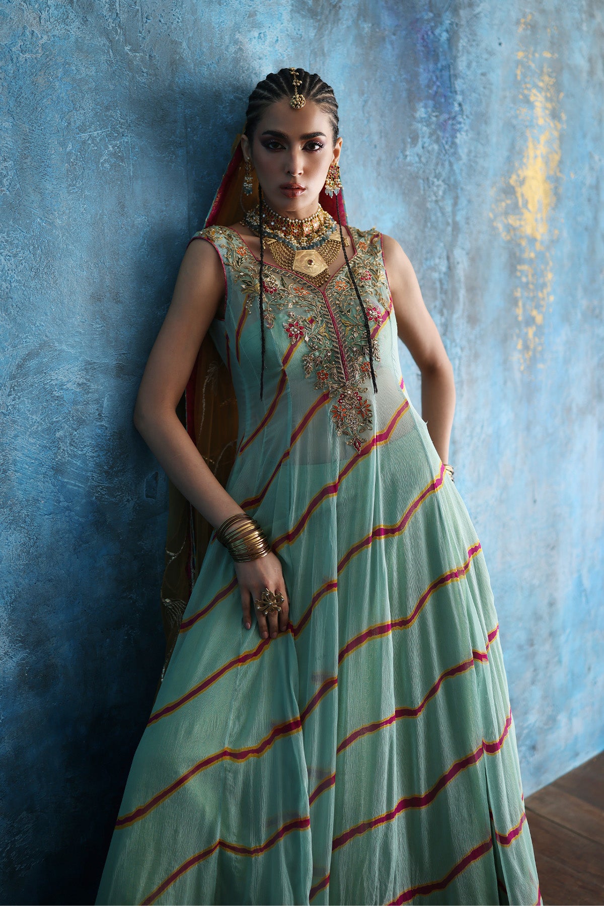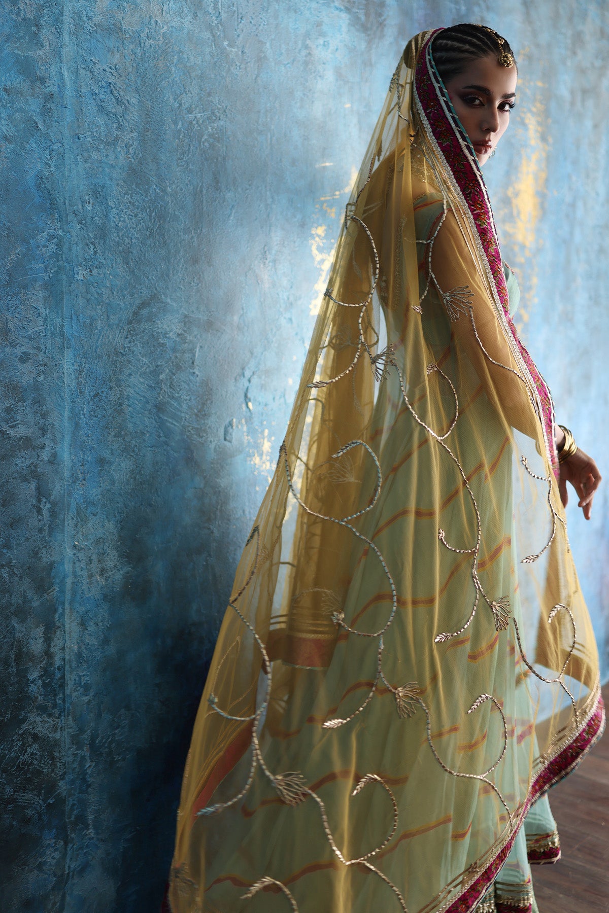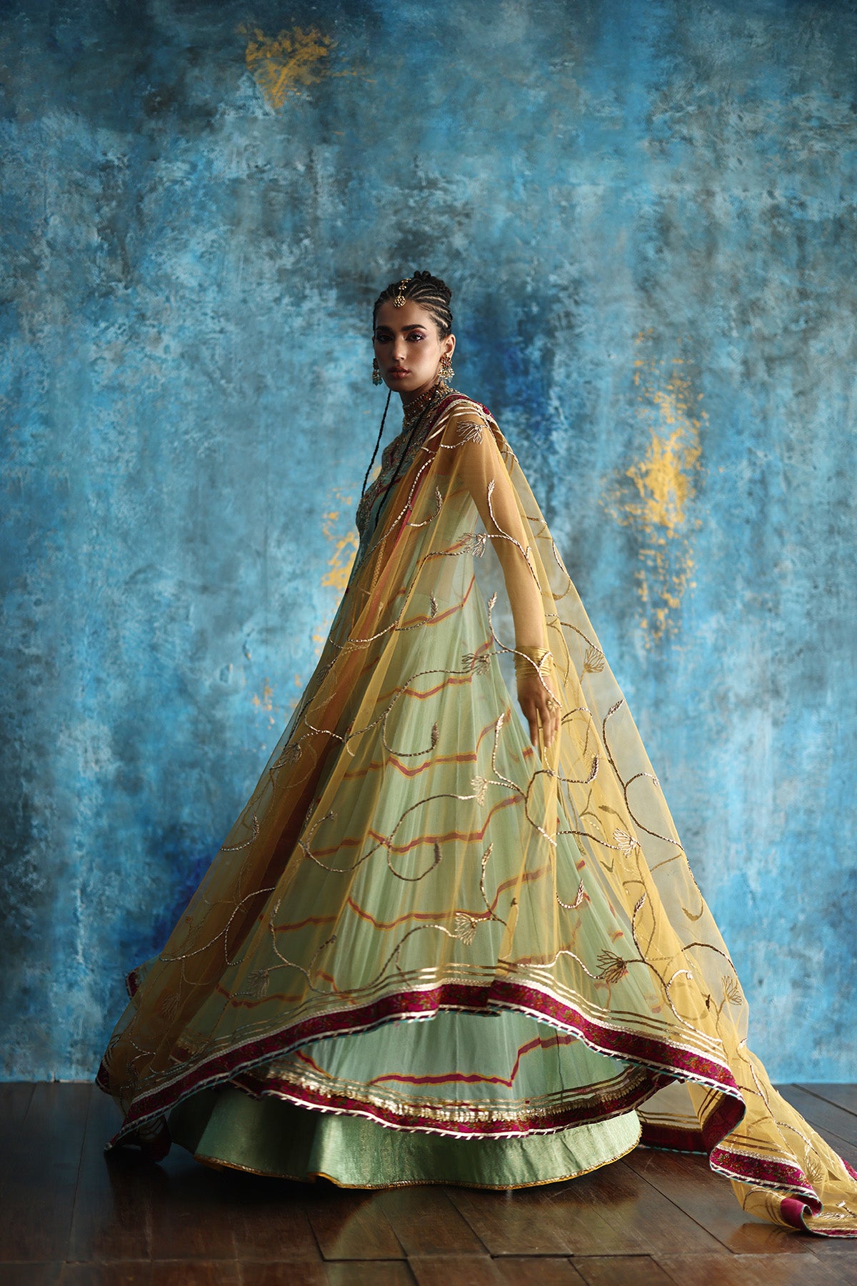 Intricate resham embroidery and antique gold zardozi illuminate the elongated neckline, while handcrafted block-printed pattis enrich the borders with artisanal charm. The airy net dupatta, adorned with an all-over gota jaal, adds a festive shimmer. Note: Duppata price is not included. Dupatta Code: CB-D-14-25-1 Dupatta Price 69,000/-)
