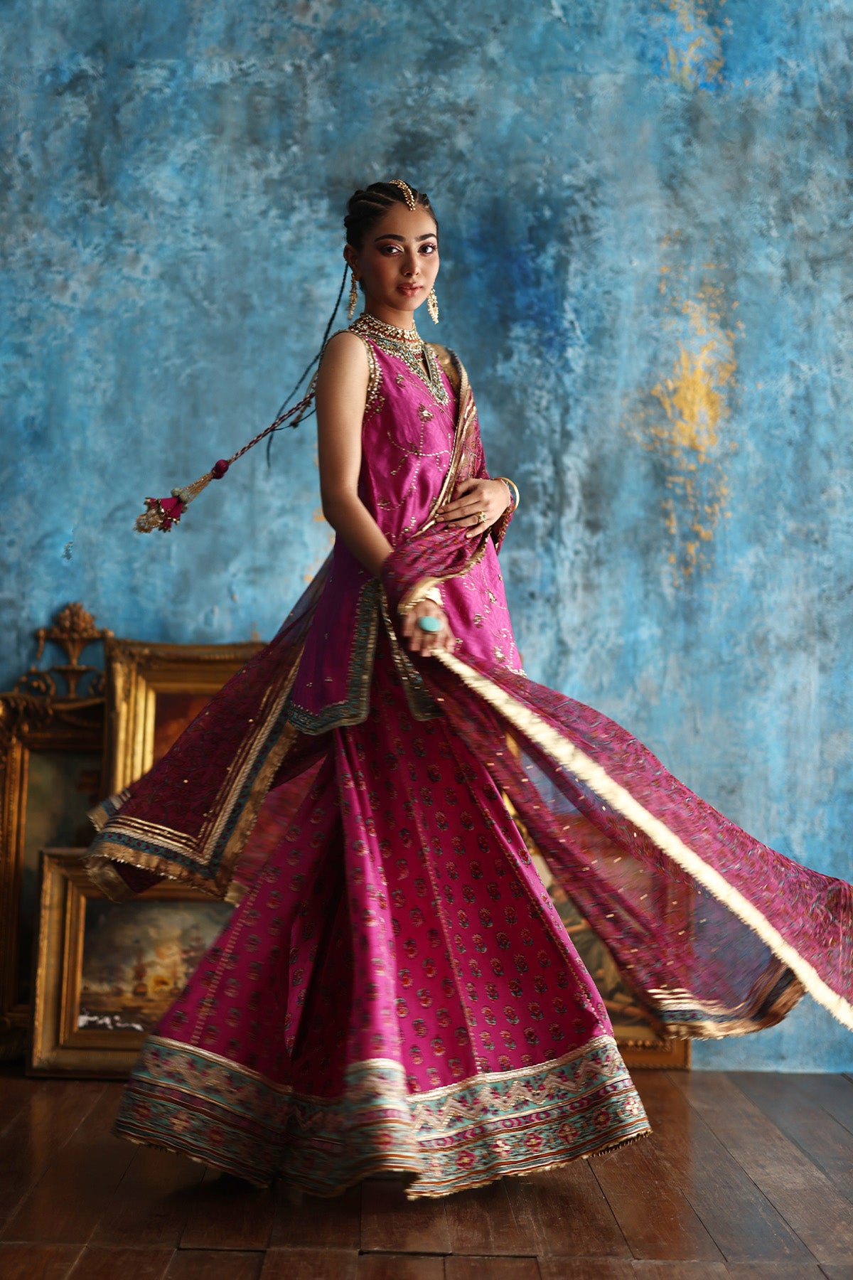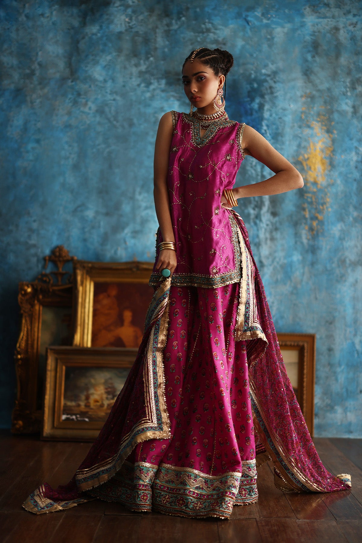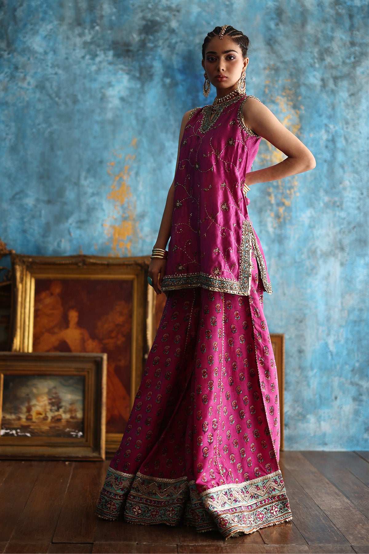 This fuchsia pink short A-line kurta, crafted in delicate Mukesh organza, is brought to life with coloured thread embroidery and a block-printed border, richly finished with gota and touches of zardozi. Paired with a contrasting purple jamavar farshi shalwar, detailed with coordinating threadwork and block-printed gota borders at the hem, the ensemble strikes a perfect festive balance. A flowing chiffon leheriya dupatta, subtly enhanced with gota work Note: Duppata price is not included. Dupatta Code: CB-D-12-25-1 Dupatta Price 95,000/-)