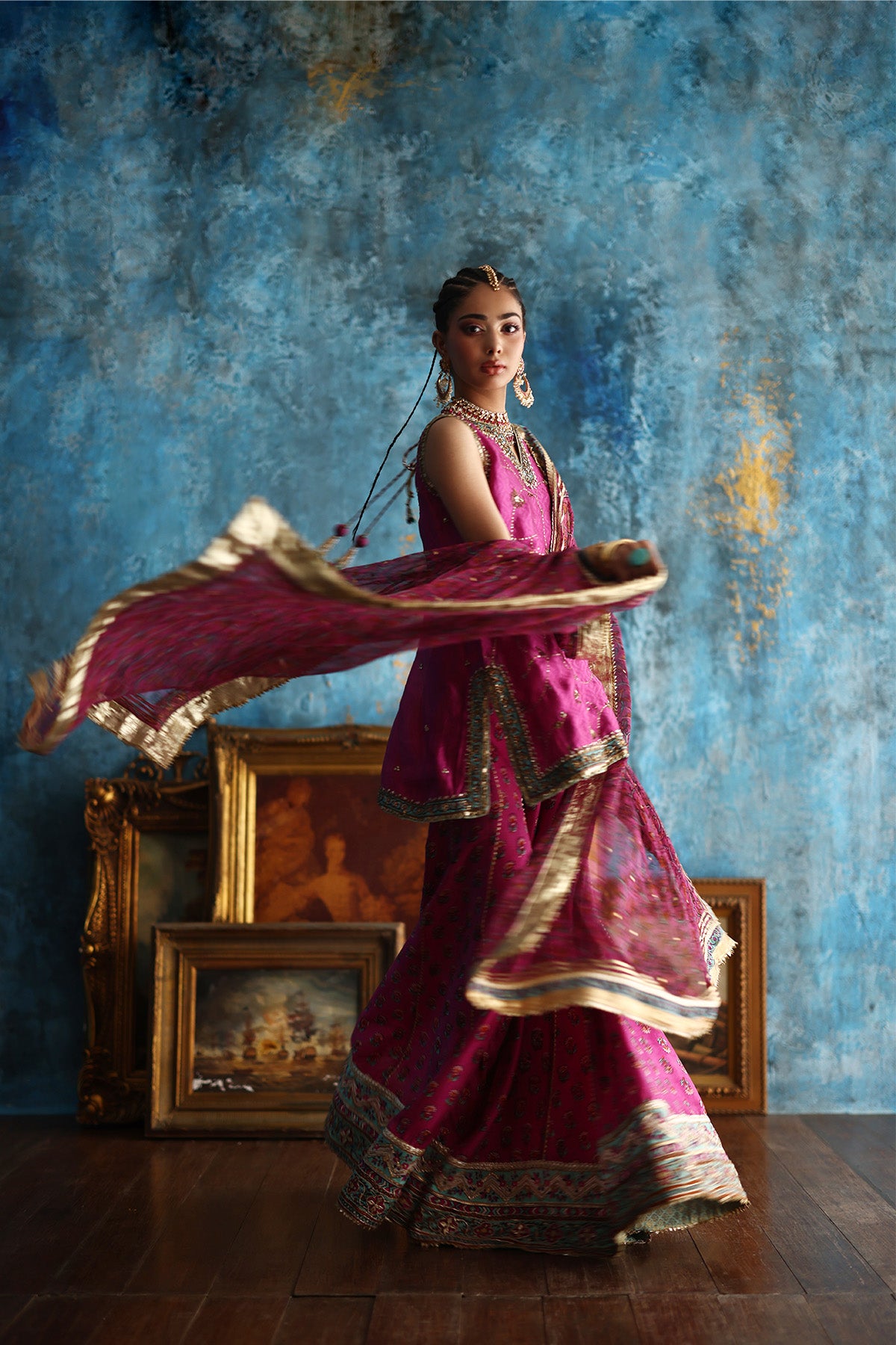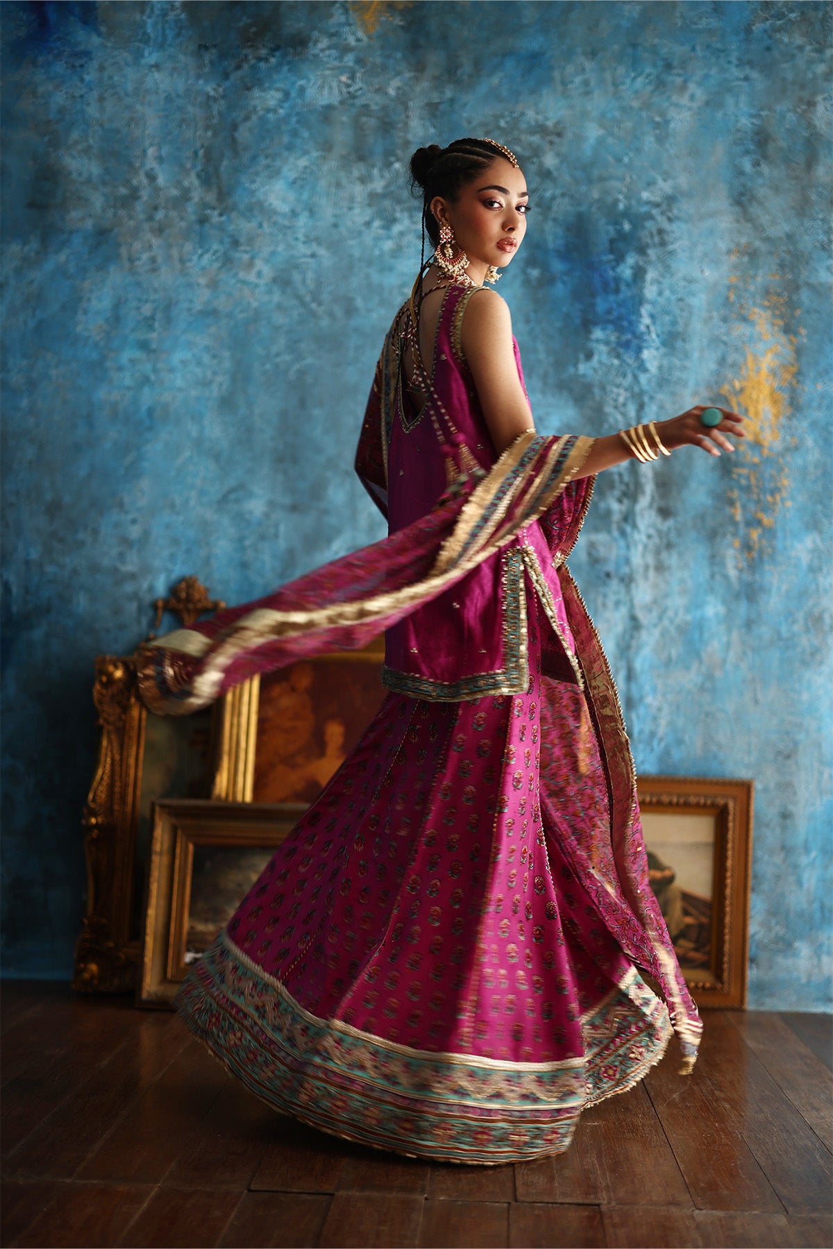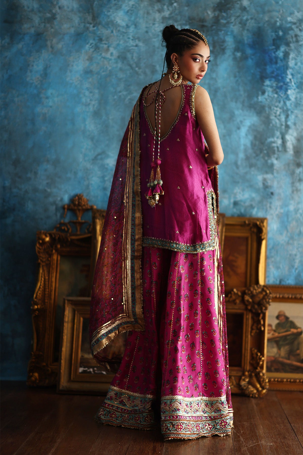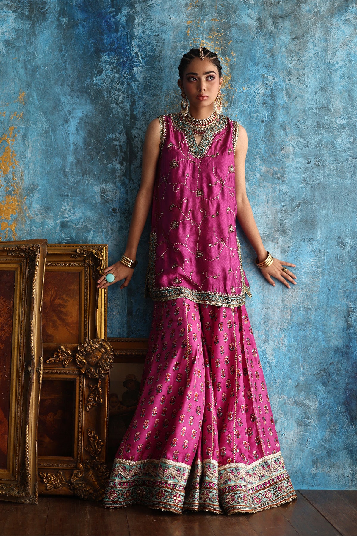 This fuchsia pink short A-line kurta, crafted in delicate Mukesh organza, is brought to life with coloured thread embroidery and a block-printed border, richly finished with gota and touches of zardozi. Paired with a contrasting purple jamavar farshi shalwar, detailed with coordinating threadwork and block-printed gota borders at the hem, the ensemble strikes a perfect festive balance. A flowing chiffon leheriya dupatta, subtly enhanced with gota work Note: Duppata price is not included. Dupatta Code: CB-D-12-25-1 Dupatta Price 95,000/-)