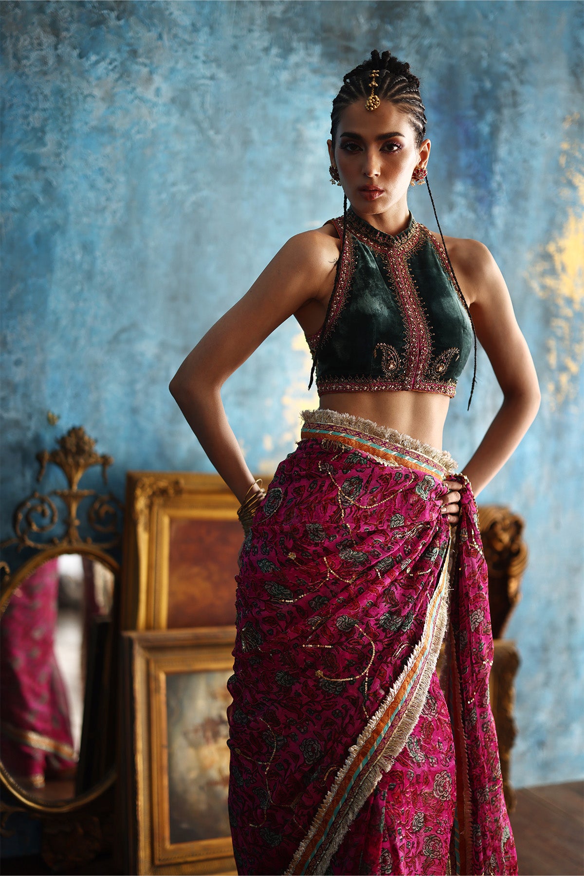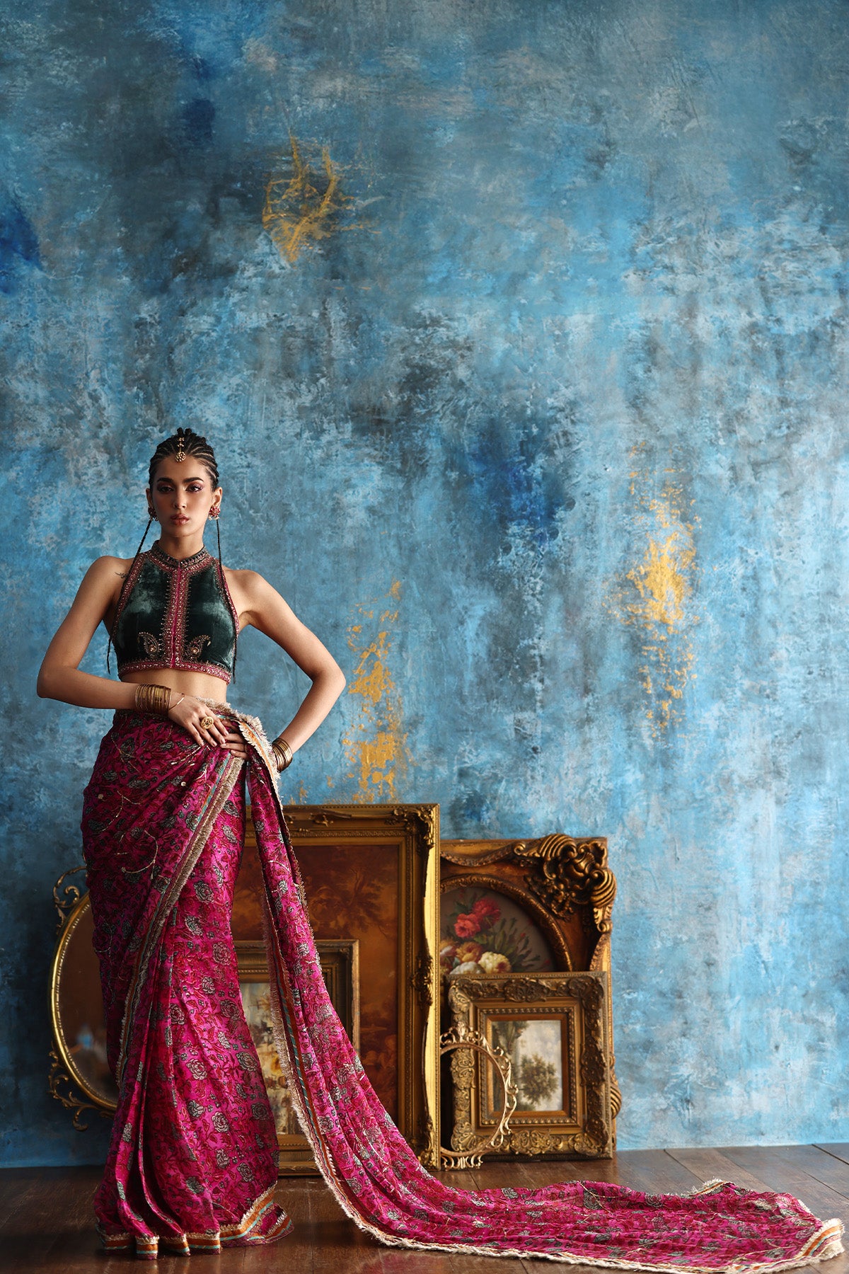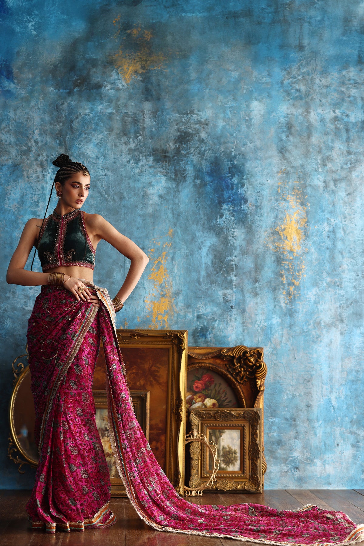 This front-open blouse, crafted in plush velvet and sheer organza, is delicately adorned with zardozi and gota work, highlighted by contrasting pink patchwork pattis along the neckline, armholes, and waist. Paired with a fluid chiffon saree in a vivid pink hue, the silhouette is elevated with all-over block printing, while the pallu shimmers with a refined sequin jaal. Finished with rich jamawar borders, layered gota, Indian lapas, and kiran detailing, the ensemble comes together beautifully over a silk petti coat