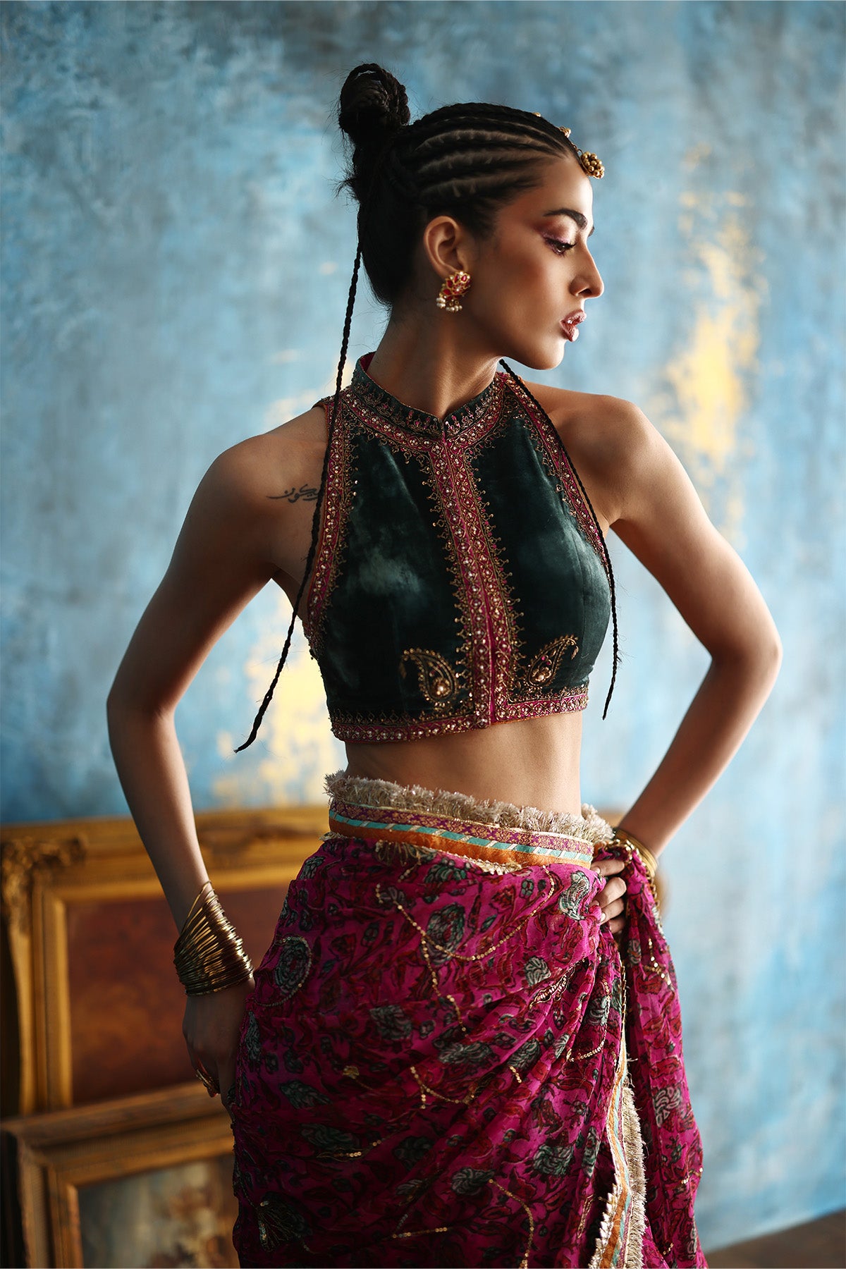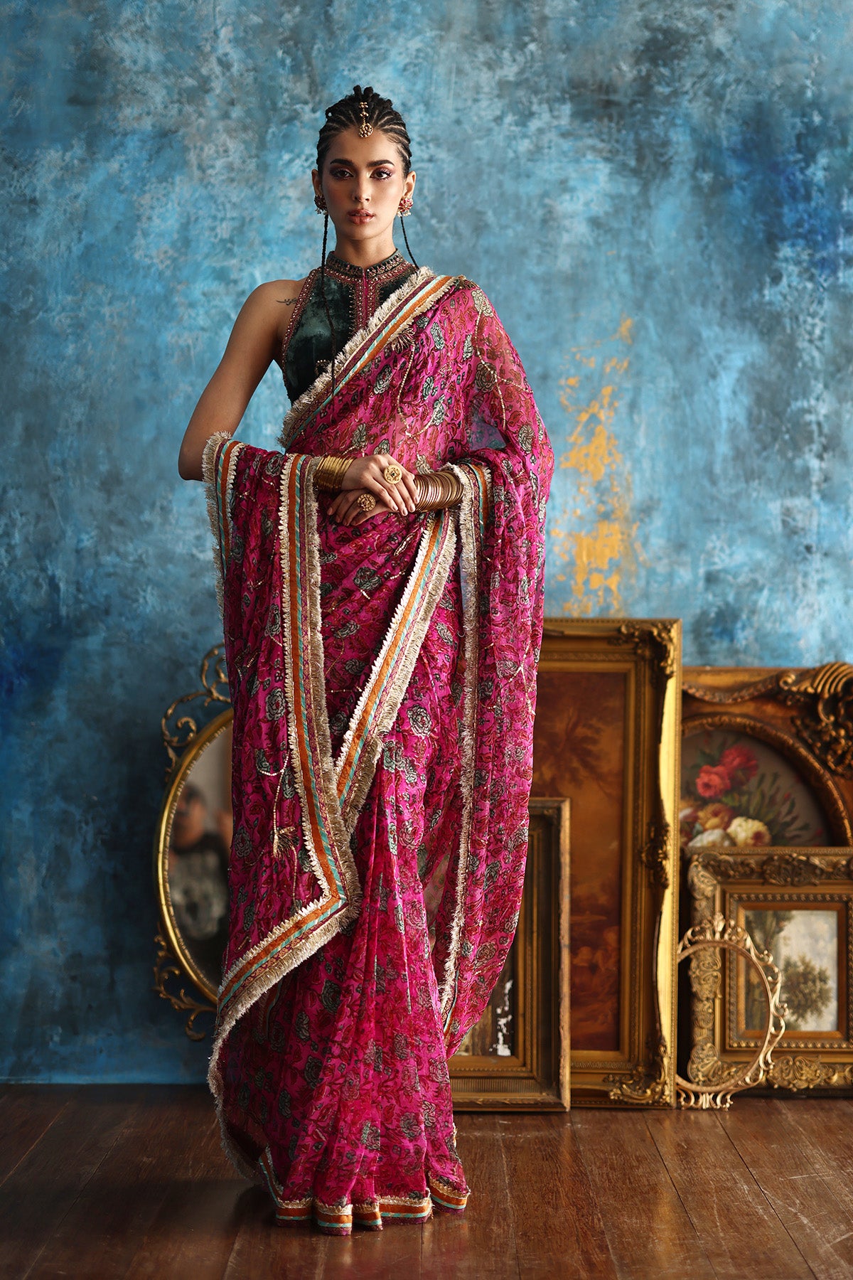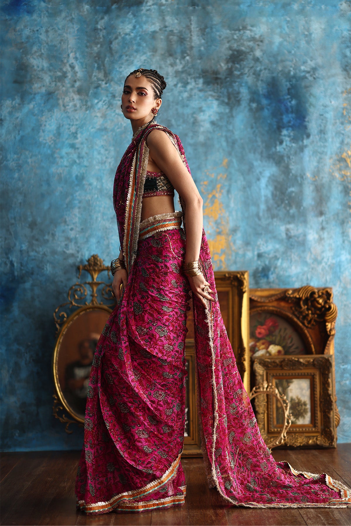 This front-open blouse, crafted in plush velvet and sheer organza, is delicately adorned with zardozi and gota work, highlighted by contrasting pink patchwork pattis along the neckline, armholes, and waist. Paired with a fluid chiffon saree in a vivid pink hue, the silhouette is elevated with all-over block printing, while the pallu shimmers with a refined sequin jaal. Finished with rich jamawar borders, layered gota, Indian lapas, and kiran detailing, the ensemble comes together beautifully over a silk petti coat