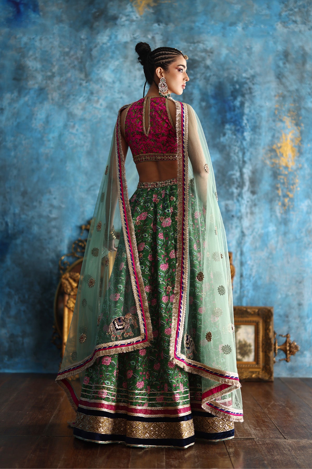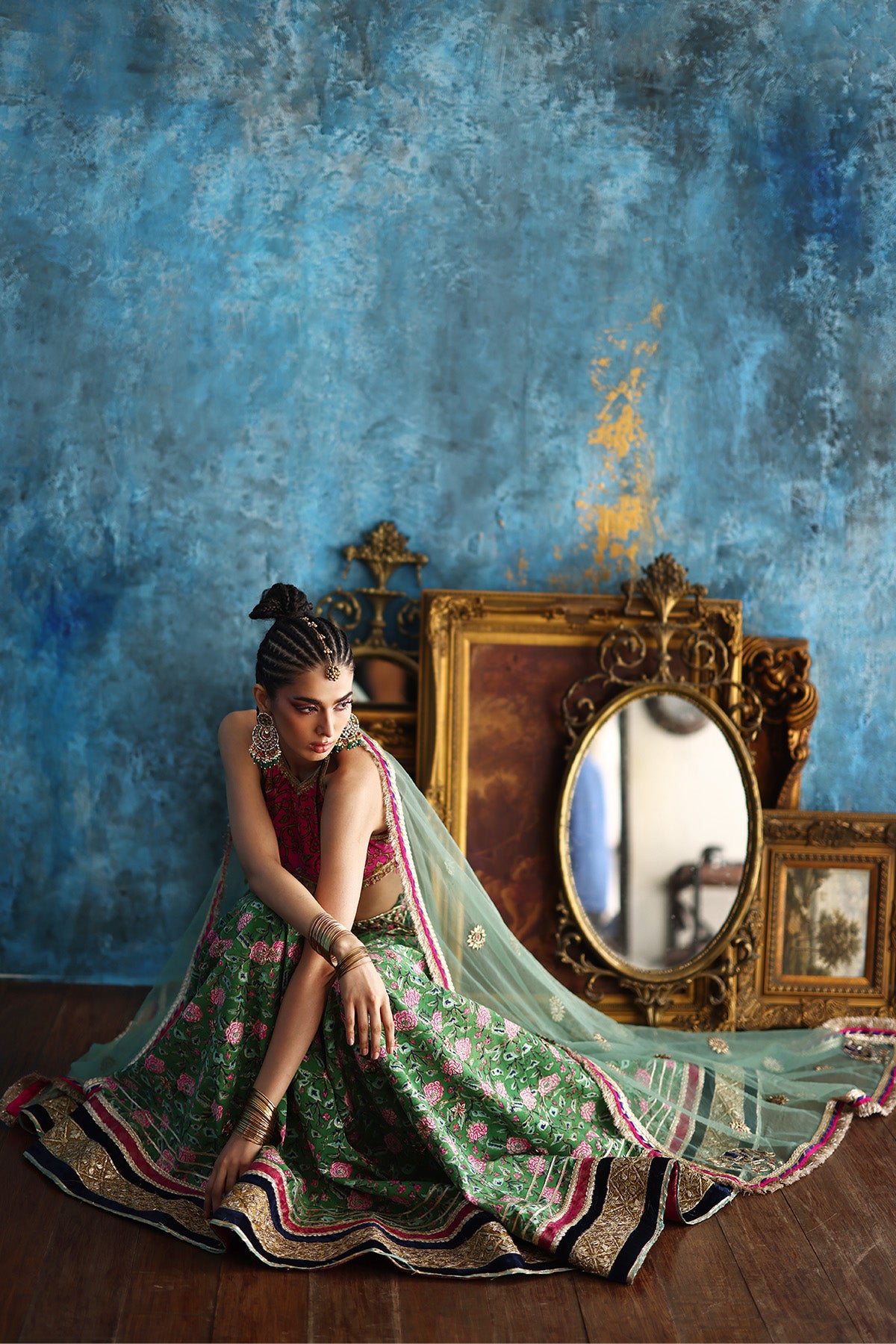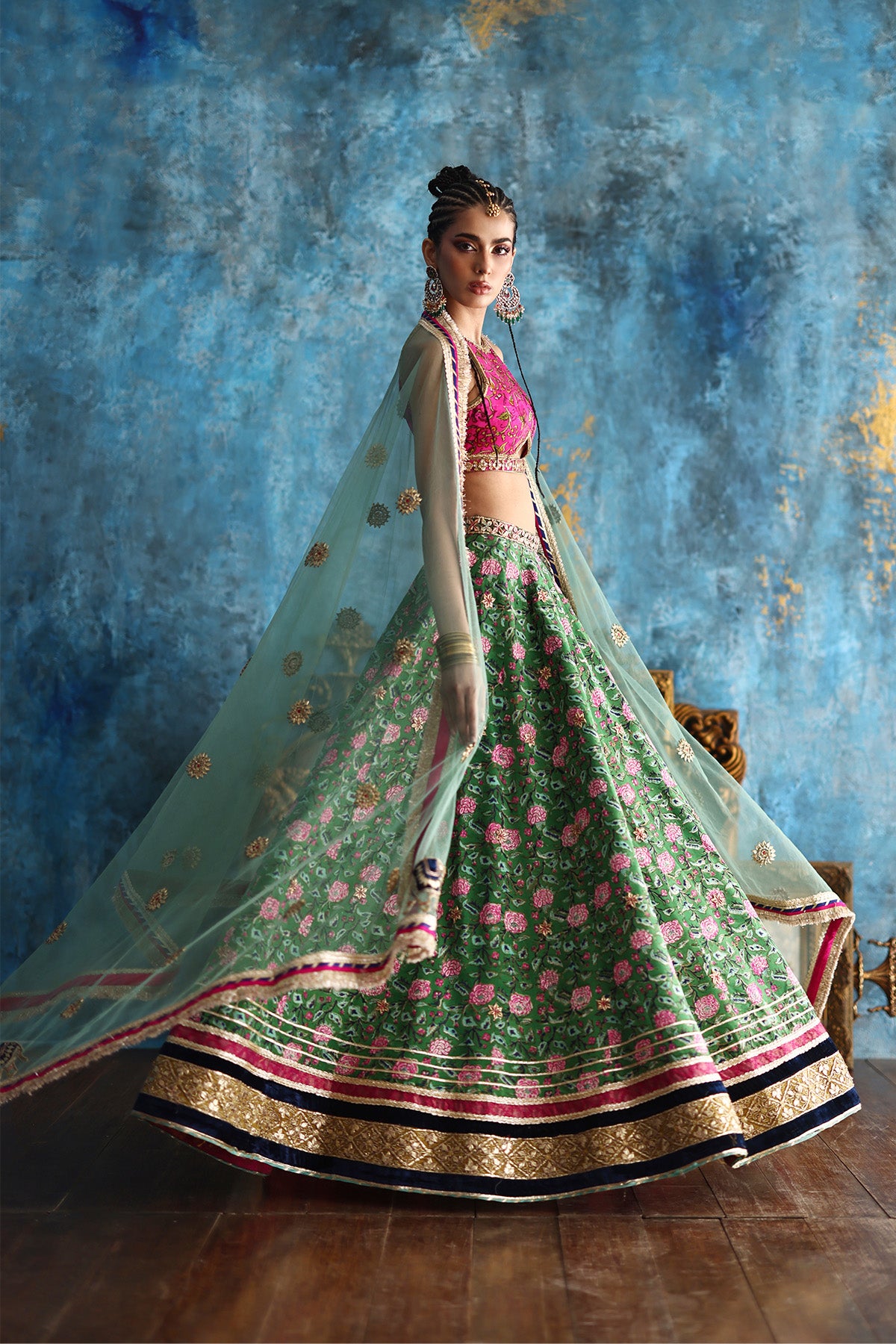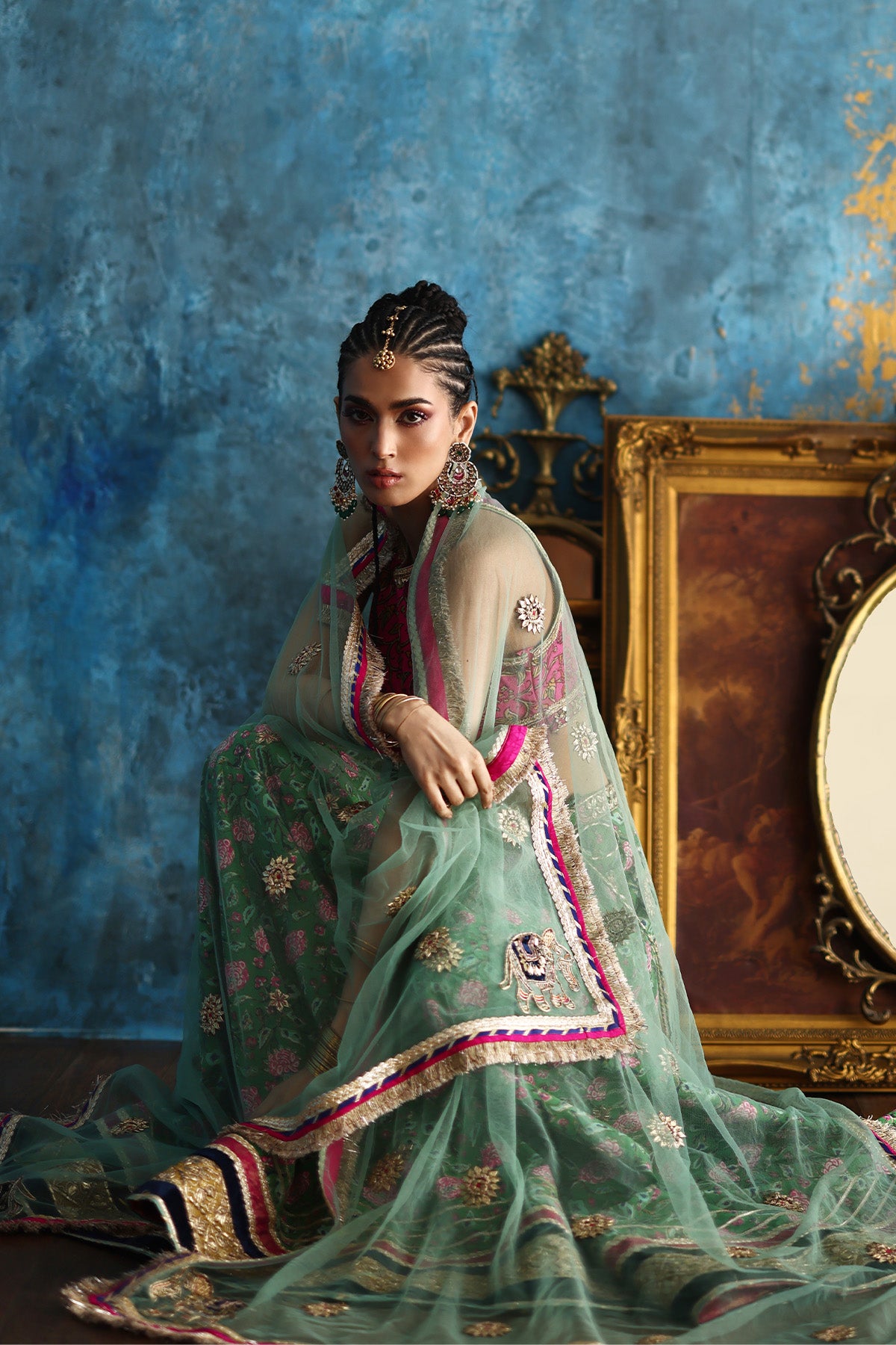 This parrot green block-printed lehnga is beautifully elevated with intricate embroidered gota along the waistline and borders, finished with charming handmade woollen tassels. It is paired with a contrasting pink block-printed choli, richly hand-embroidered with dabka, zardozi, and gota detailing along the neckline, hem, and corners. Completing the ensemble is a soft sea-green net dupatta, adorned with gota chhatta, hand-embellished elephant motifs, delicate patches, and kiran edging—bringing together playful tradition and festive elegance in perfect harmony. Note: Duppata price is not included. Dupatta Code: CB-D-10-25-1 Dupatta Price 59,000/-)