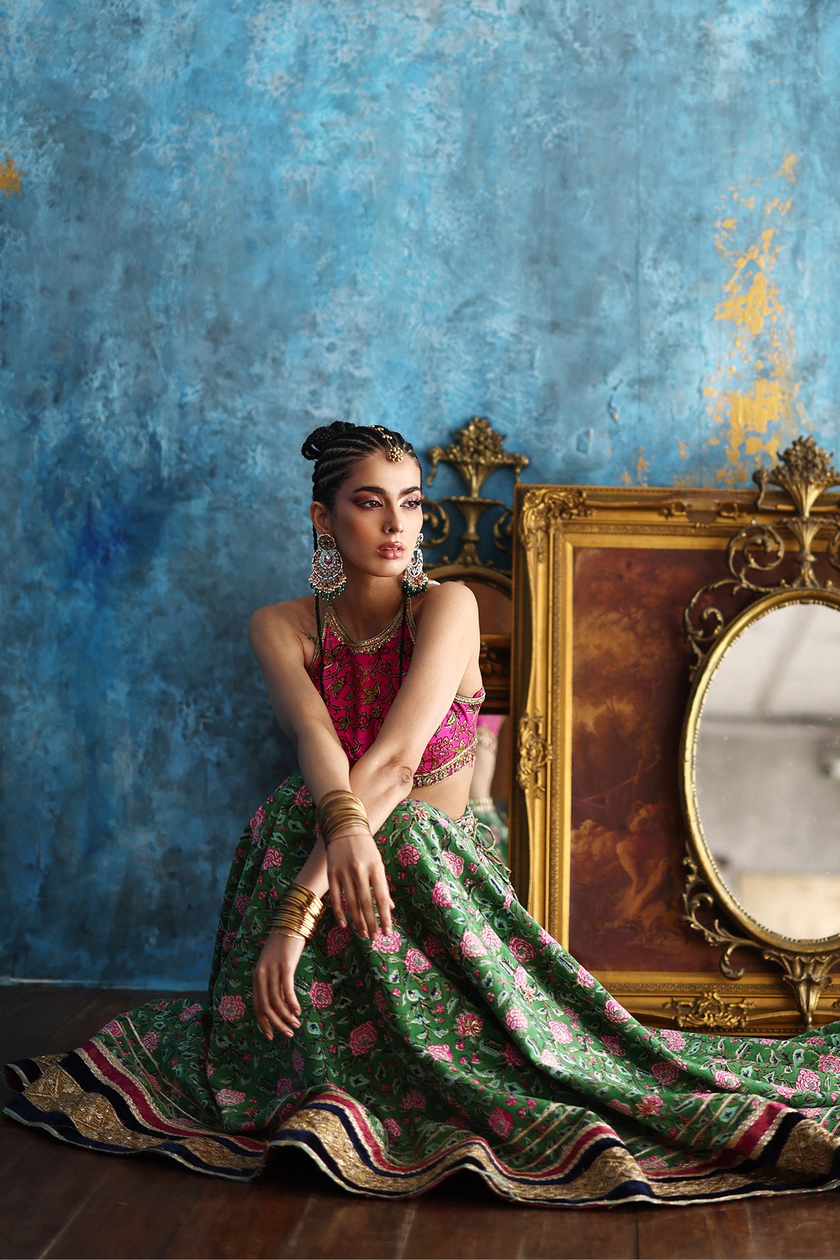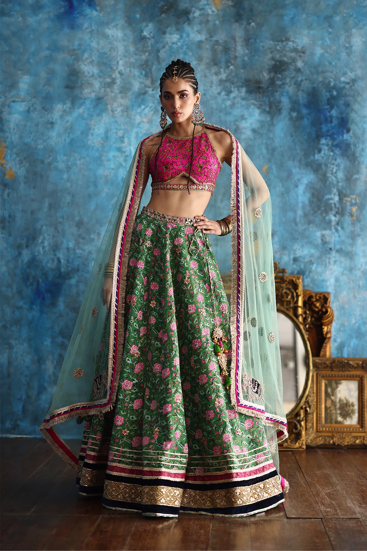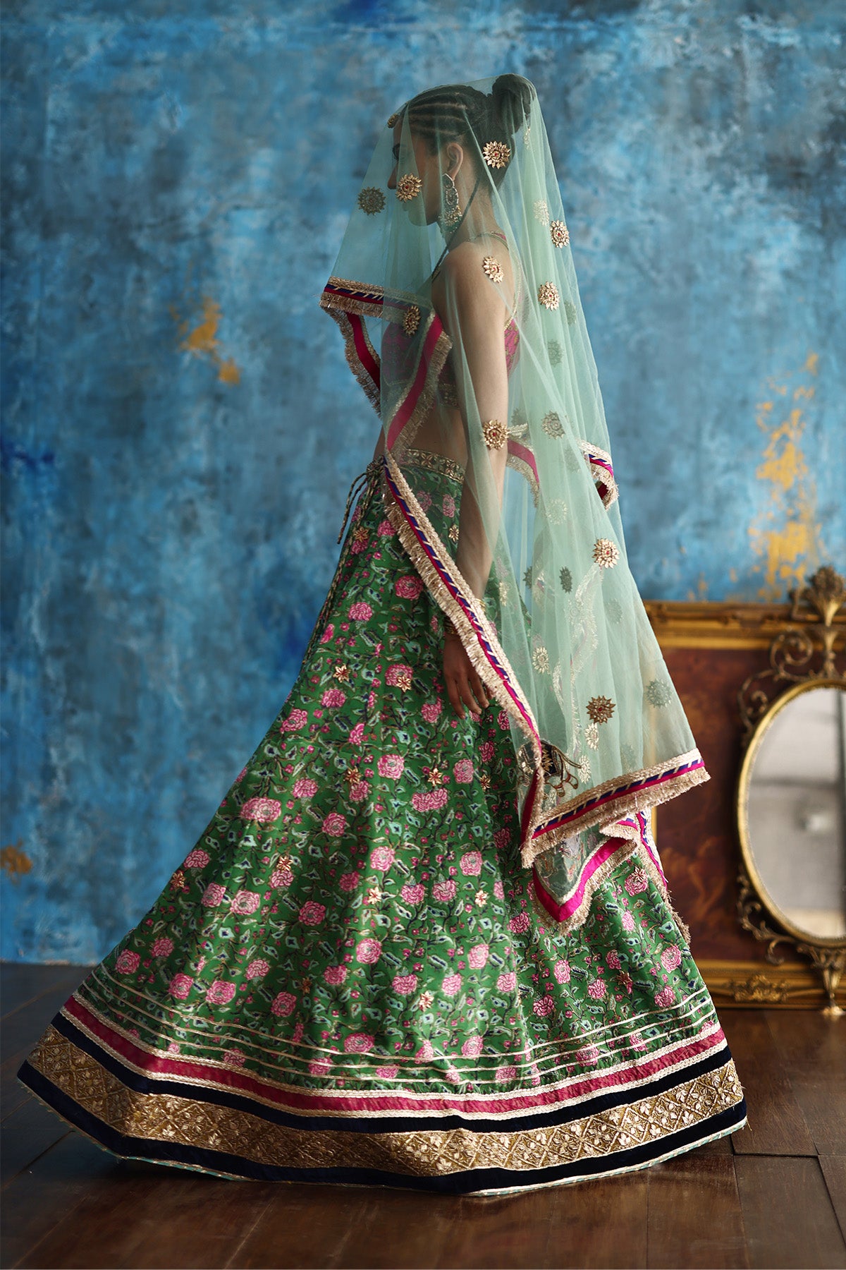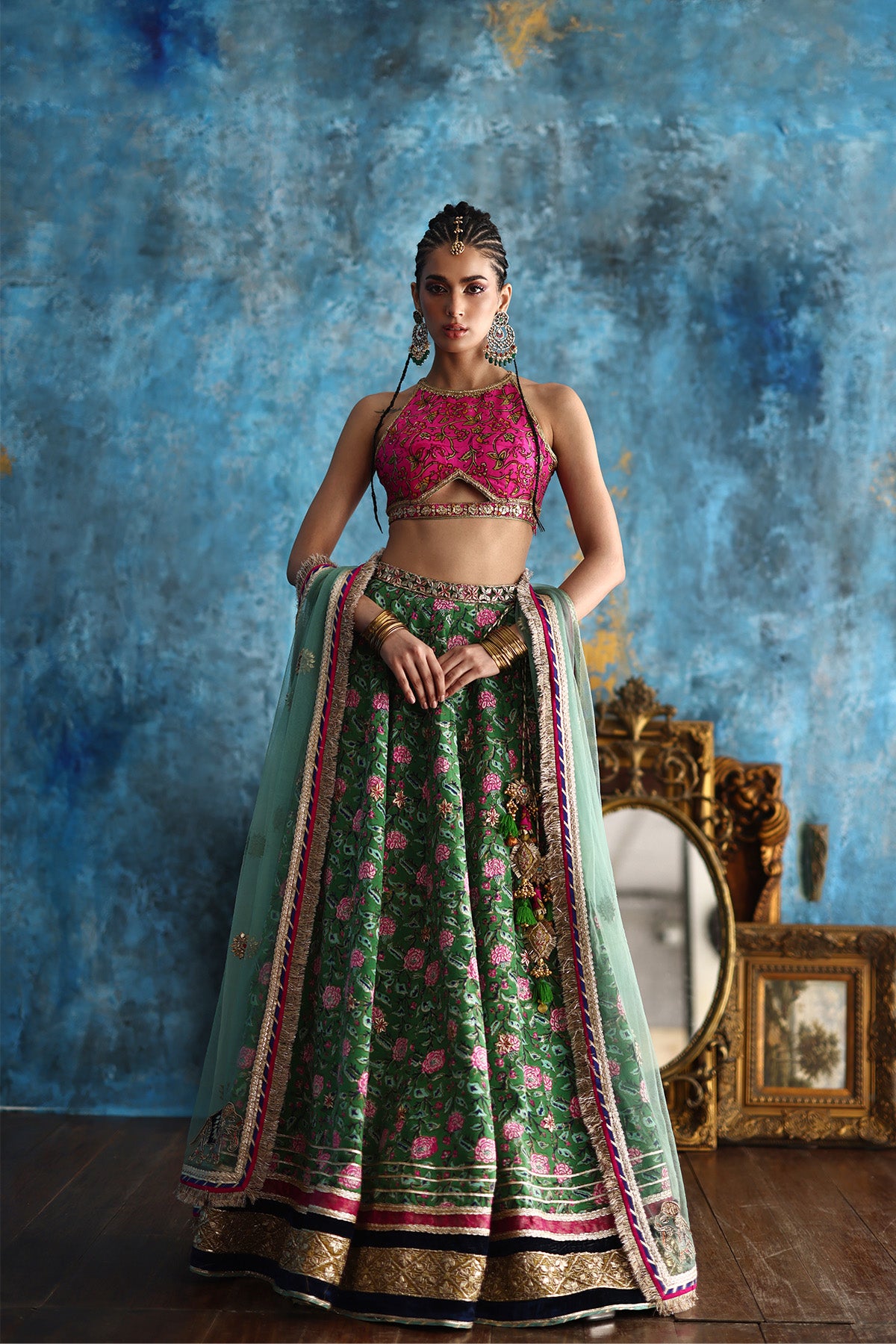 This parrot green block-printed lehnga is beautifully elevated with intricate embroidered gota along the waistline and borders, finished with charming handmade woollen tassels. It is paired with a contrasting pink block-printed choli, richly hand-embroidered with dabka, zardozi, and gota detailing along the neckline, hem, and corners. Completing the ensemble is a soft sea-green net dupatta, adorned with gota chhatta, hand-embellished elephant motifs, delicate patches, and kiran edging—bringing together playful tradition and festive elegance in perfect harmony. Note: Duppata price is not included. Dupatta Code: CB-D-10-25-1 Dupatta Price 59,000/-)