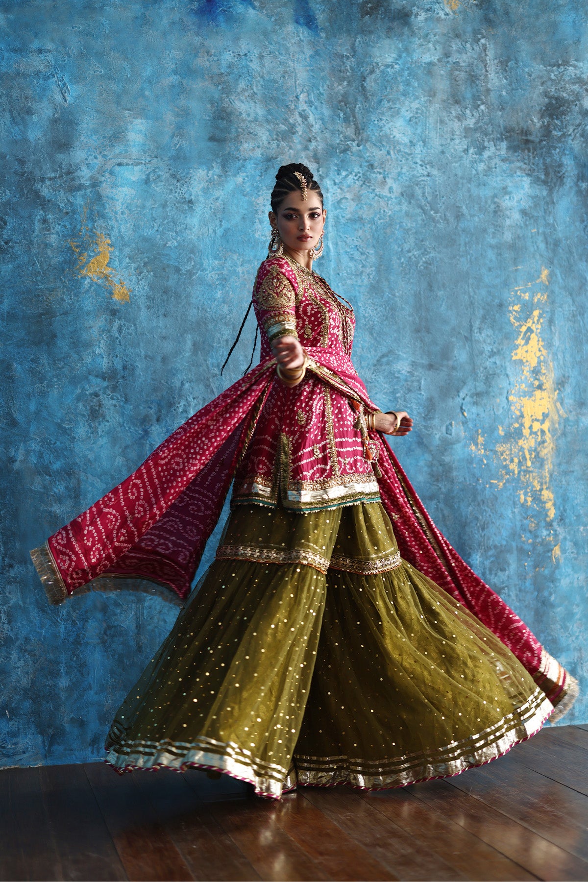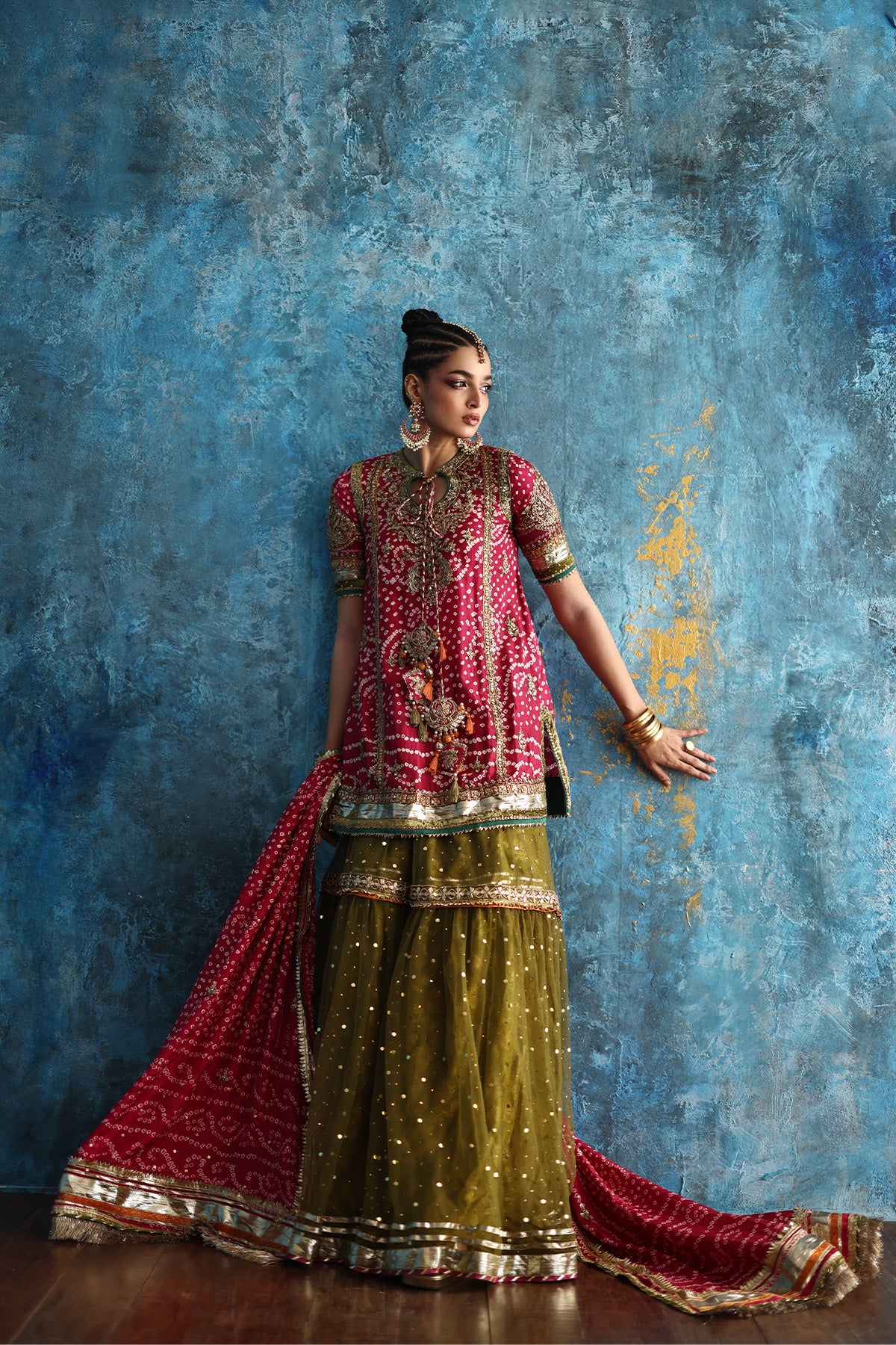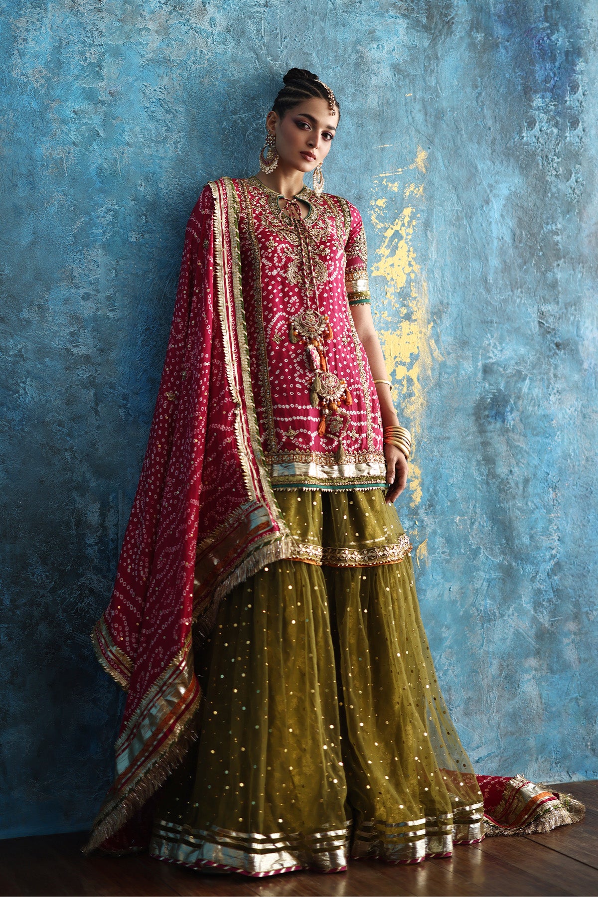 This pomegranate red short A-line chunri kurta is elevated with gota borders, rich velvet pattis, and an intricately zardozi-embellished neckline that adds a regal touch. It is paired with a contrasting olive green net mukesh gharara, delicately enhanced with shimmering gota work and gold lappas for graceful movement. Completing the ensemble is a matching chunri dupatta, hand-embellished with gota detailing and finished with gota lappa and jamavar accents.