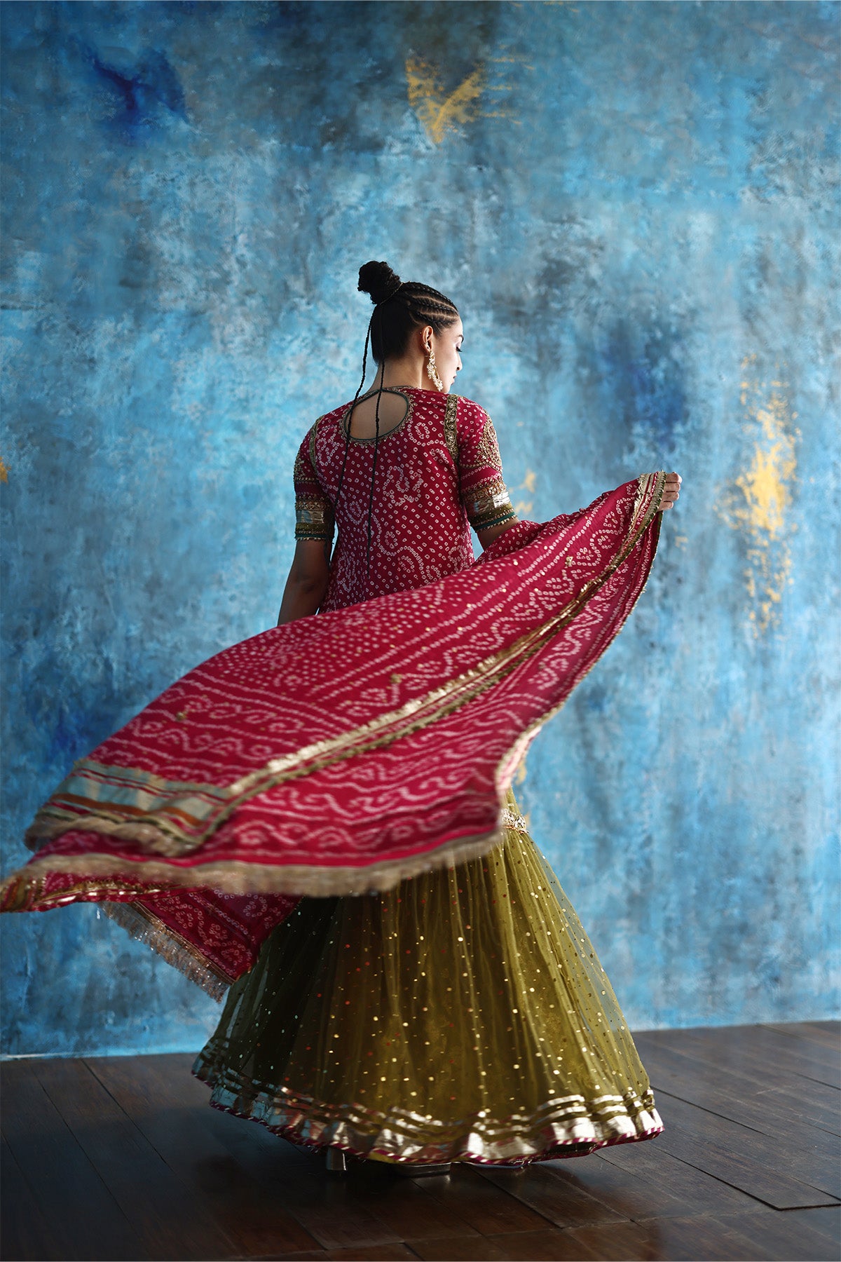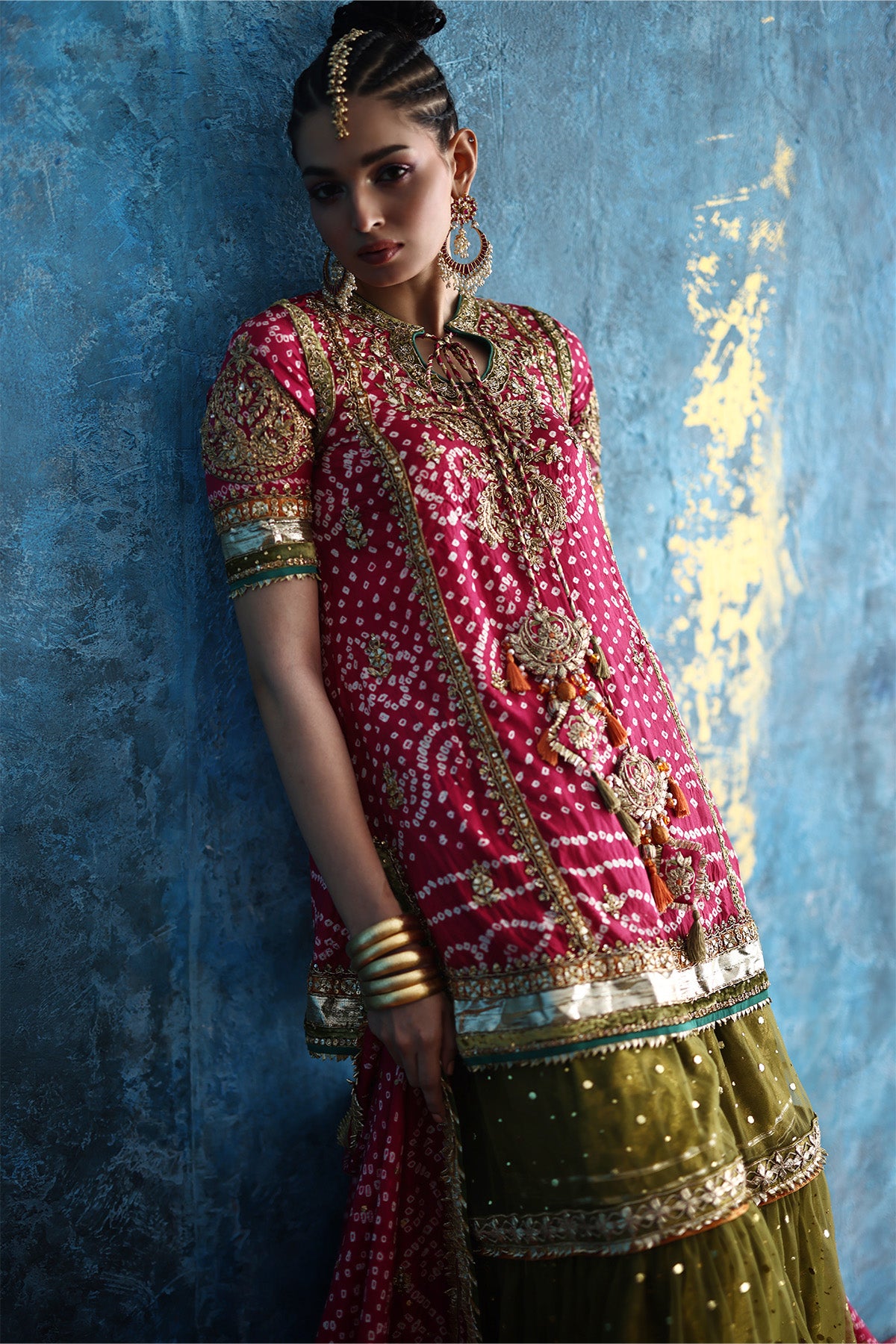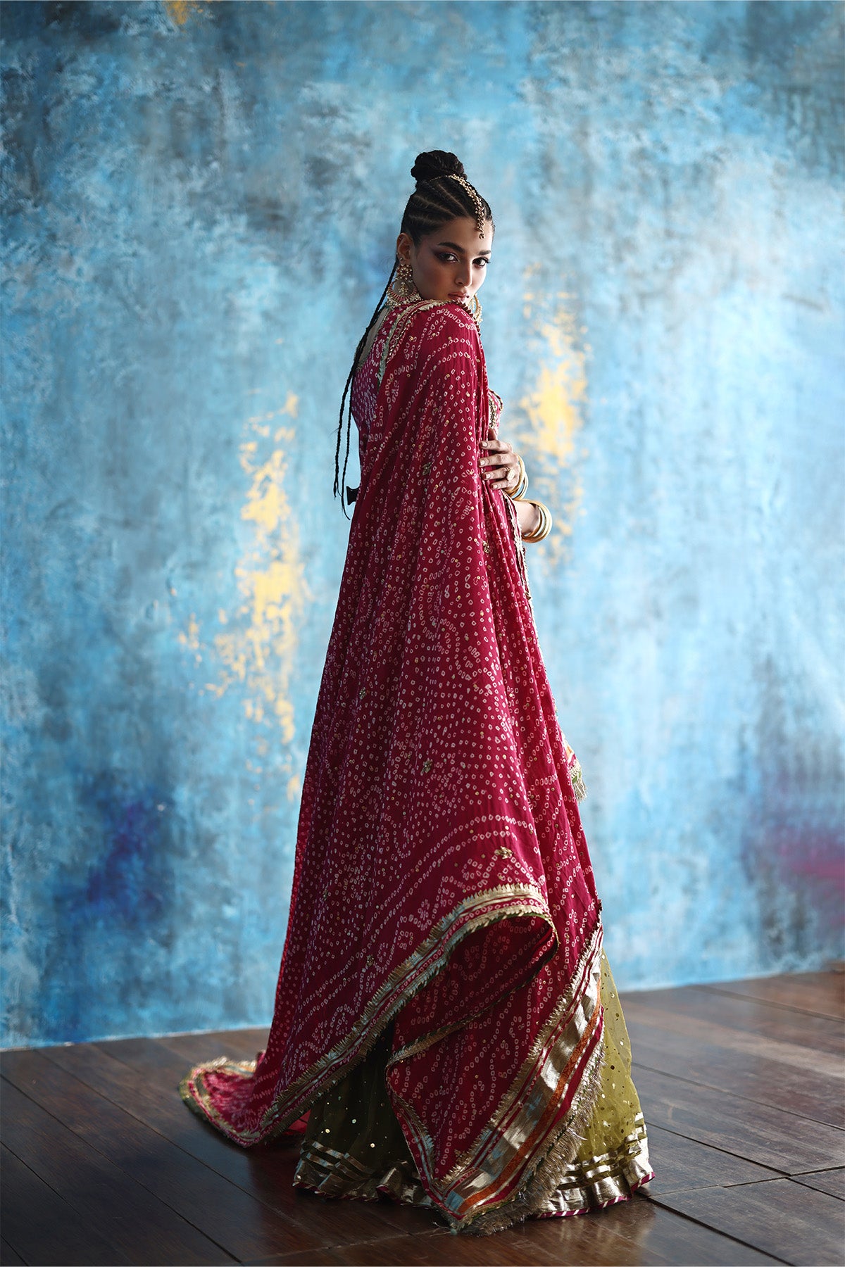 This pomegranate red short A-line chunri kurta is elevated with gota borders, rich velvet pattis, and an intricately zardozi-embellished neckline that adds a regal touch. It is paired with a contrasting olive green net mukesh gharara, delicately enhanced with shimmering gota work and gold lappas for graceful movement. Completing the ensemble is a matching chunri dupatta, hand-embellished with gota detailing and finished with gota lappa and jamavar accents.