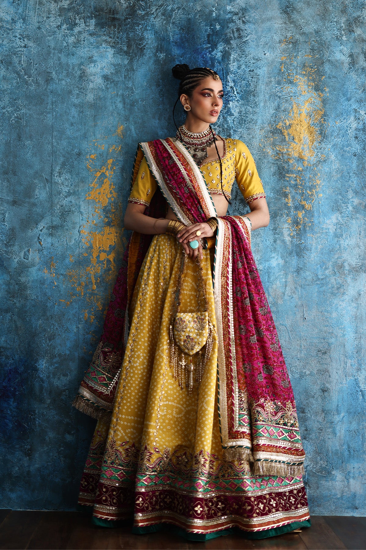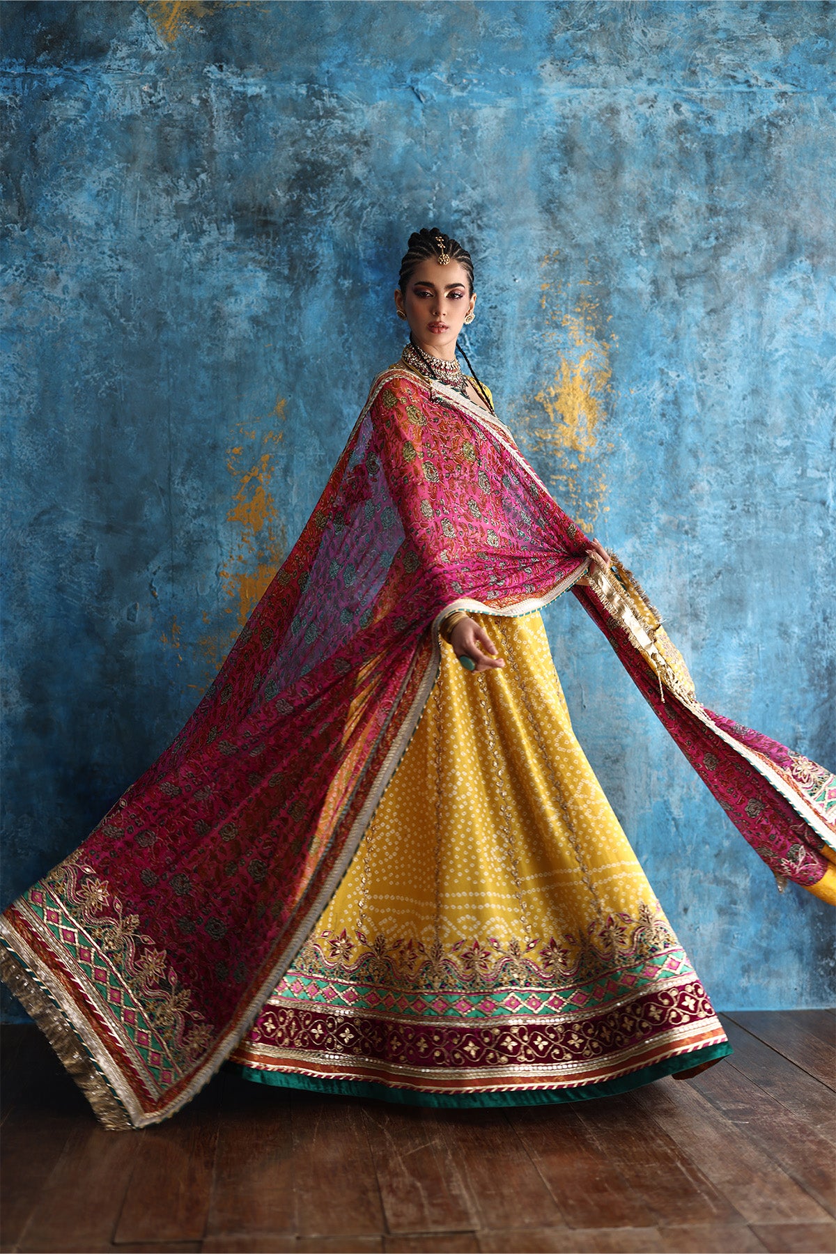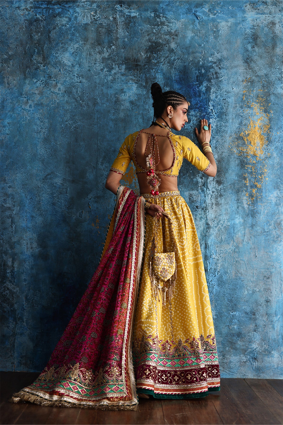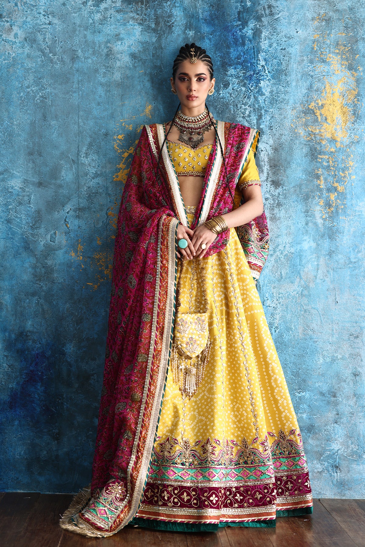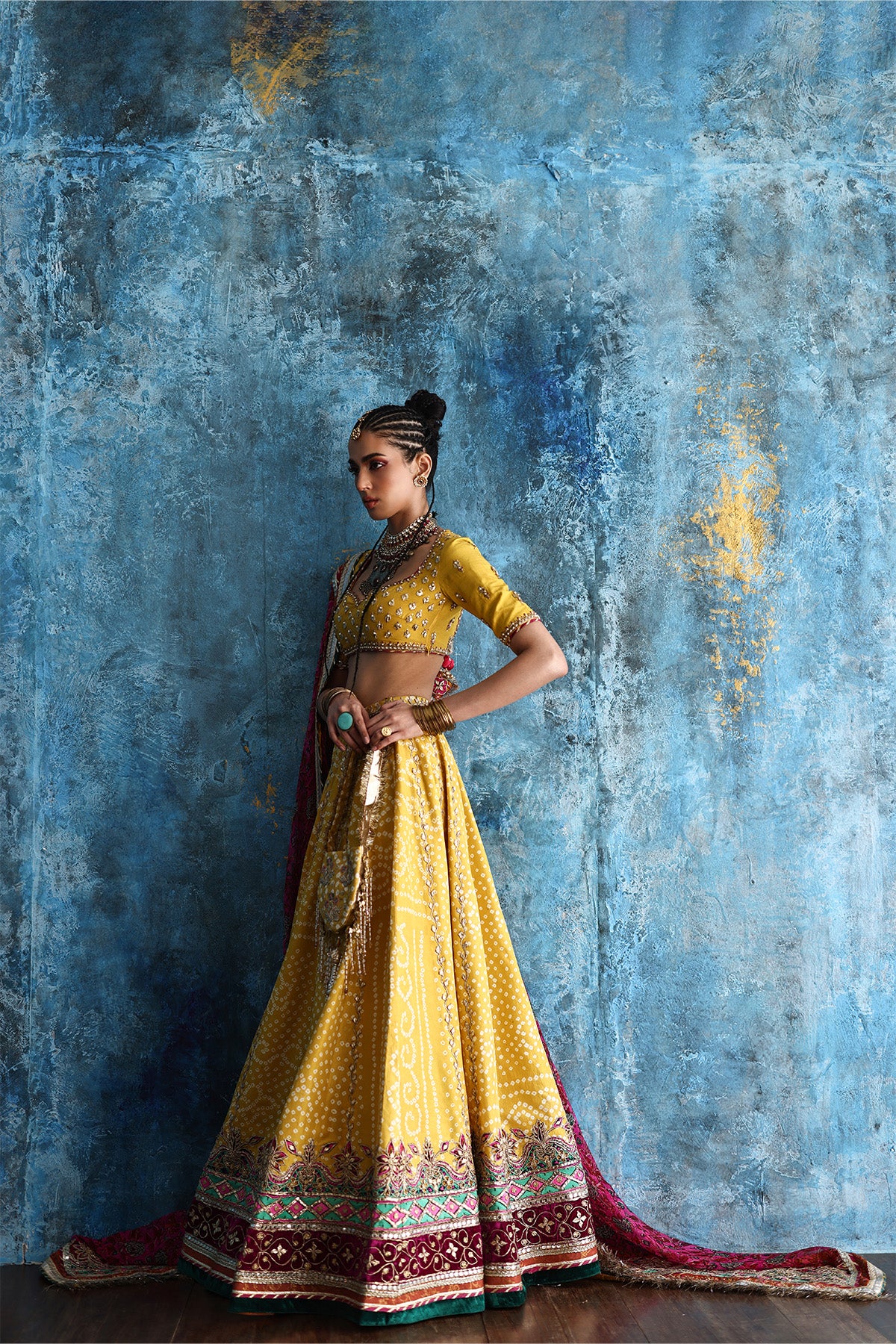 This radiant yellow silk lehnga choli is brought to life with traditional Bandhani tie-and-dye, elevated by delicate gota, pearls, and intricate zardozi on the blouse, finished with a striking pink piping detail. The lehnga is framed with rich velvet and zari borders, enhanced with block printing and shimmering gota along the hem, and cinched with a coordinated gota-detailed belt. Paired with a contrasting pink chiffon dupatta adorned with elegant block prints, gota accents, lapas, and Indian maghzis. Note: Duppata price is not included. Dupatta Code: CB-D-15-25-1 Dupatta Price 79,000/-)