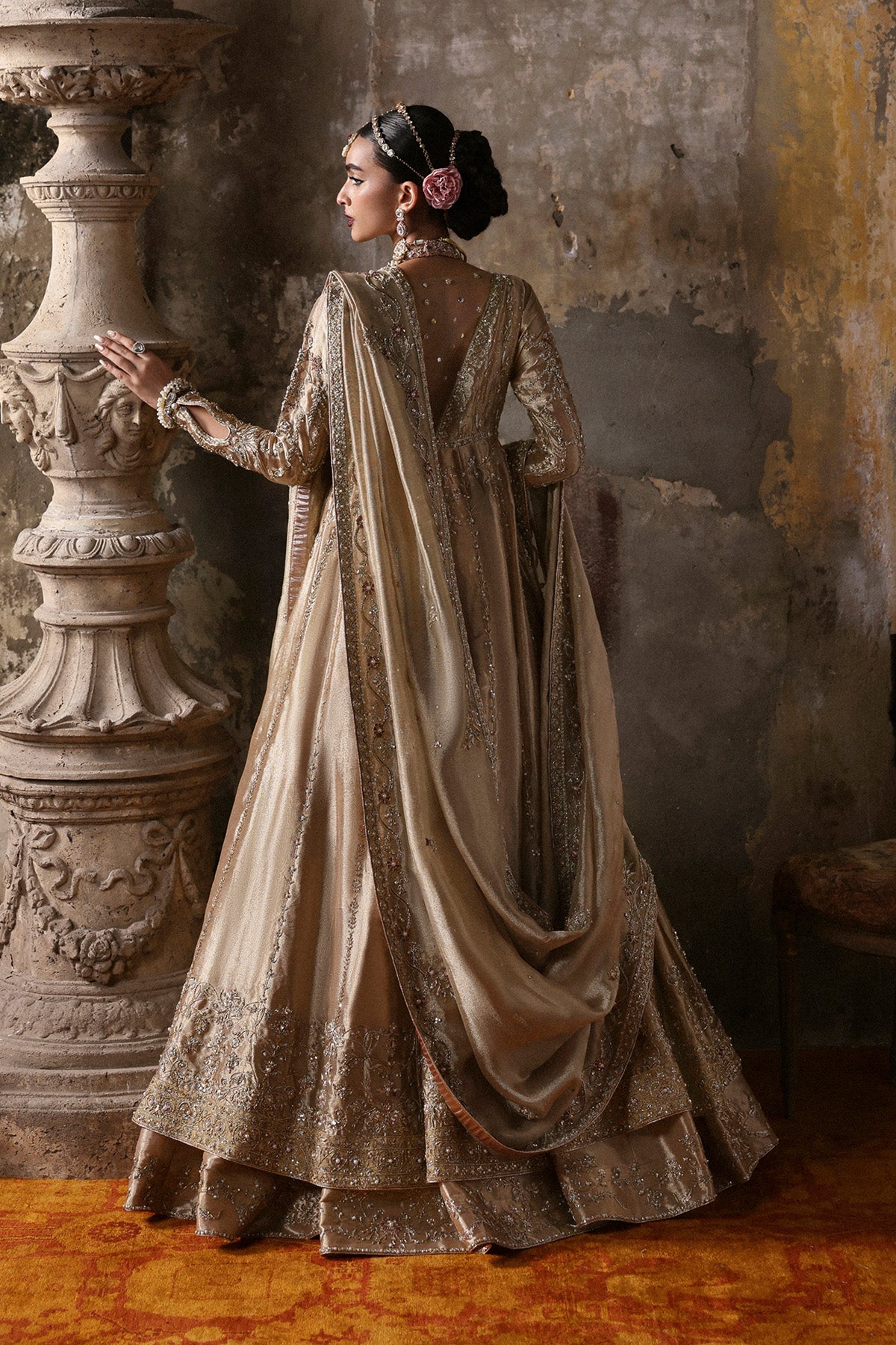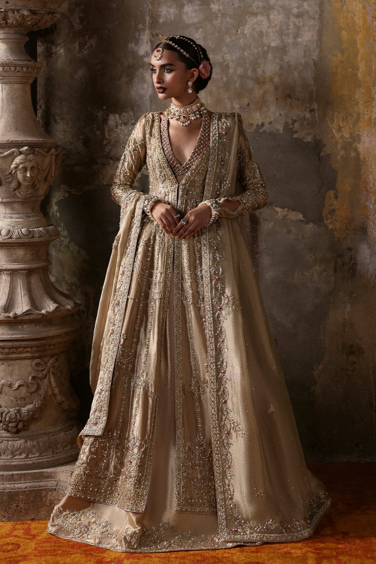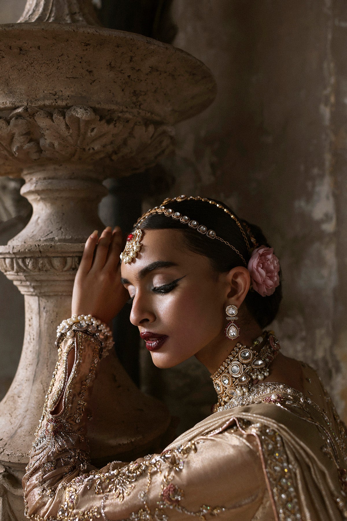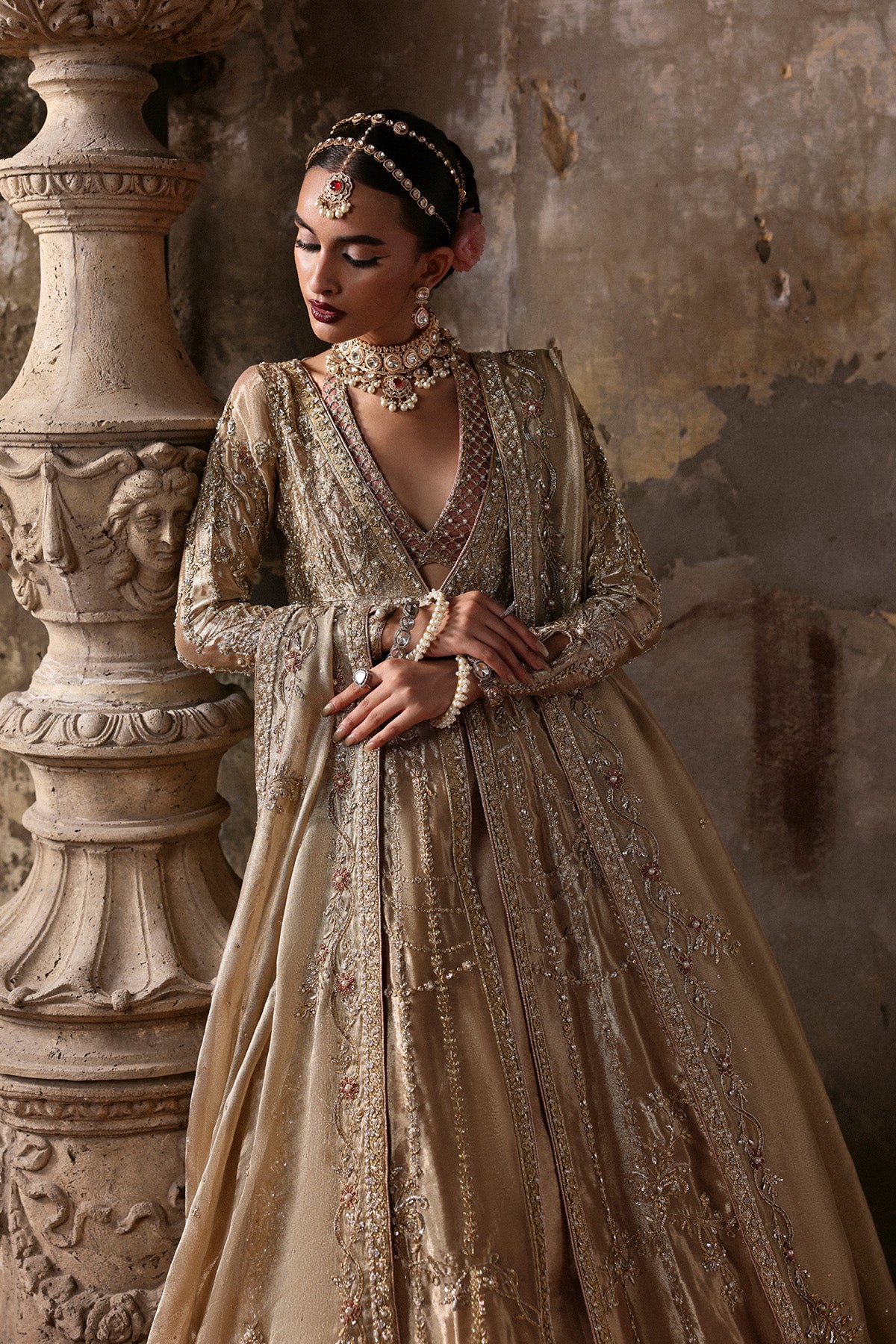 A statement halter-neck golden-pink blouse styled with a front-open metallic golden gown, a coordinated lehnga, and a delicate Indian tissue dupatta. The blouse, crafted from multihead fabric, is embellished with pearls and dapka embroidery, exuding understated grandeur. The gown and lehnga, tailored in luminous golden tissue, are richly detailed with exquisite zardozi, dapka, and naqshi work, while the borders are elevated with fine resham embroidery in French-inspired motifs, adding a touch of sophistication. The dupatta completes the look with refined borders echoing the same craftsmanship, creating a harmonious blend of tradition and elegance.