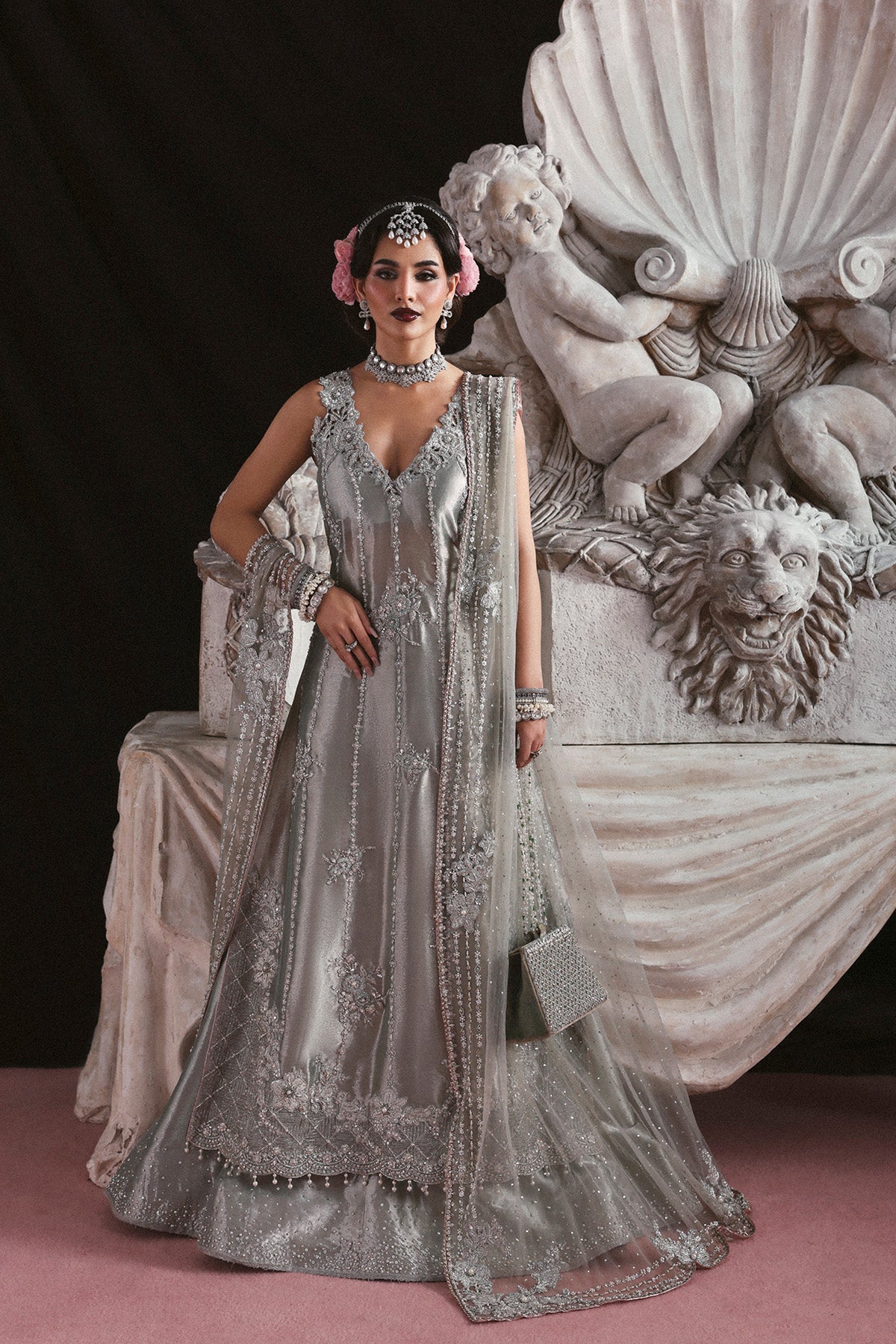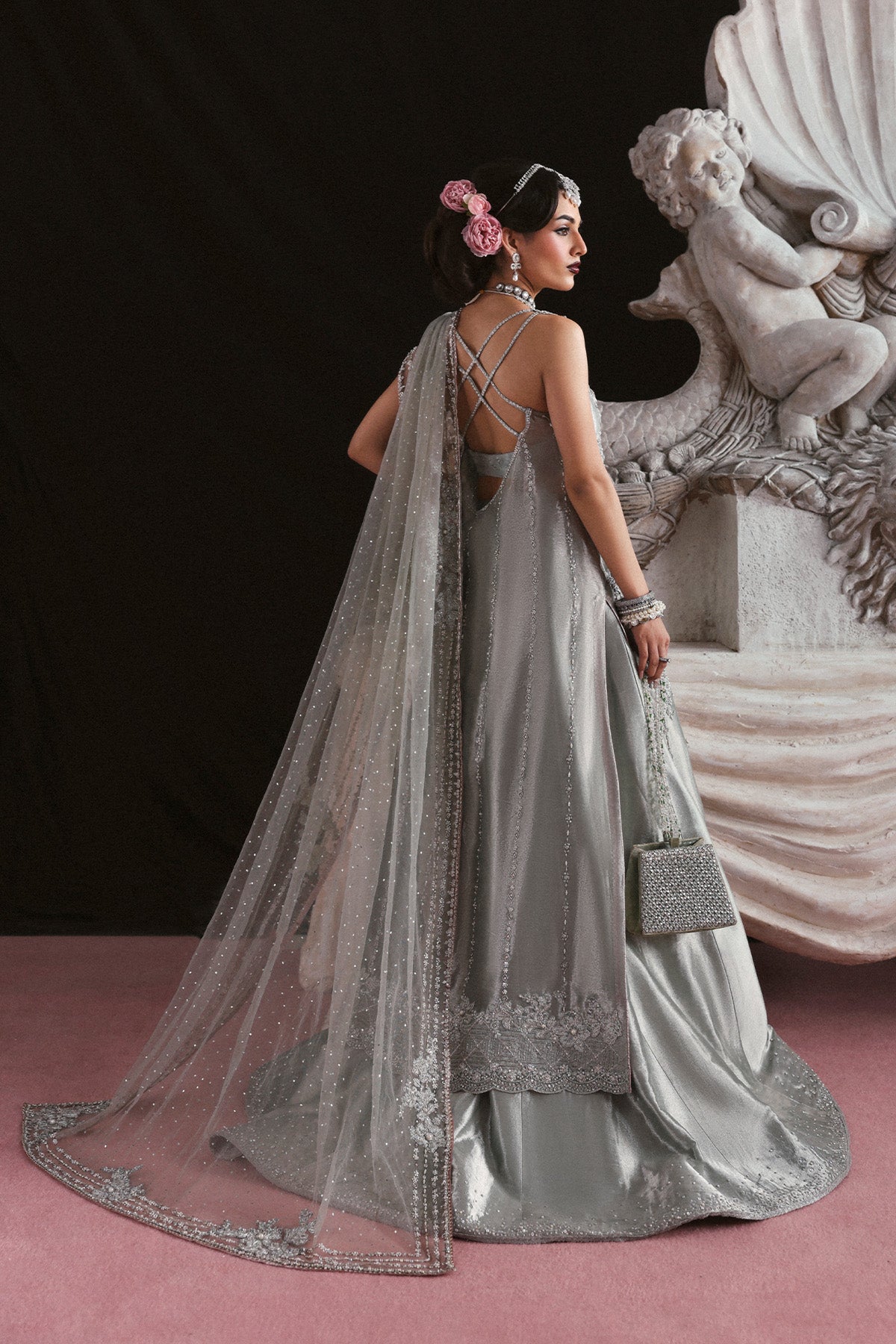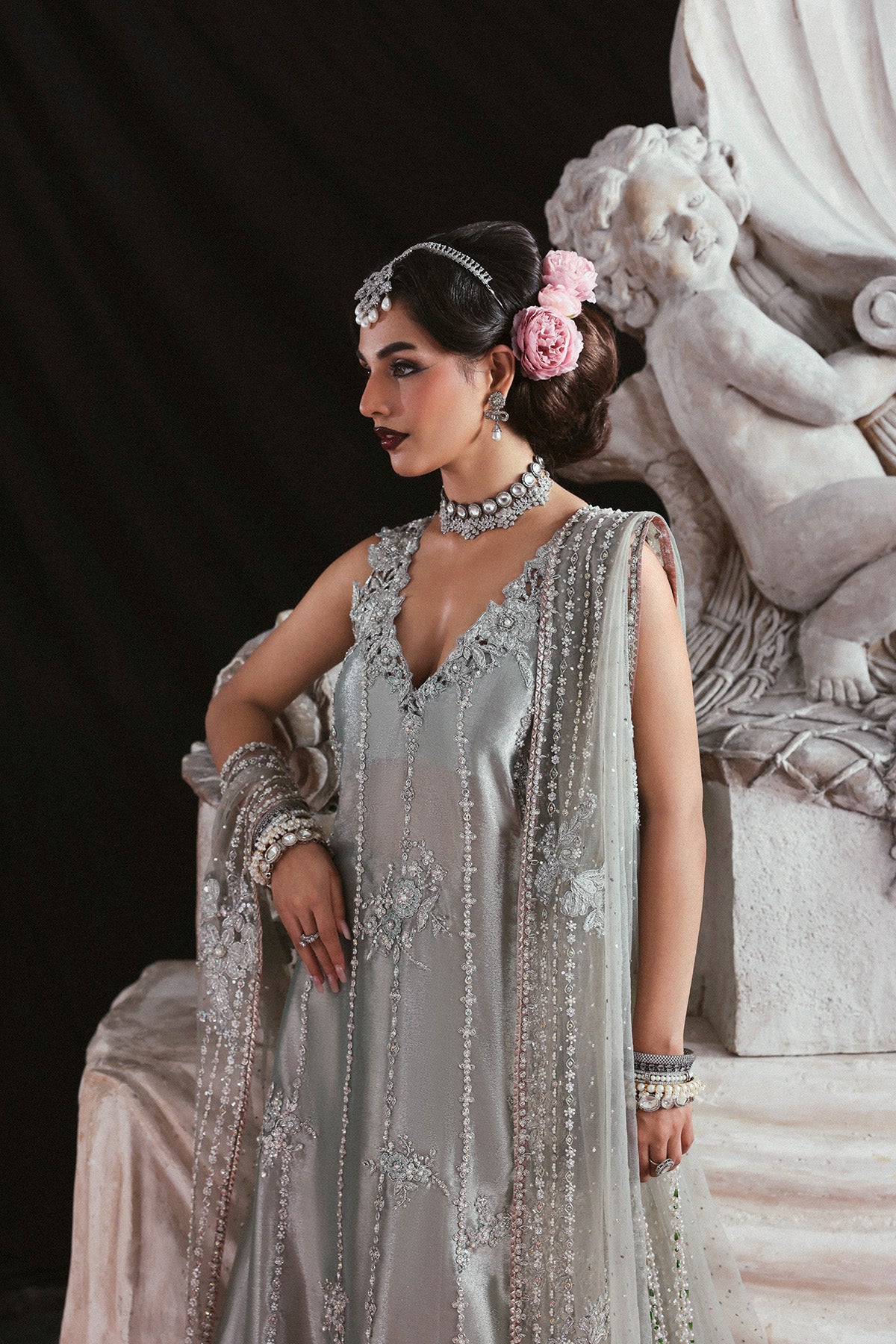 An elegant ice-blue ensemble featuring a sleeveless A-line halter kameez in tissue, paired with a strapless jamawar blouse, flowing tissue lehnga with tail, and a net dupatta. The kameez is adorned with resham cutwork, cutdana, naqshi, dabka, and pearl hangings. The lehnga sparkles with silver sequins and Swarovski work, while the dupatta is finished with coloured resham embroidery, pearls, sequins, cutdana, and zardozi detailing.