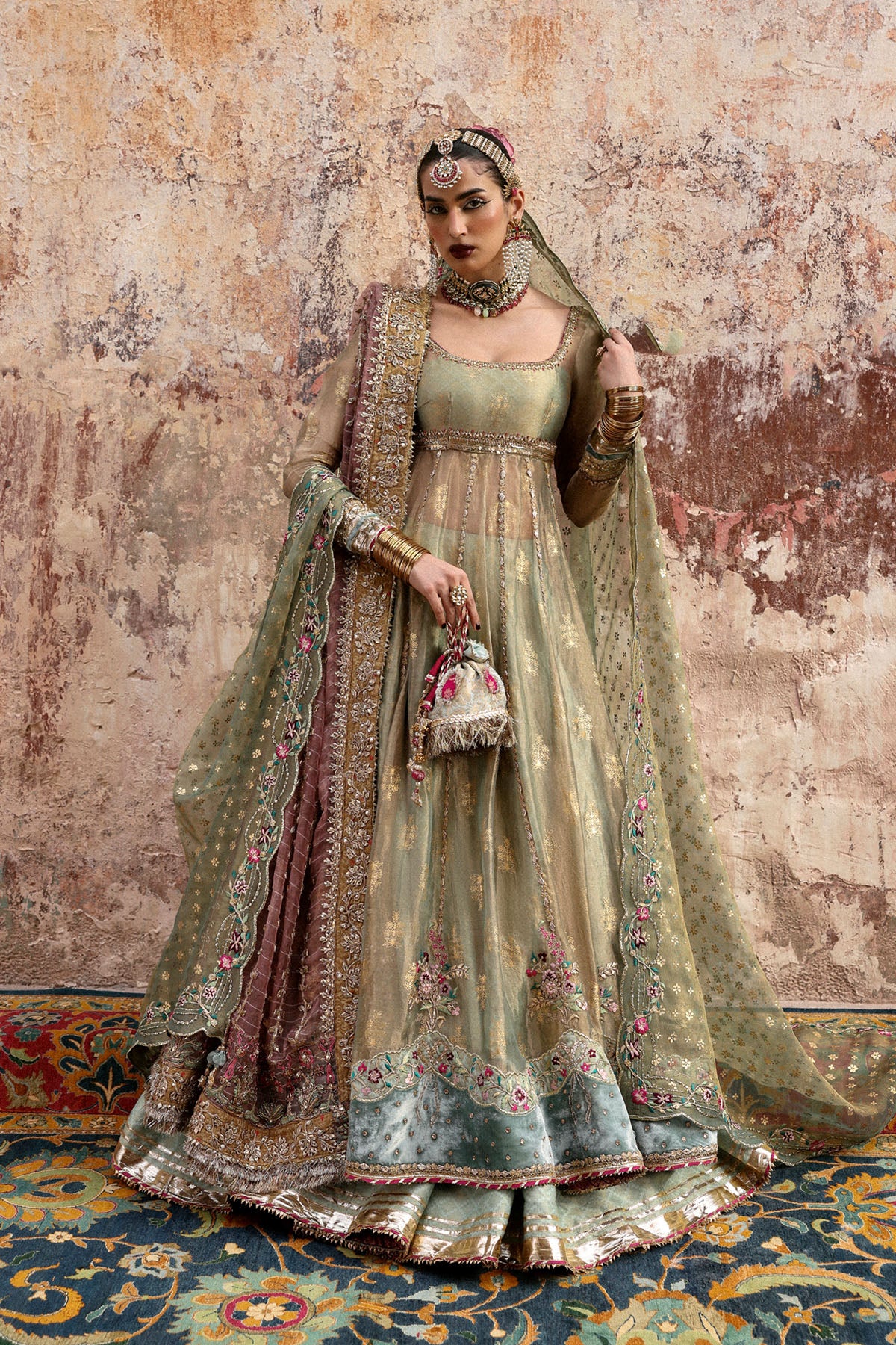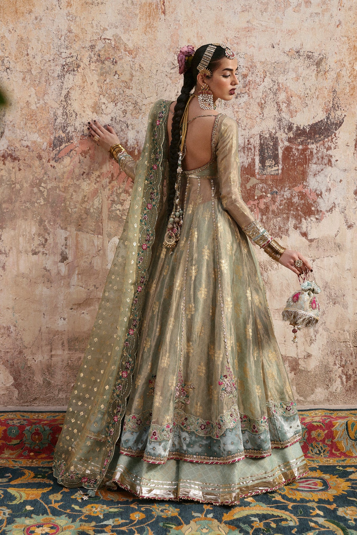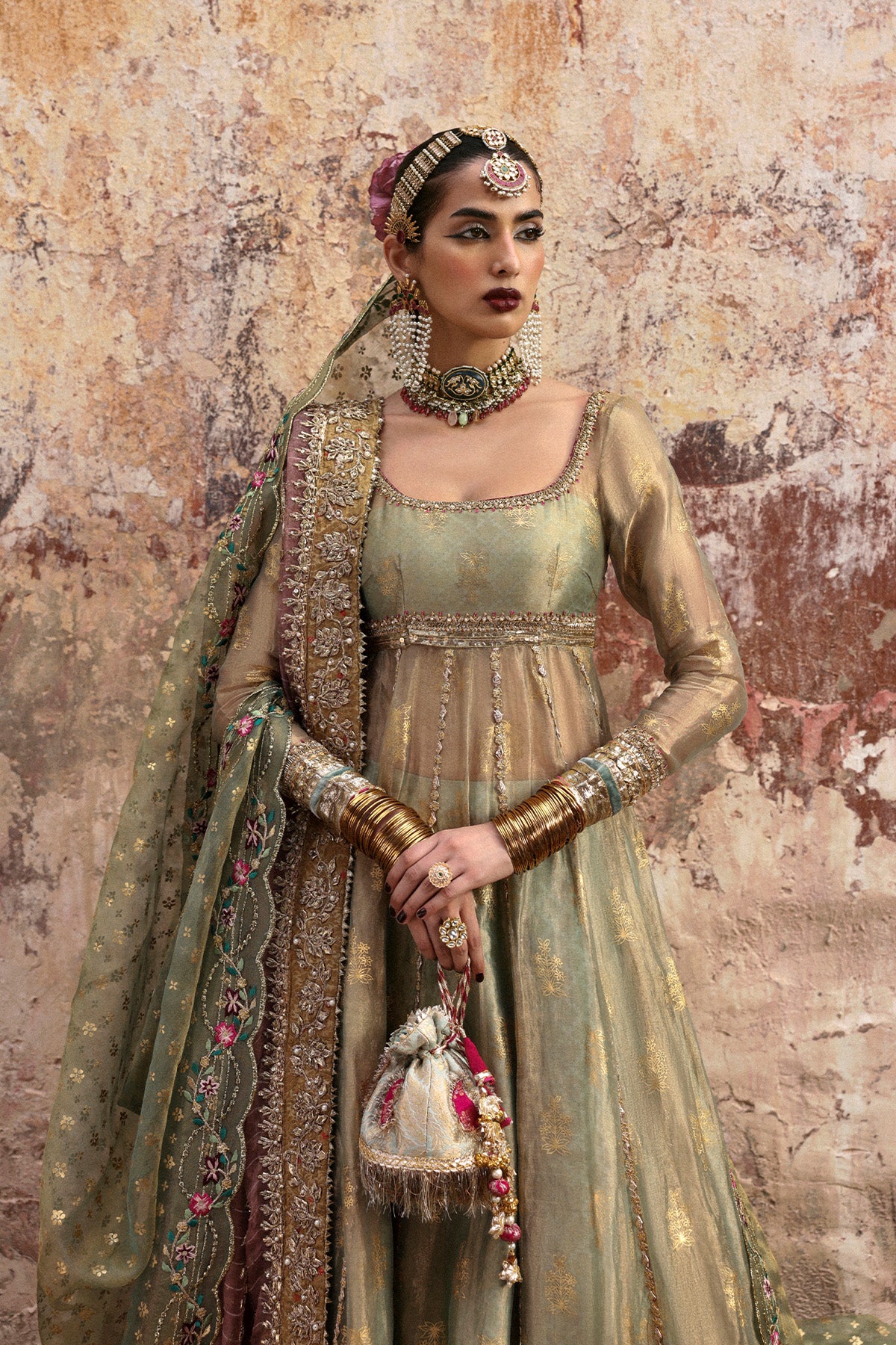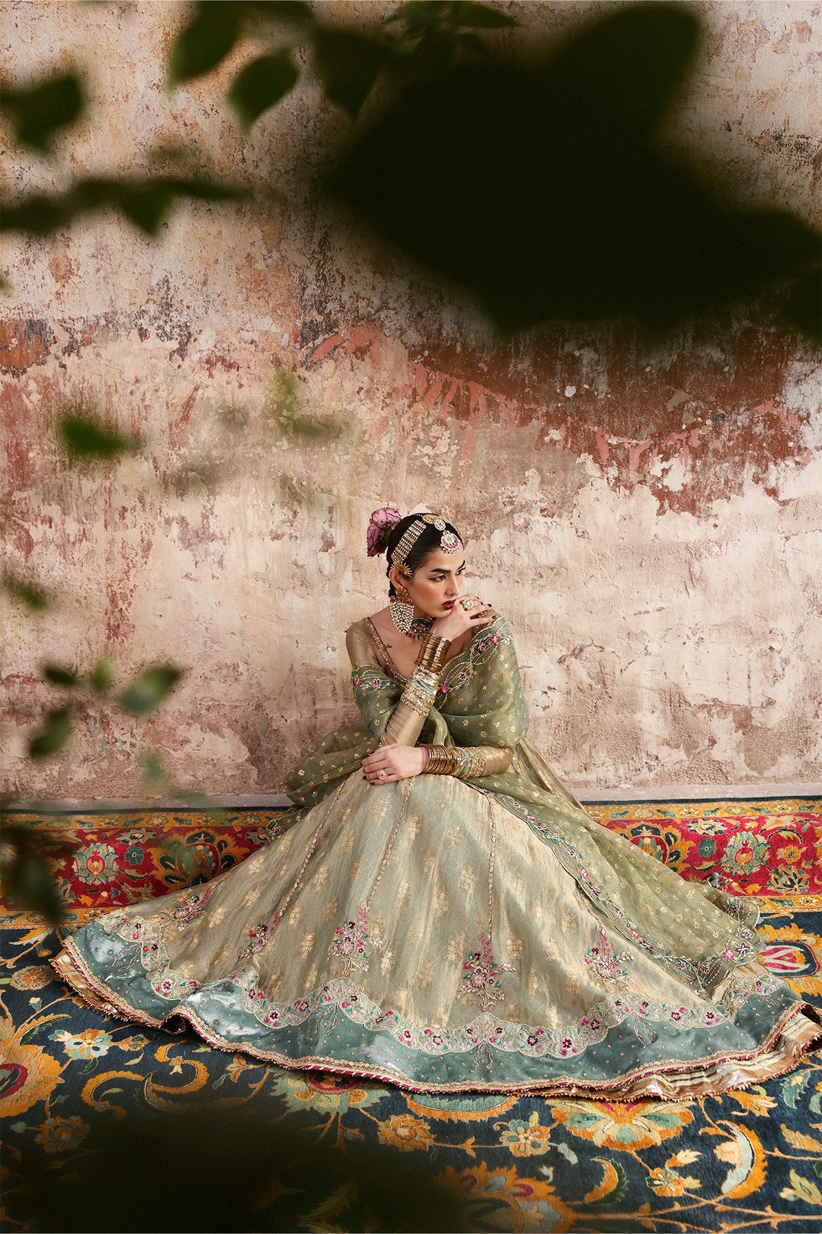 A stunning mint green pure Indian tissue peshwas with a deep scoop neck, paired with a cotton zari net lehnga and zari net dupatta. The peshwas is detailed with foil printing, hand embroidery, Indian gotta, and multicoloured resham along the border, finished with velvet patching, zardozi, Swarovski, and pink Indian mugzi accents. The lehnga is bordered with layered lappa and matching gotta-mugzi detailing, while the dupatta features all-over foil printing and scalloped cutwork borders with resham and Indian gotta embroidery, completing this elegant blend of tradition and refinement.
