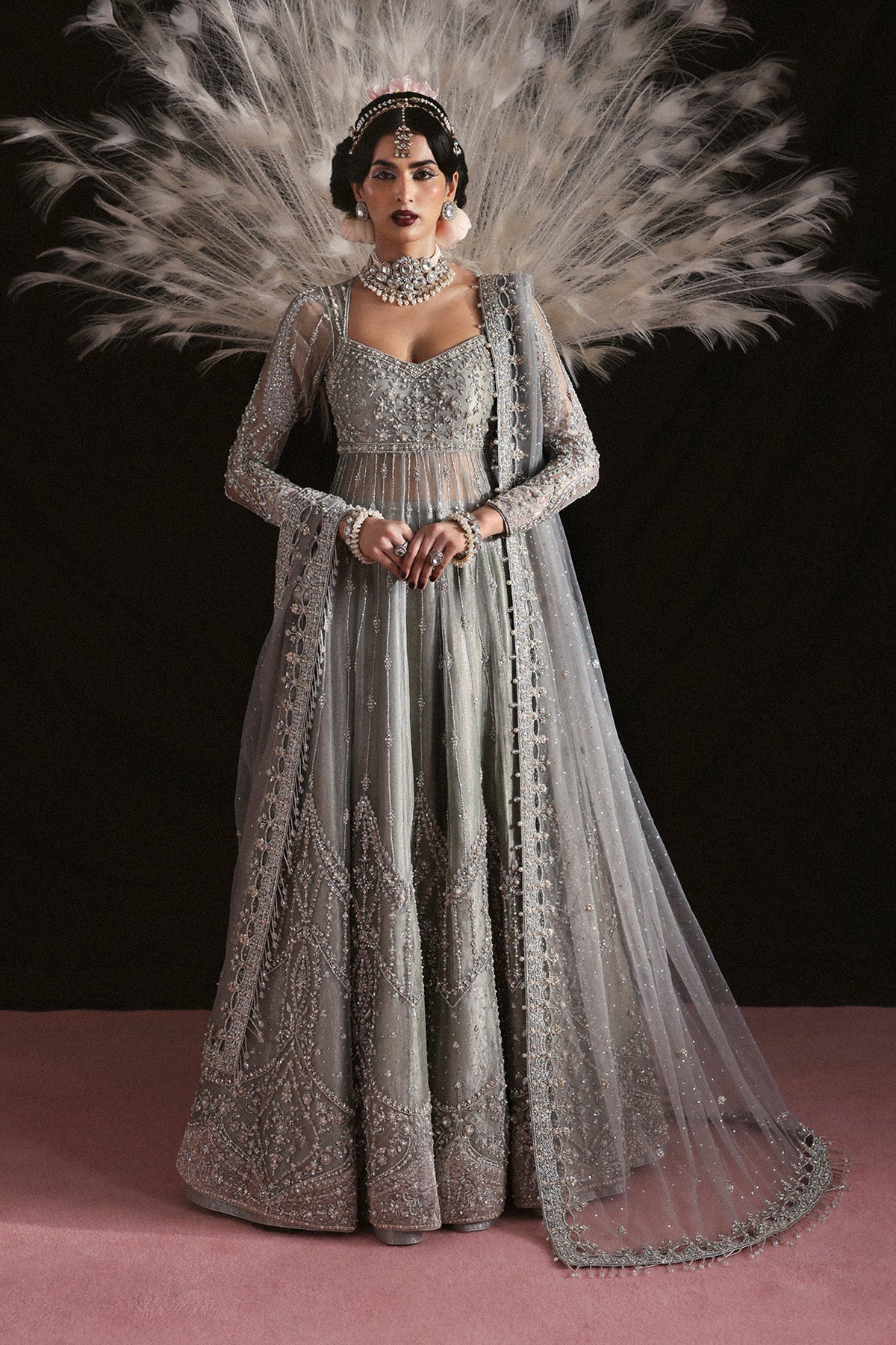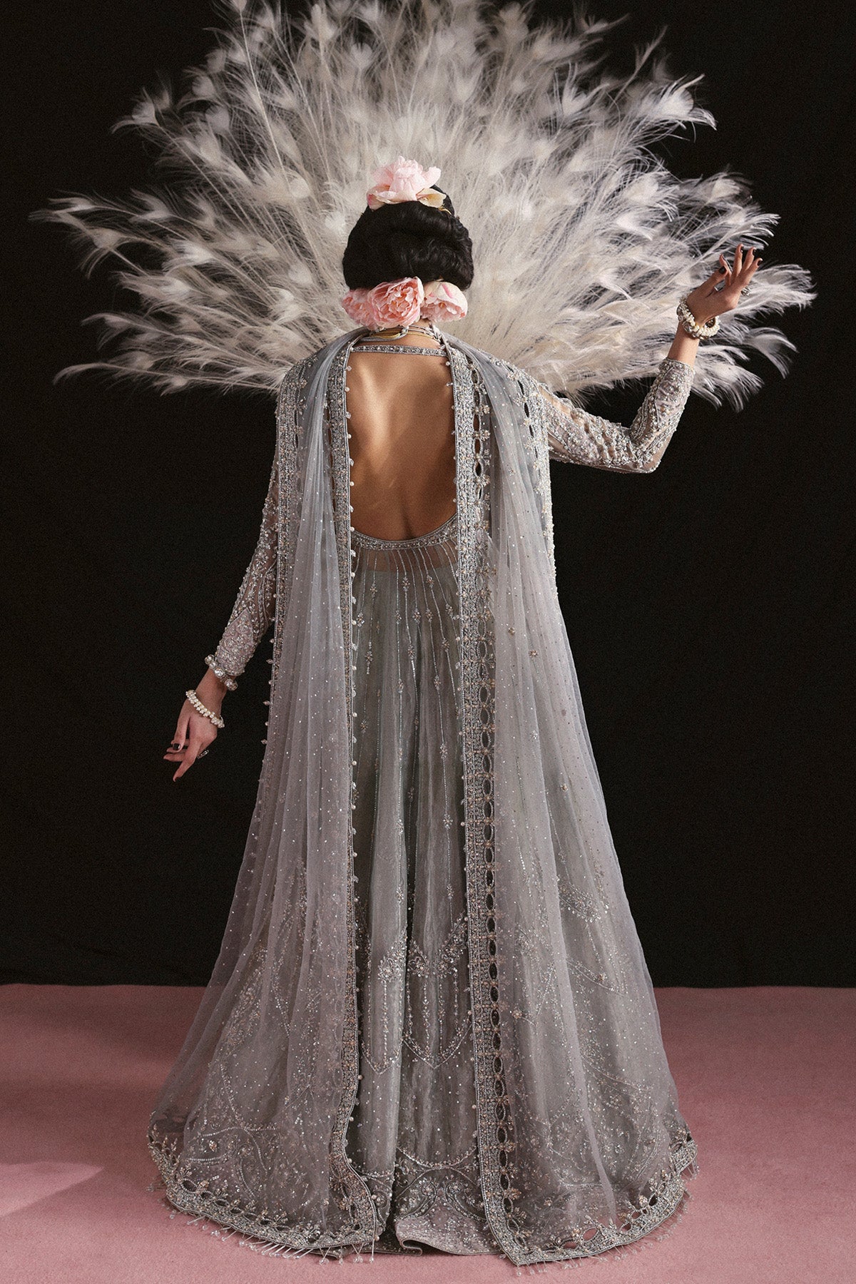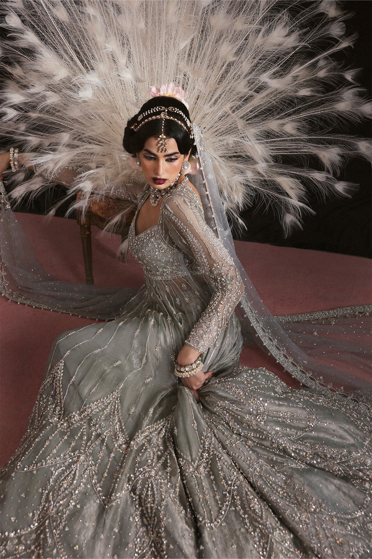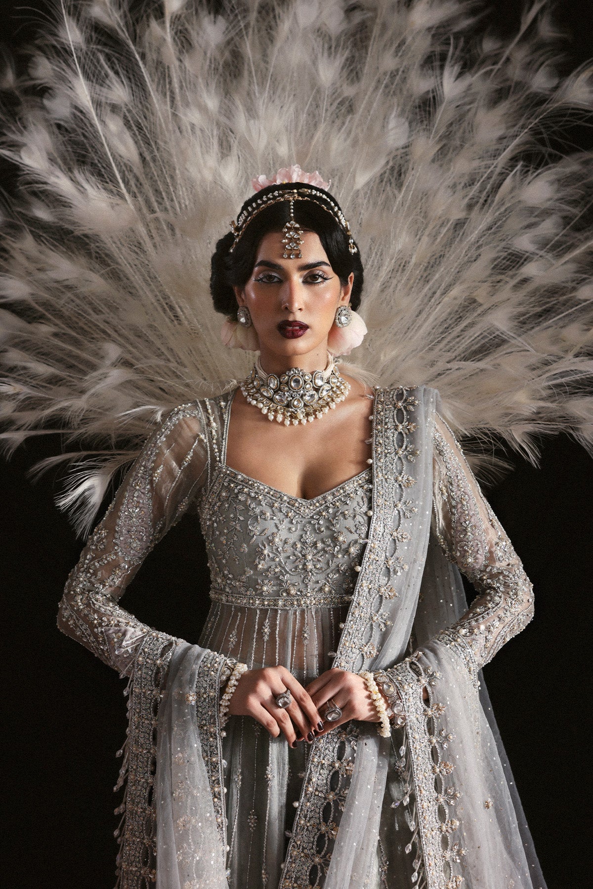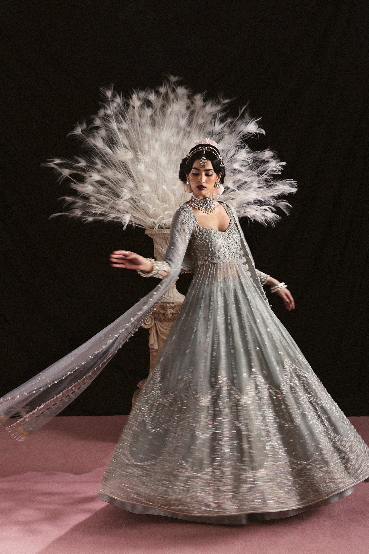 A regal grey tissue gown with velvet-patched borders, richly embellished with intricate silver zardozi work. It is paired with a flared jamawar lehenga detailed with two-toned tissue finishing, adding depth and layered elegance. The look is completed with a silver net mukesh dupatta featuring exquisite cutwork, lending a sheer and ethereal charm to the ensemble.