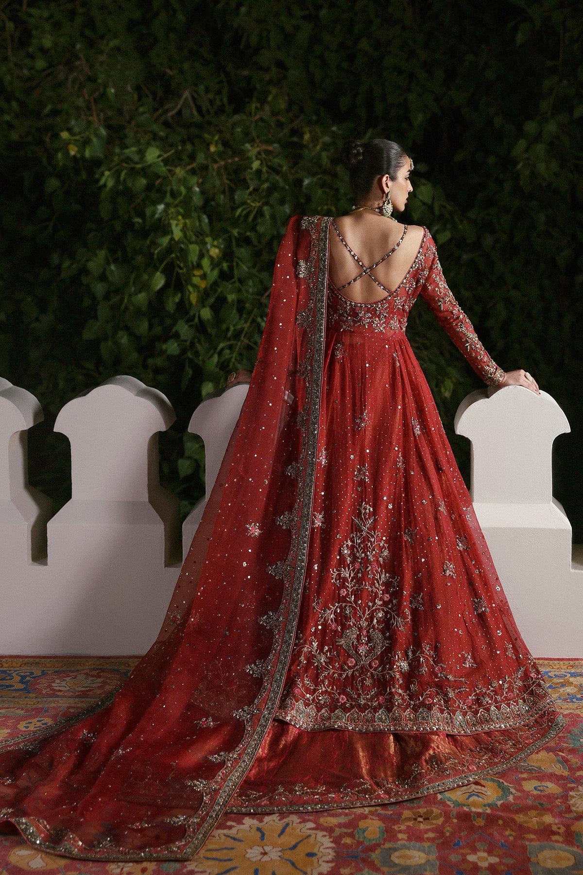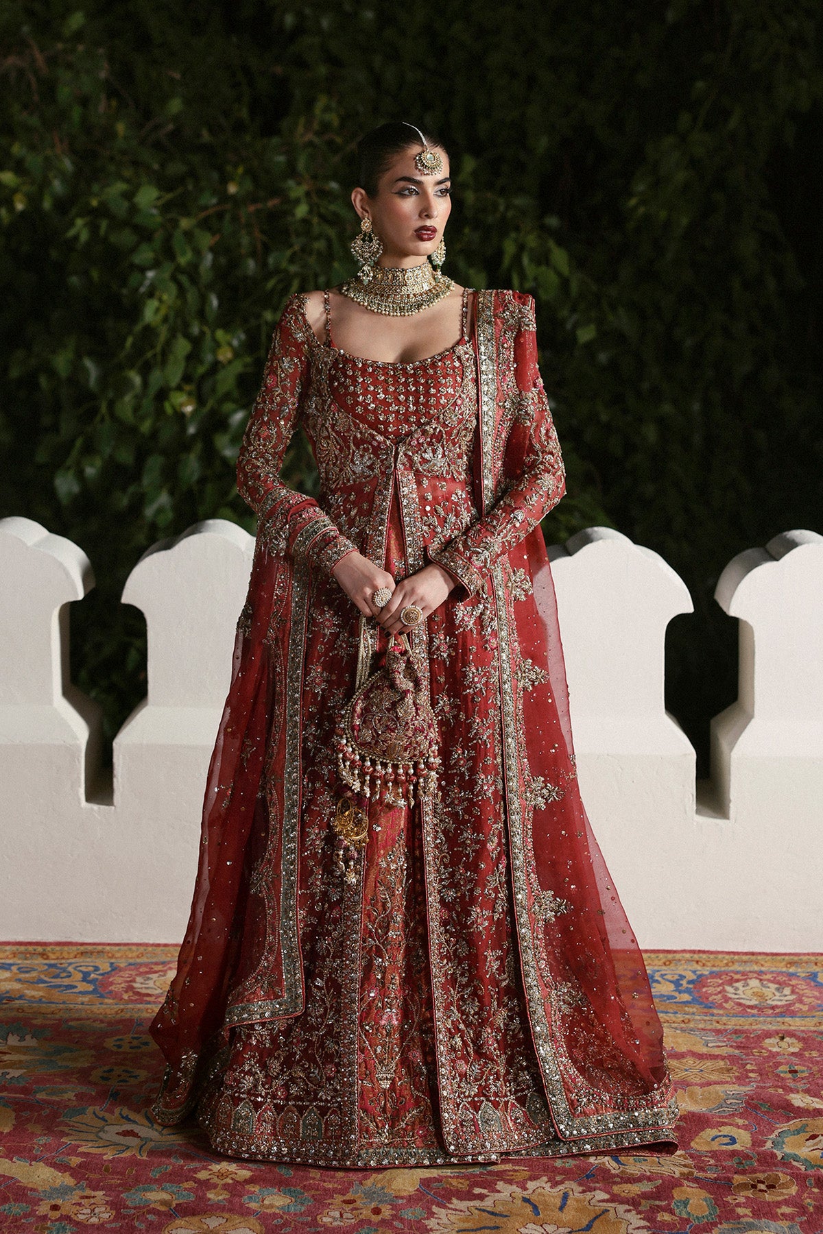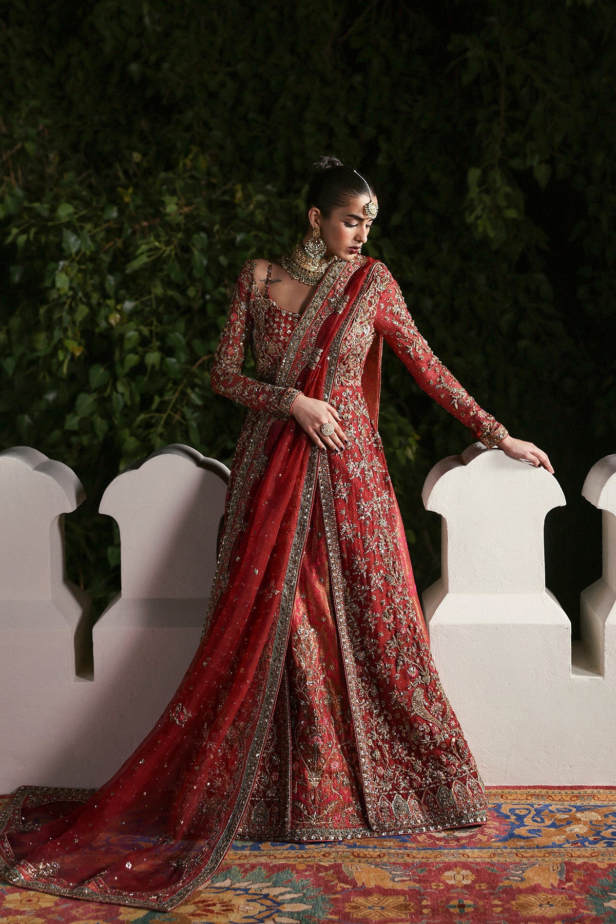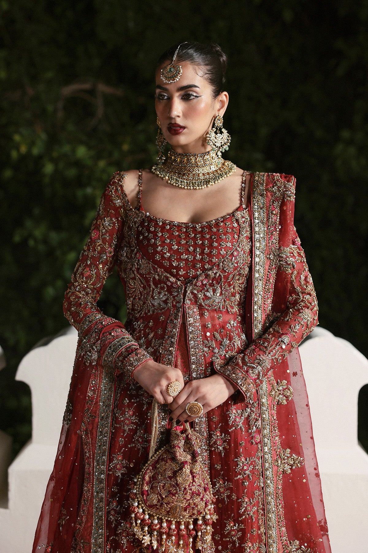 A striking deep red front open organza mukesh gown with side slits, paired with a zardozi-adorned inner blouse, a hot pink pure jamawar lehnga, and a matching dupatta. The gown features cotton zari net appliqué, coloured resham embroidery, Swarovski accents, zardozi, and kamdani work, blending intricate craftsmanship with modern elegance. The lehnga mirrors the gown’s embellishment for a cohesive look, while the organza mukesh dupatta, detailed with appliqué, resham, Swarovski, and zardozi, completes this regal yet contemporary ensemble.