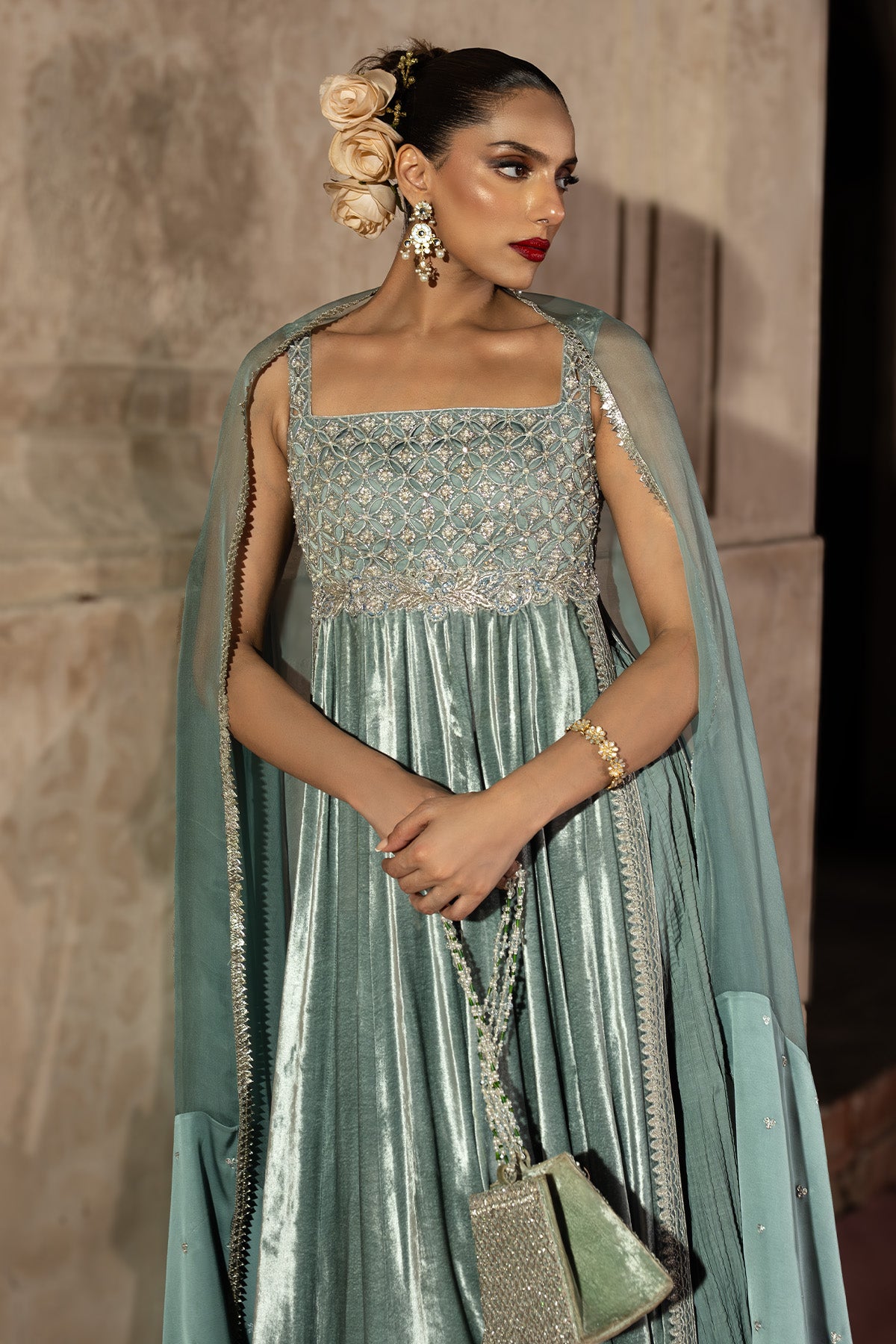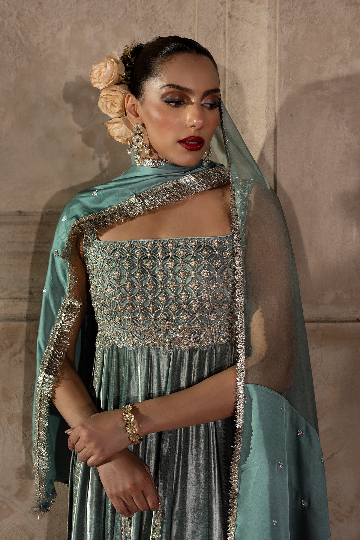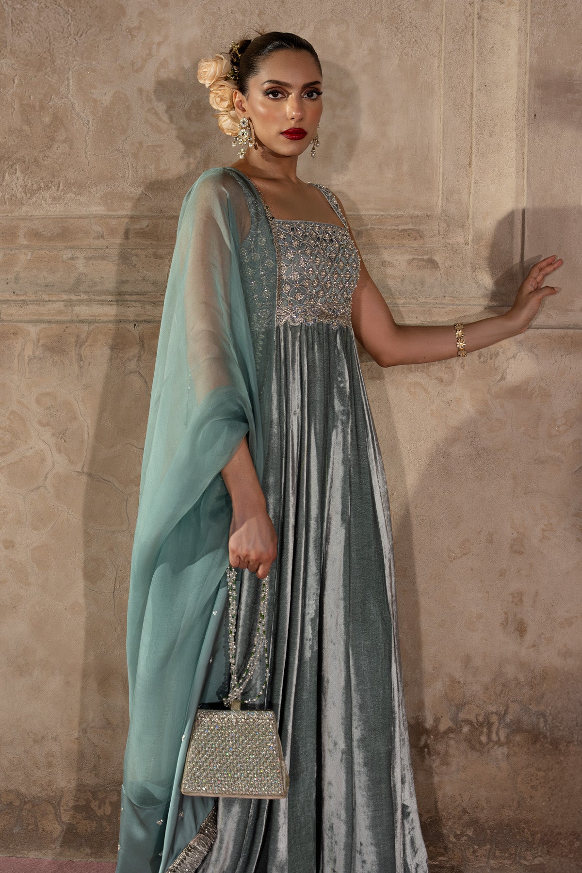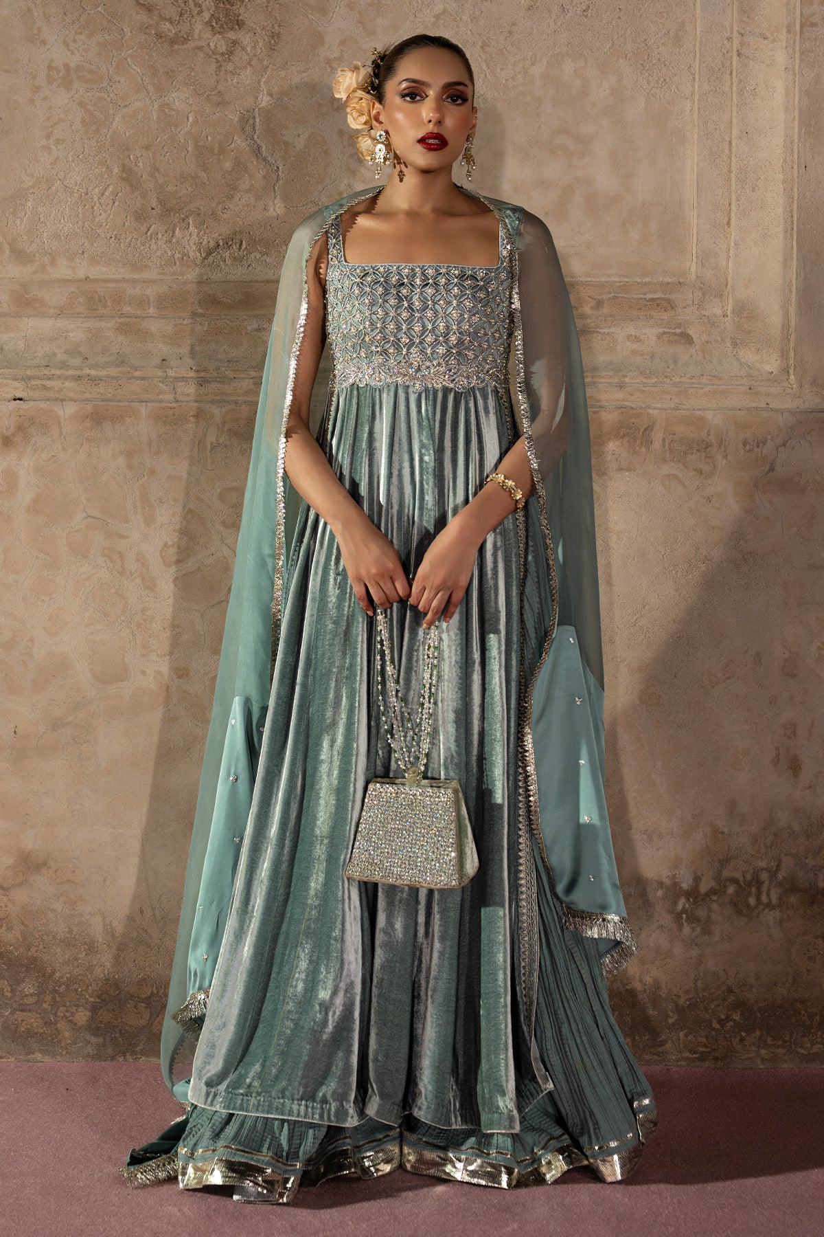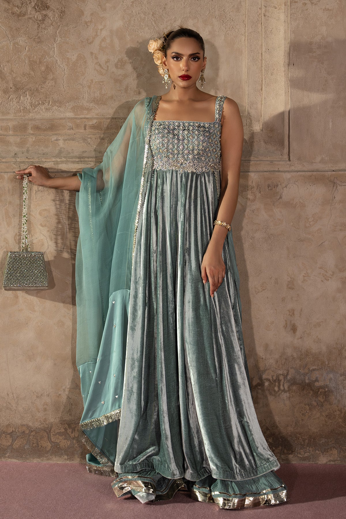 An ice blue velvet A-line shirt with a cutwork organza bodice, embellished in silver zardozi and multihead embroidery. The flared silhouette flows into a crushed floor-length sharara and is paired with a sheer satin-organza dupatta , an ensemble that blends craftsmanship, elegance, and effortless grace. Note: Duppata price is not included.