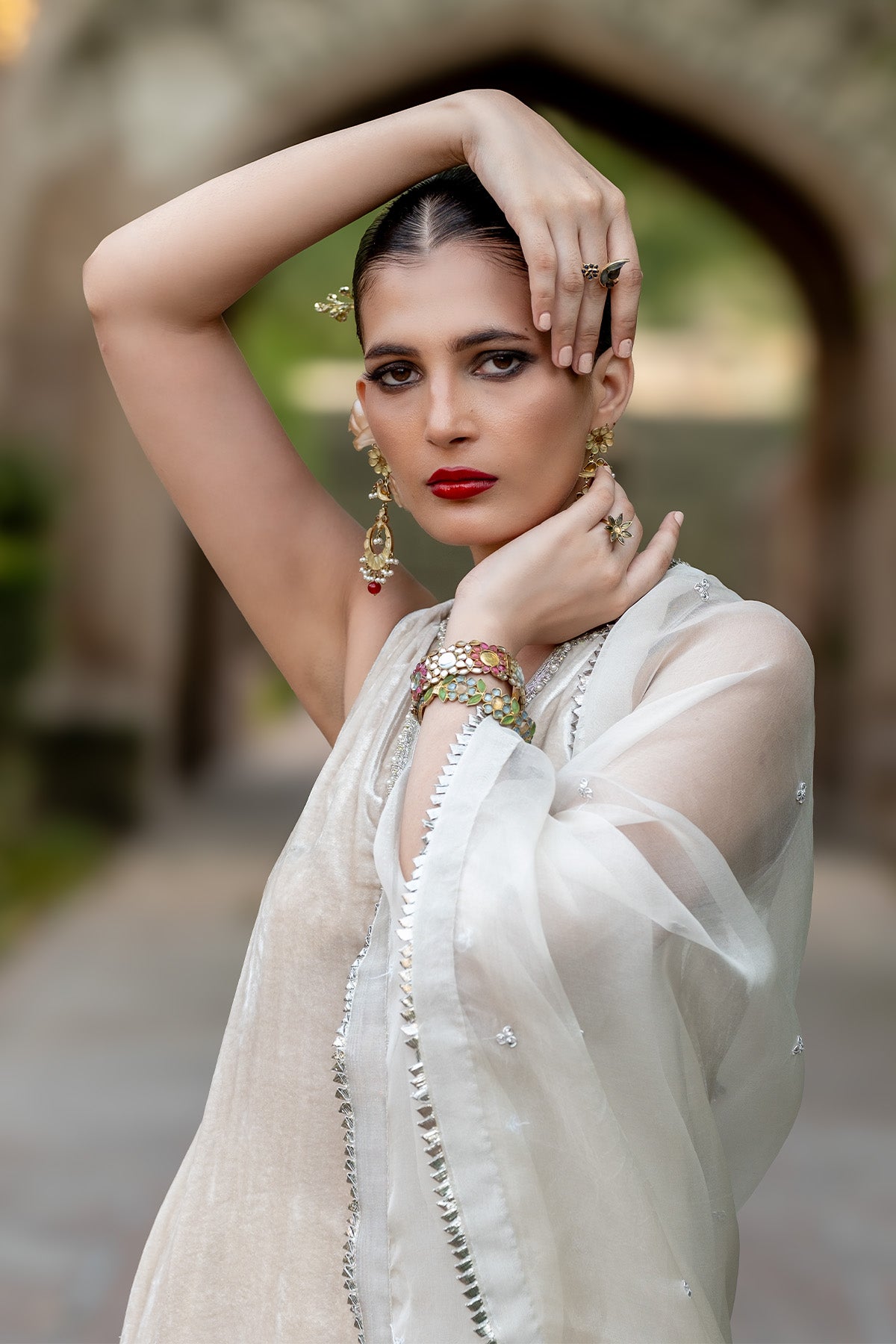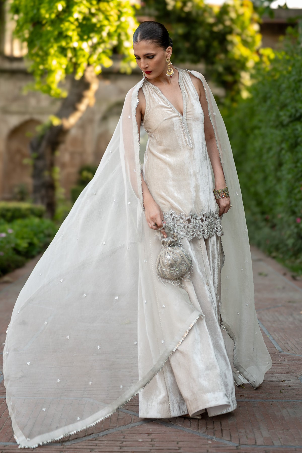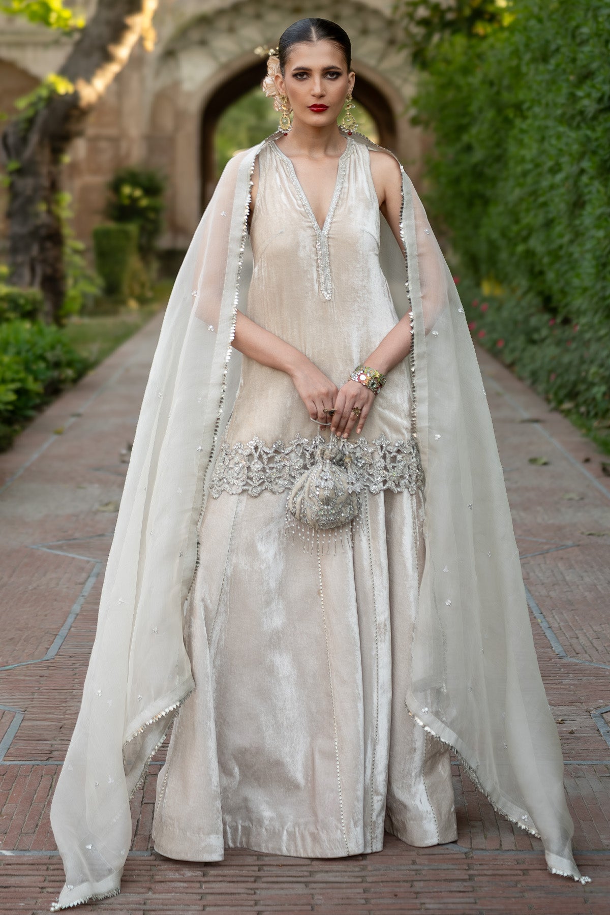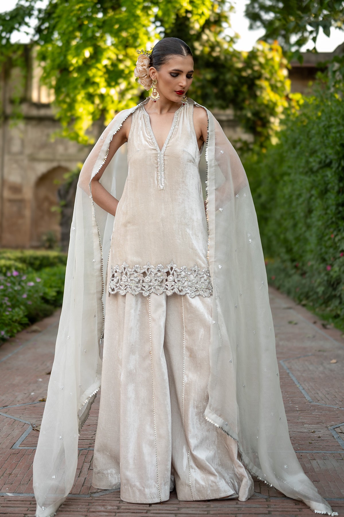 The outfit features a short halter-neck shirt paired with sharara pants and an organza dupatta. It is designed in a soft ivory color and made from pure velvet and organza. The shirt is adorned with beautiful zardozi work and resham cutwork on the hem. It is further enhanced with pearl and sitara work along the neckline, while the sharara is detailed with elegant gota embellishments. Note: Duppata price is not included.