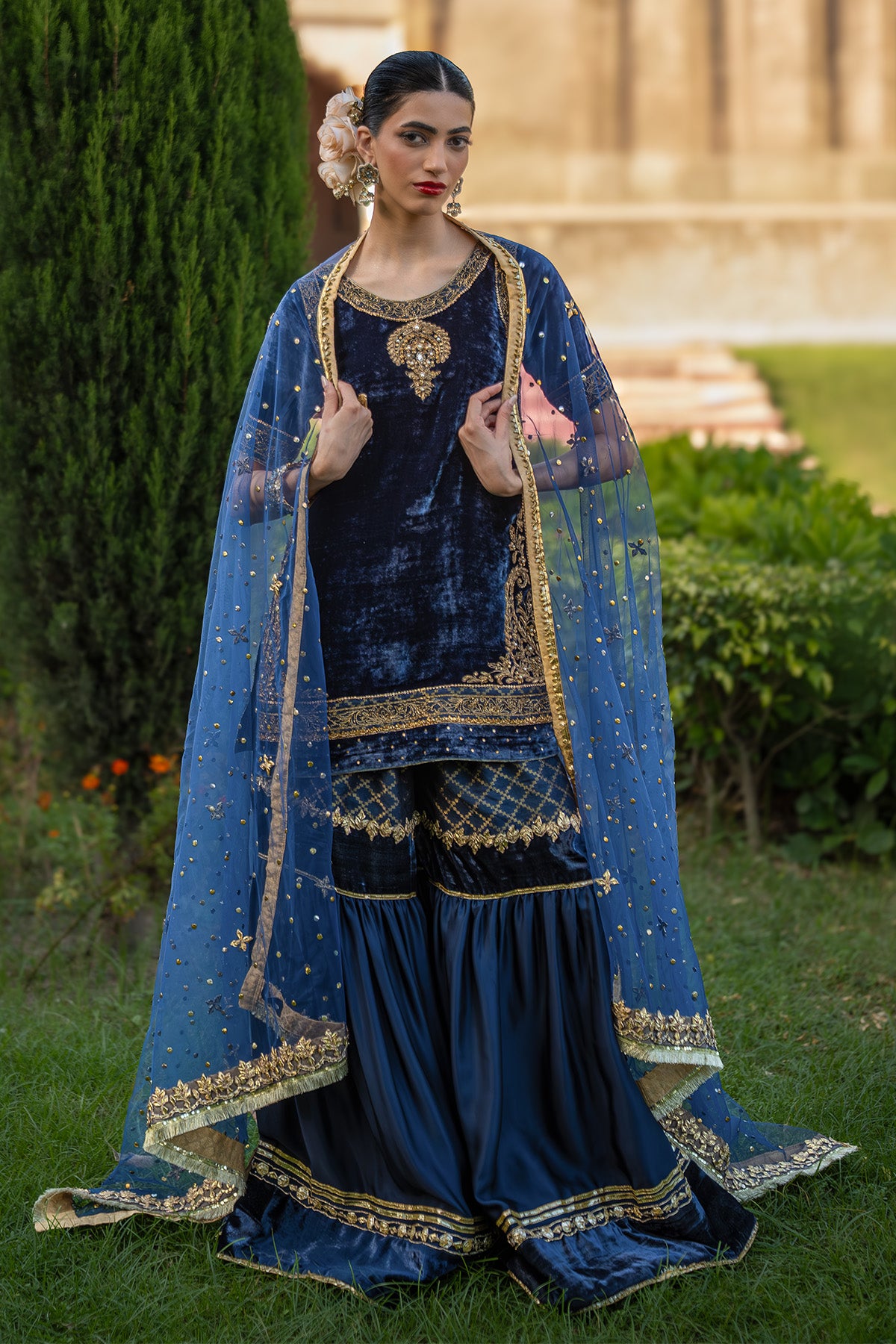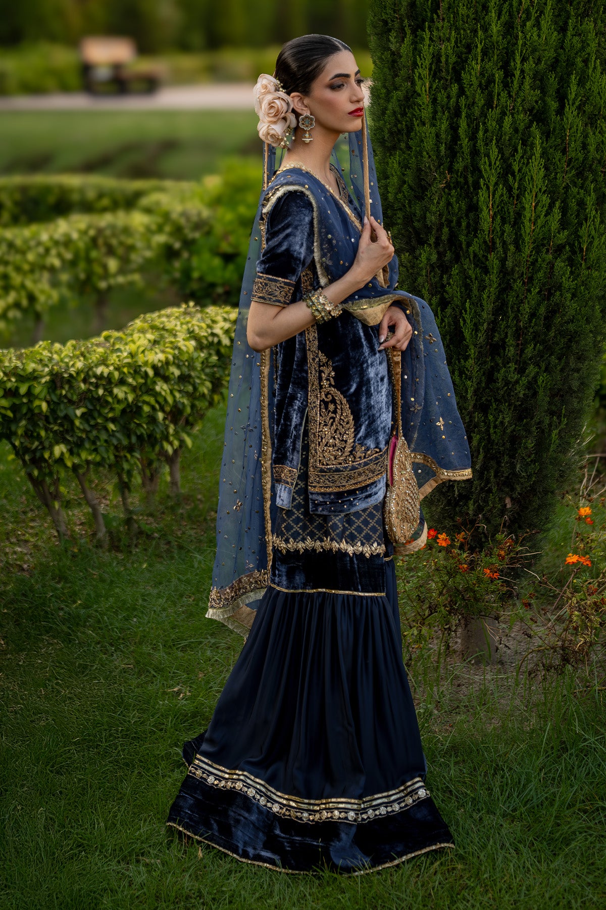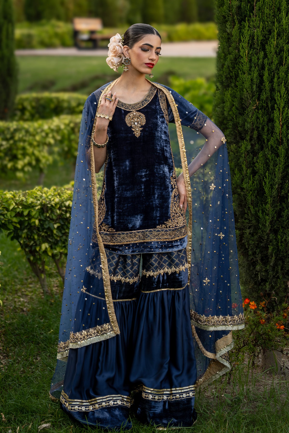 A masterpiece in navy tones , this traditional short velvet shirt with half sleeves is paired with a matching cotton net and satin silk gharara, complemented by a contrasting light blue dupatta. The ensemble is adorned with intricate hand embroidery and detailed dabka work, reflecting the timeless artistry of South Asian craftsmanship. A perfect blend of regal texture, refined detailing, and graceful silhouette. Note: Duppata price is not included.