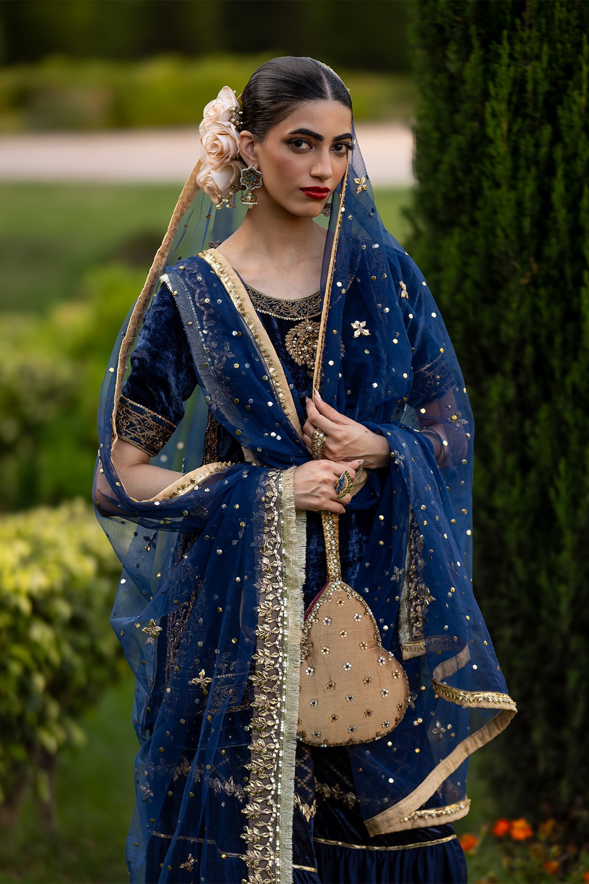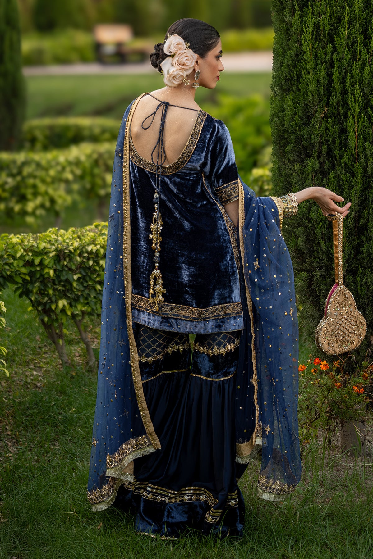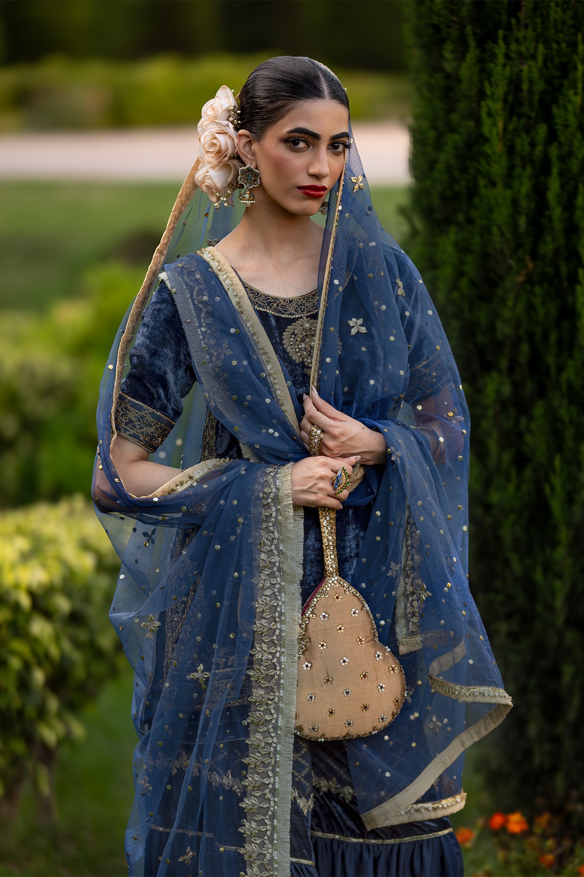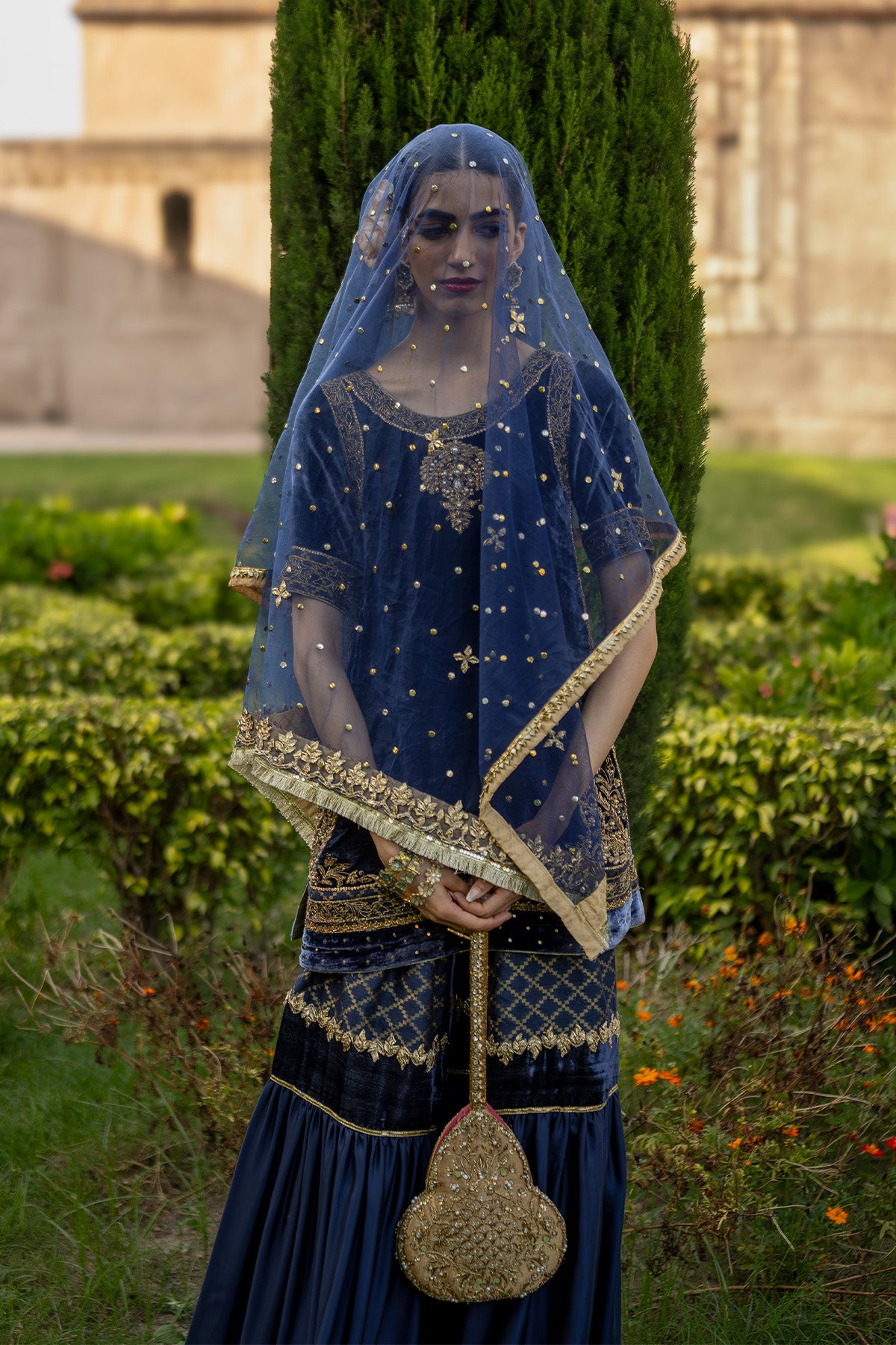 A masterpiece in navy tones , this traditional short velvet shirt with half sleeves is paired with a matching cotton net and satin silk gharara, complemented by a contrasting light blue dupatta. The ensemble is adorned with intricate hand embroidery and detailed dabka work, reflecting the timeless artistry of South Asian craftsmanship. A perfect blend of regal texture, refined detailing, and graceful silhouette. Note: Duppata price is not included.