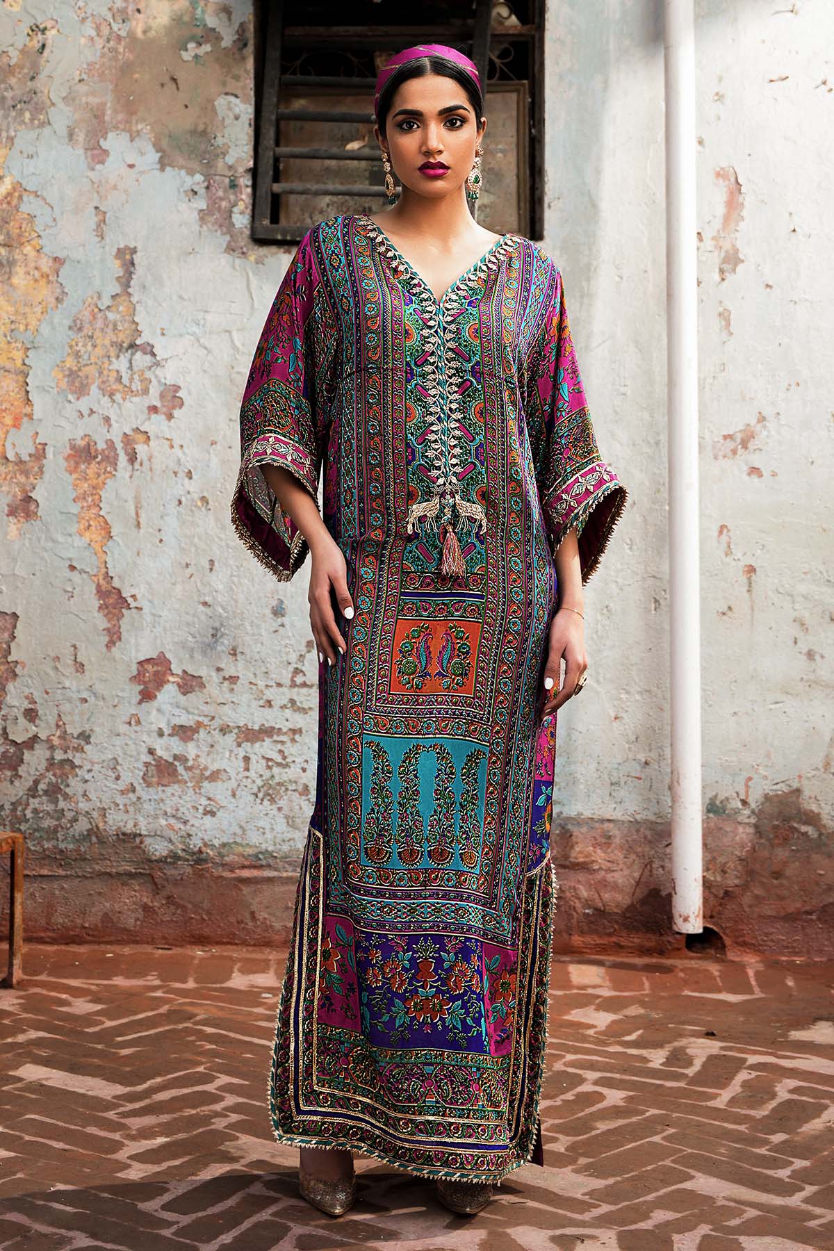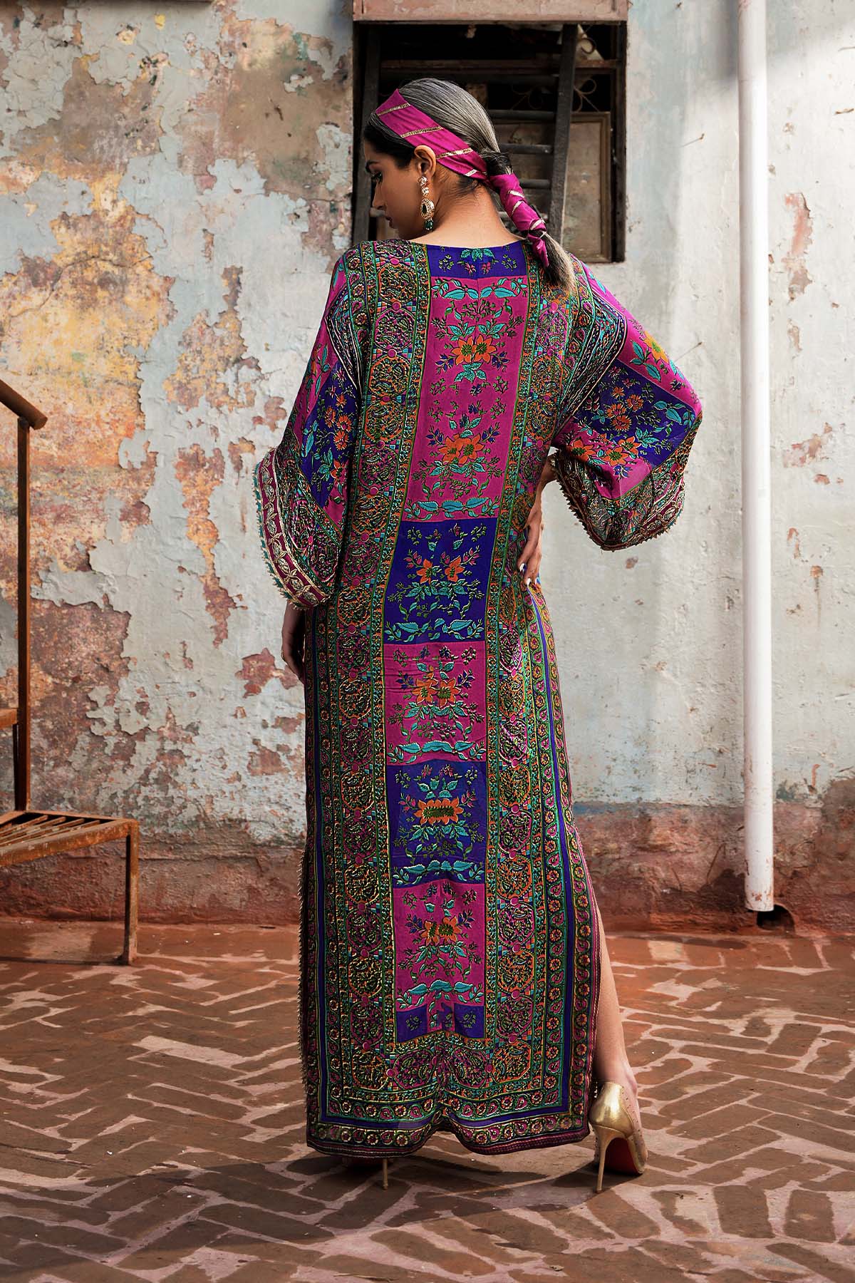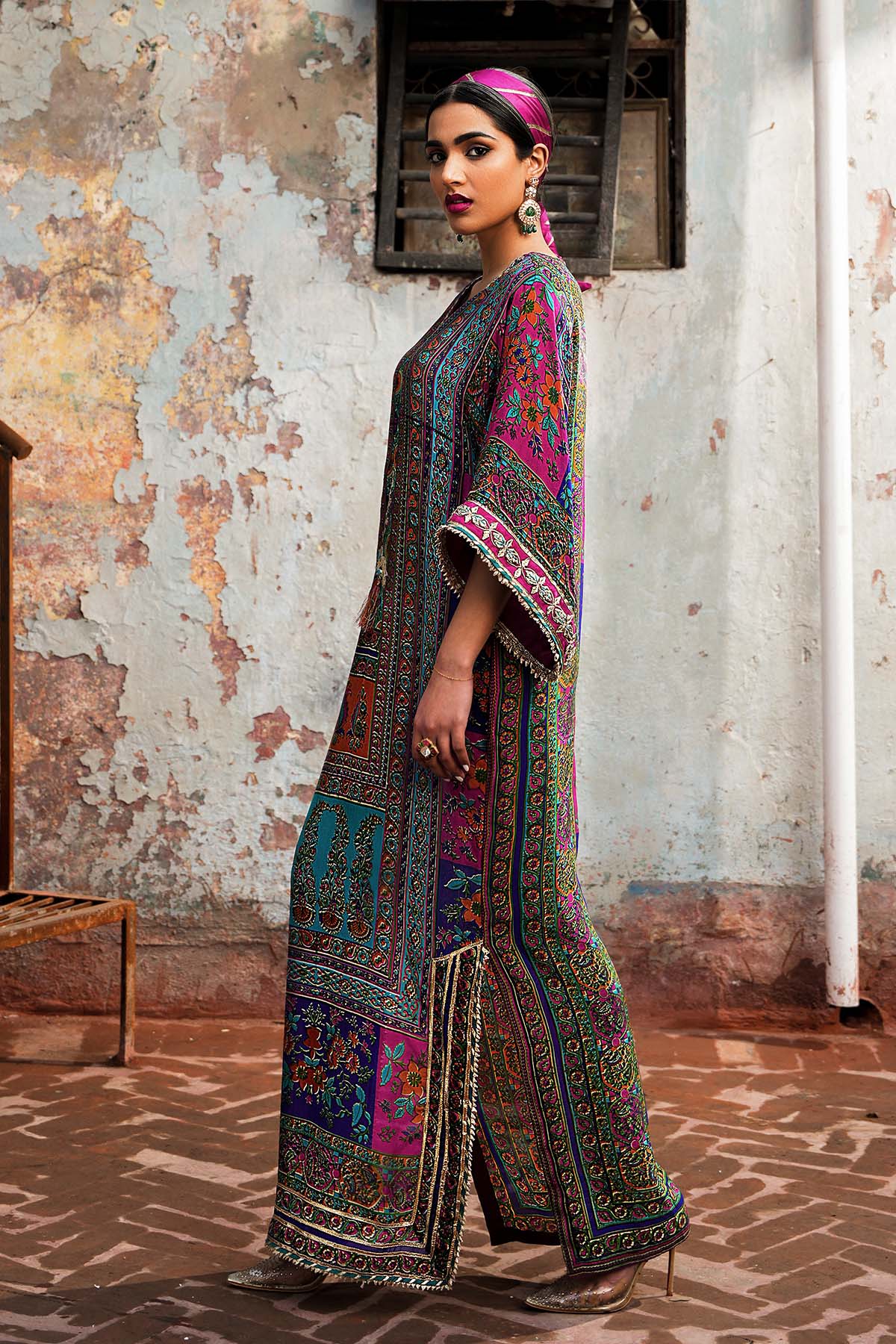 Elevate your style with effortless grace in this stunning long kaftan shirt, featuring flowing kimono sleeves and a mesmerizing array of multi-colored hues. Adorned with intricate gota work on the neckline and sleeves, it's further enhanced by the opulent touch of golden lappa, vibrant green chata patti, and delicate kingree detailing.