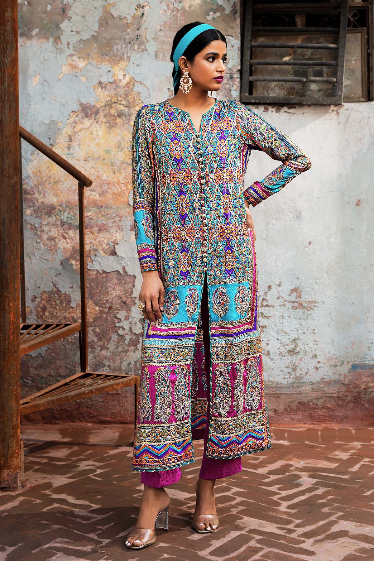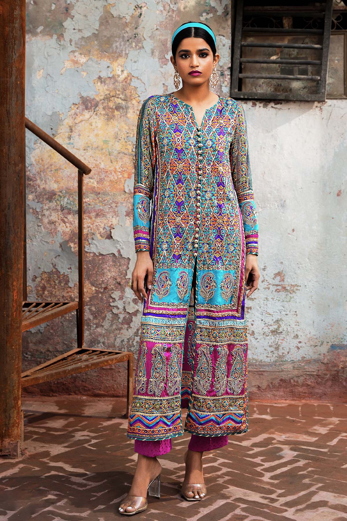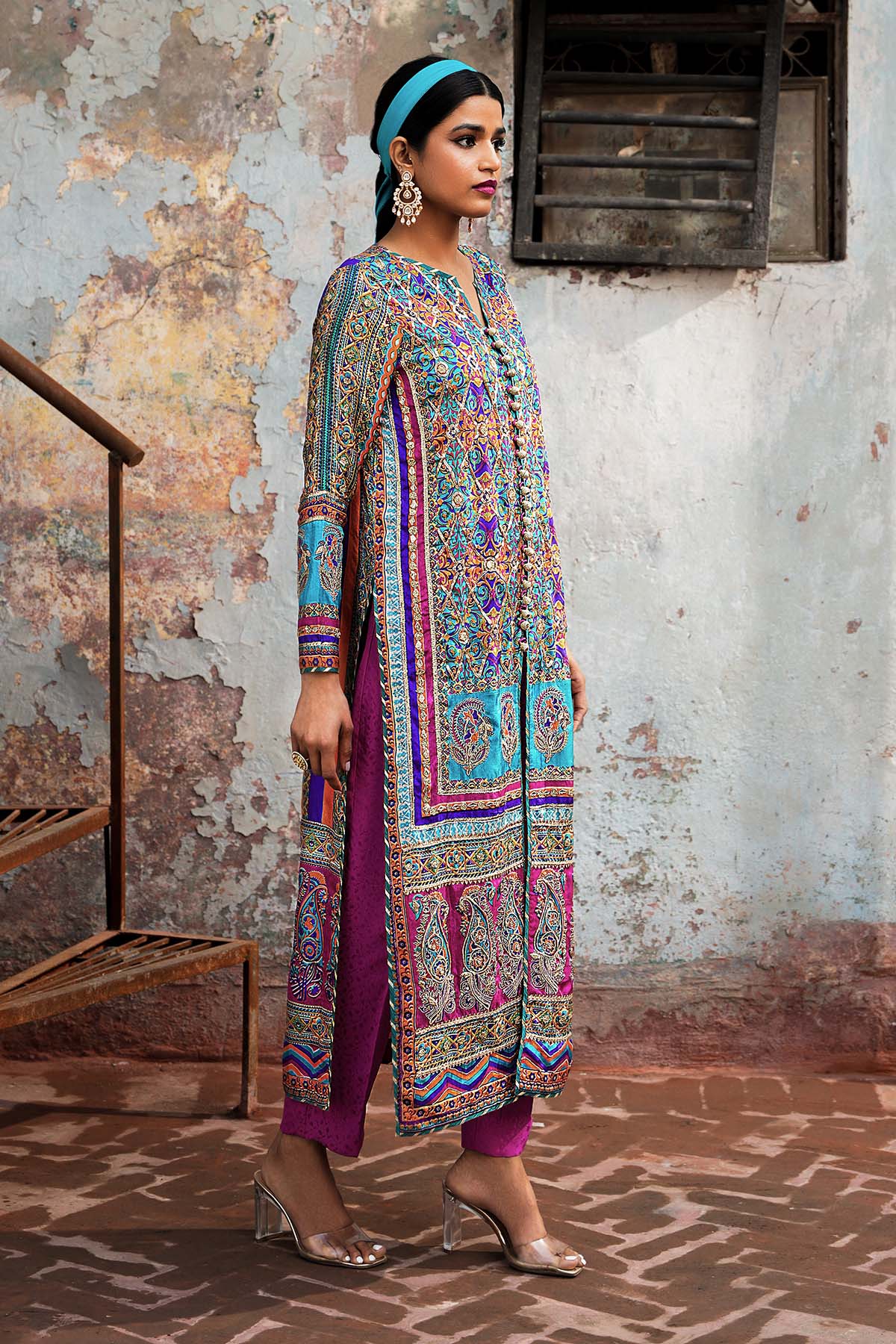 Wrap yourself in opulence with this enchanting long front-open silk jacket, adorned in a kaleidoscope of colors and exquisite craftsmanship. Intricate tilla and gota embroidery intertwine, while hand embellishments of pearl naqshi and dabka add a touch of regal charm. Finished with delicate gota magzi detailing. Paired with sleek silk pants.
