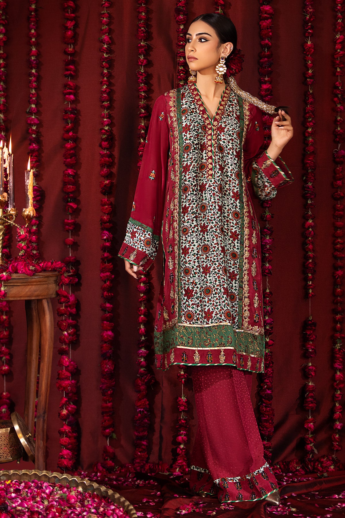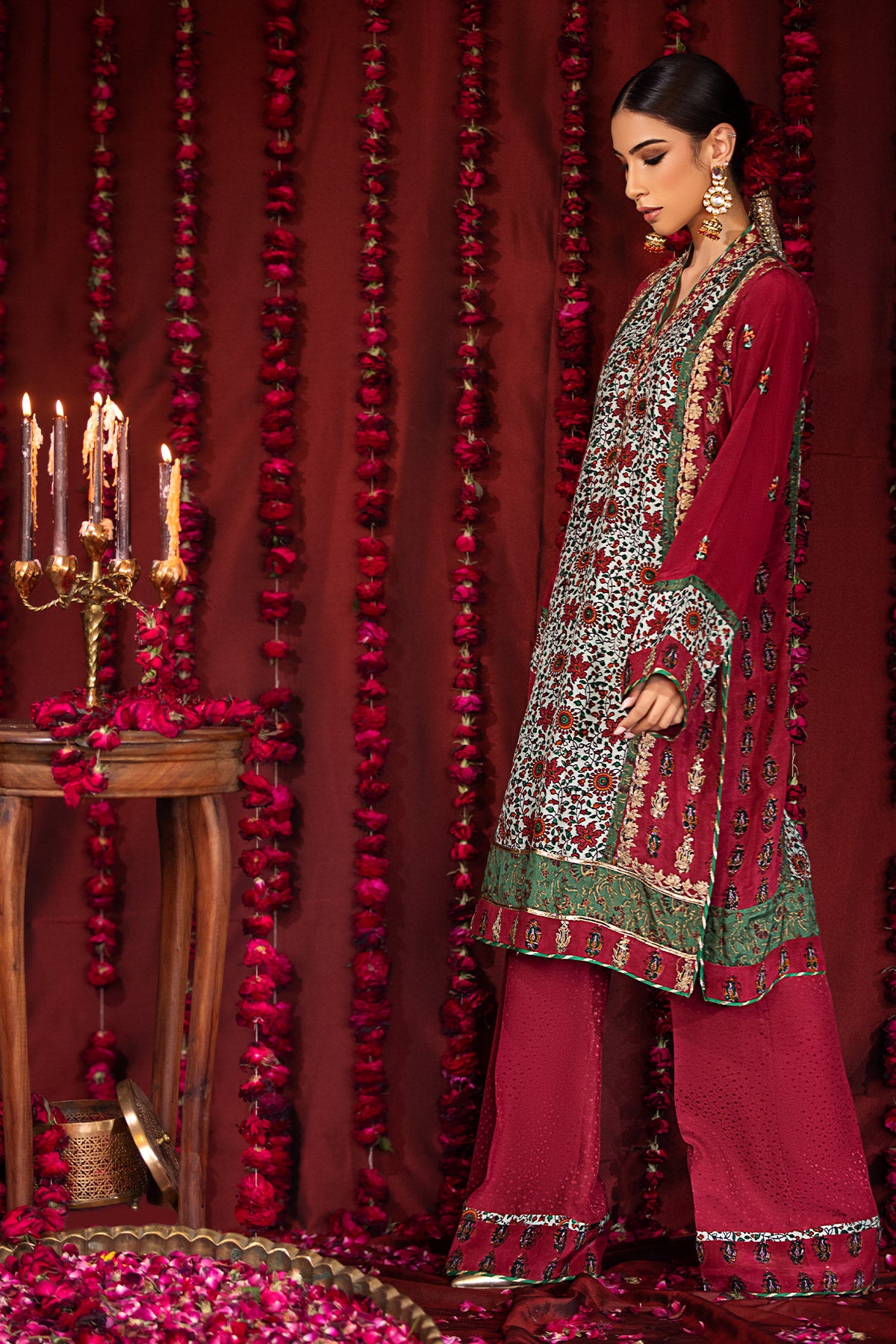 This ferozi and red silk block printed shirt is a true work of art, showcasing the beauty of traditional textiles and craftsmanship. The vibrant colours and intricate block print pattern create a striking contrast that is sure to turn heads. The tilla work on the neckline and side panels adds a touch of glamour and elegance, showcasing the skill and creativity of the artisans who crafted this garment. The shirt is finished with gota magsi, that adds texture and depth to the design. Paird with raw silk pants.