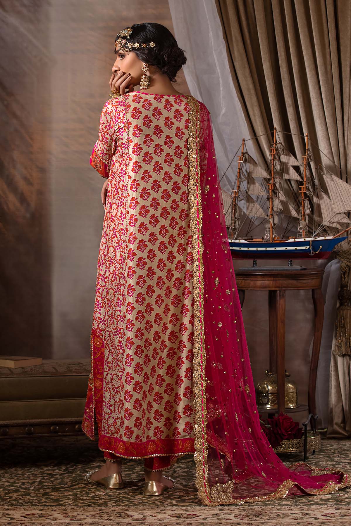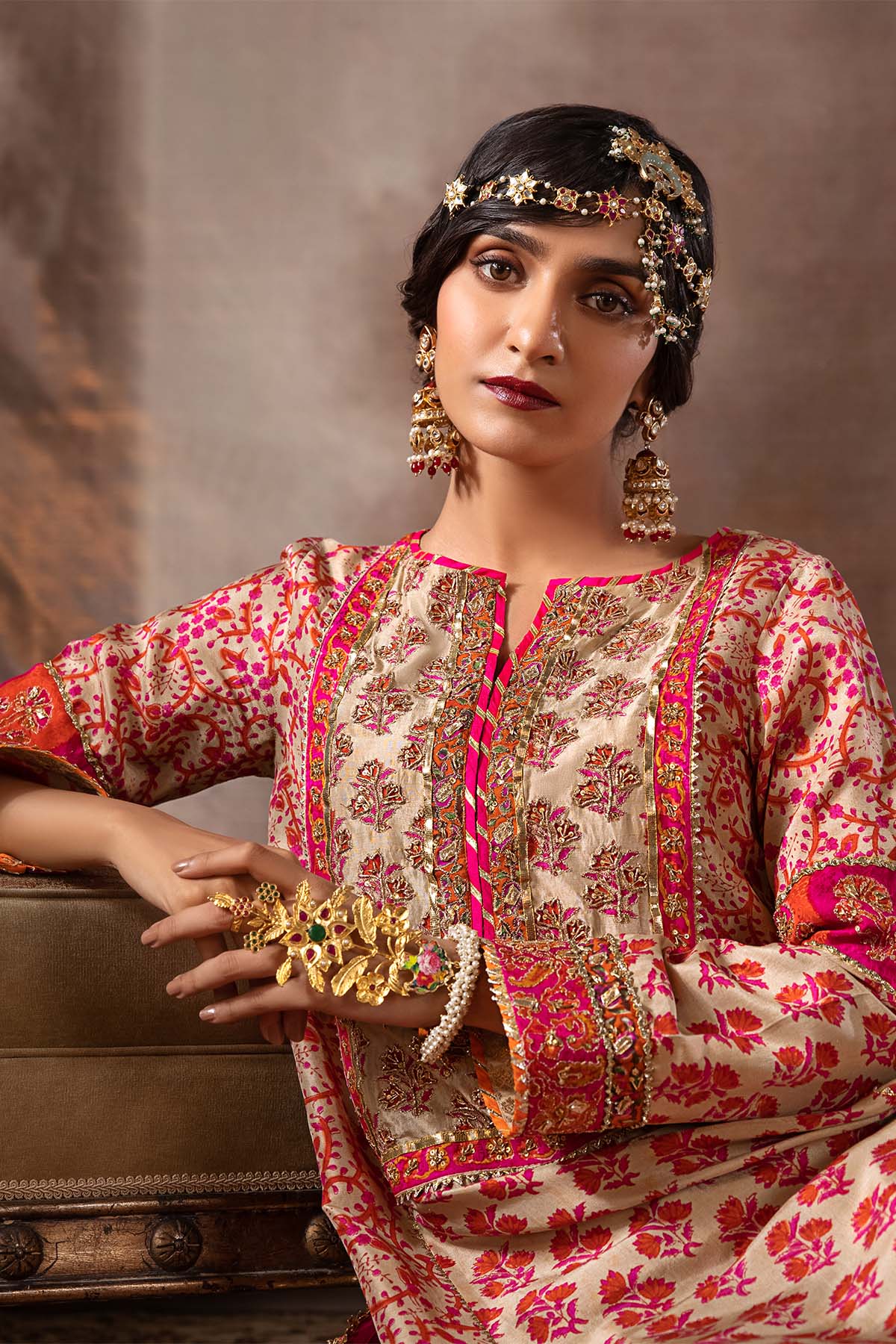 This enchanting pure raw silk long shirt is hand block printed top to bottom in a delightful pistachio green and hot pink combination. The shirt is furthr enhanced with embeslihsments of delicate dabka, luminous gotta, and sparkling stones, adding a touch of regal opulence to the ensemble. Paired with hot pink embossed silk pants.